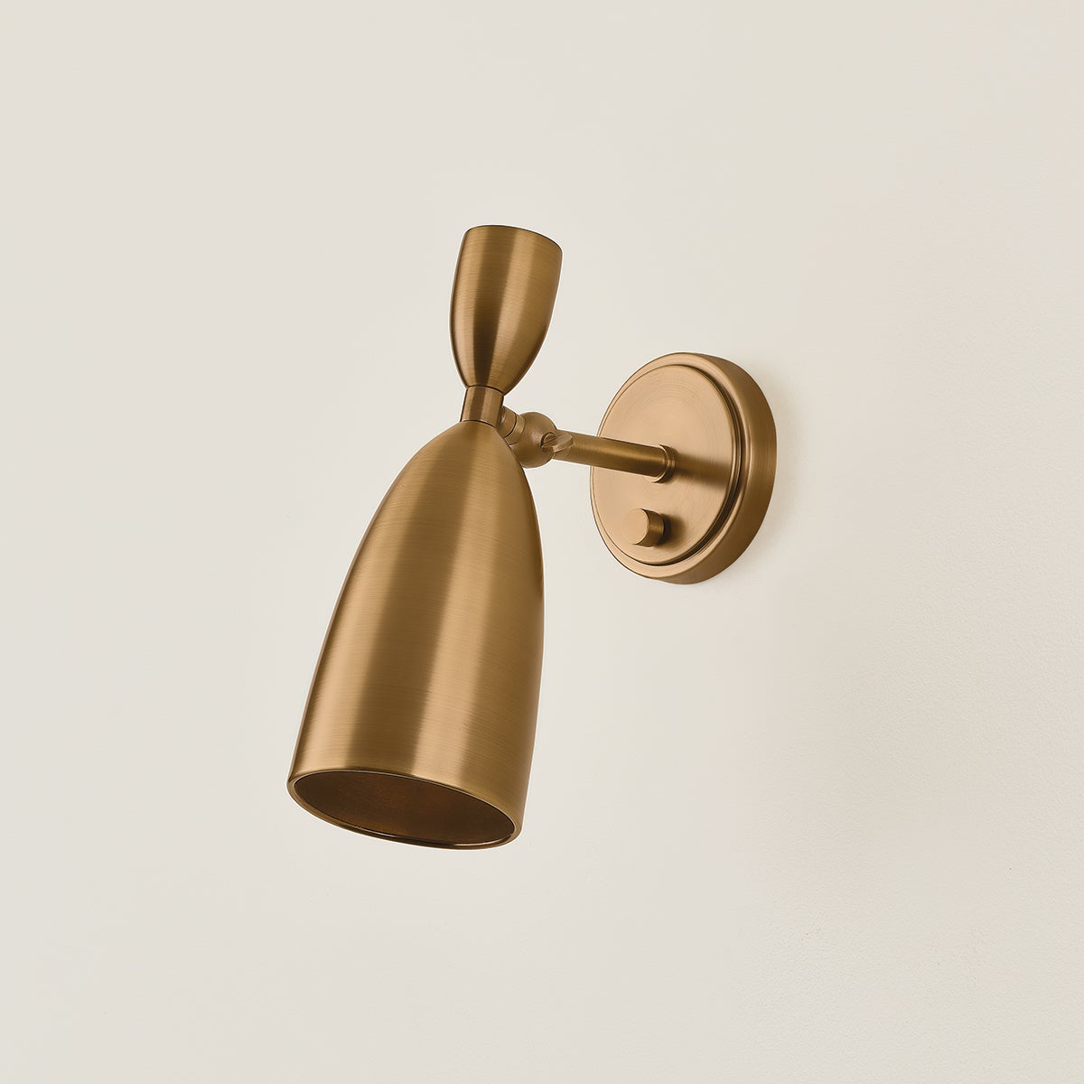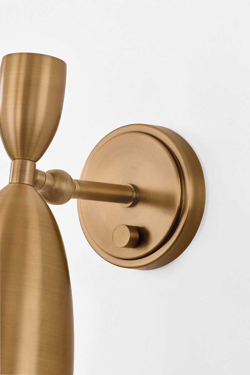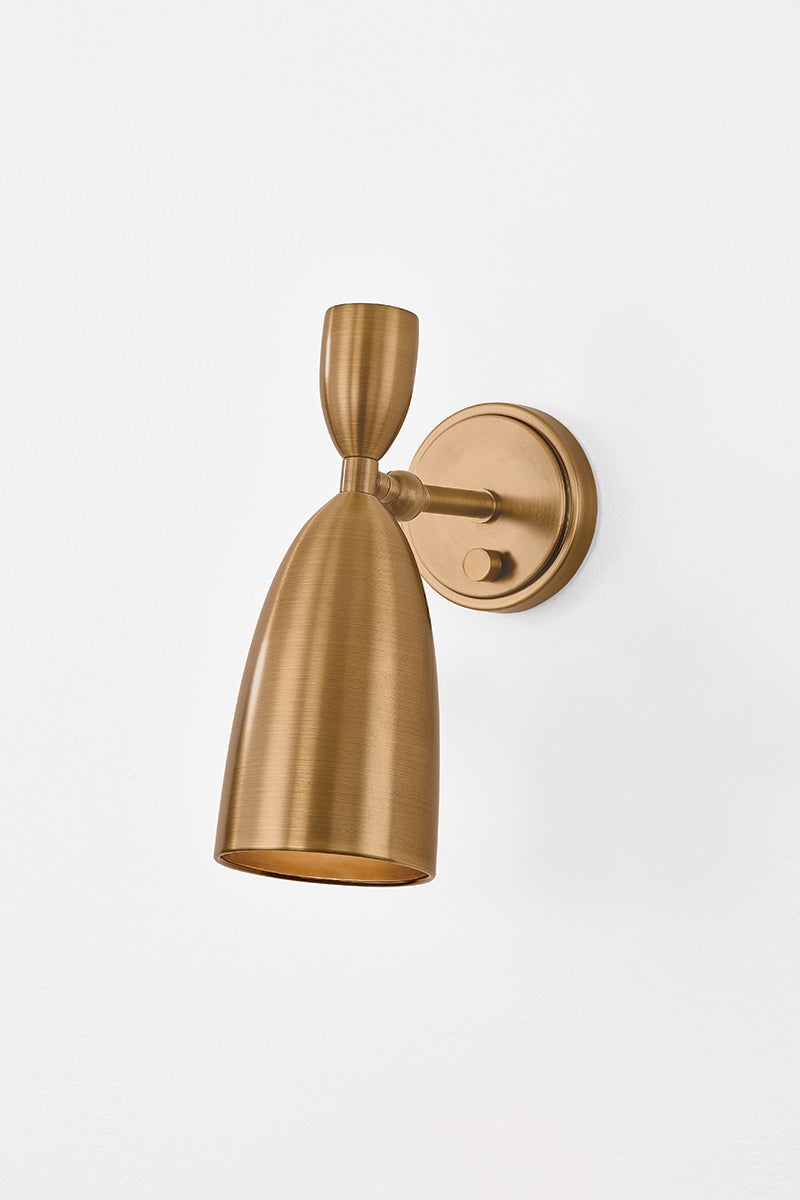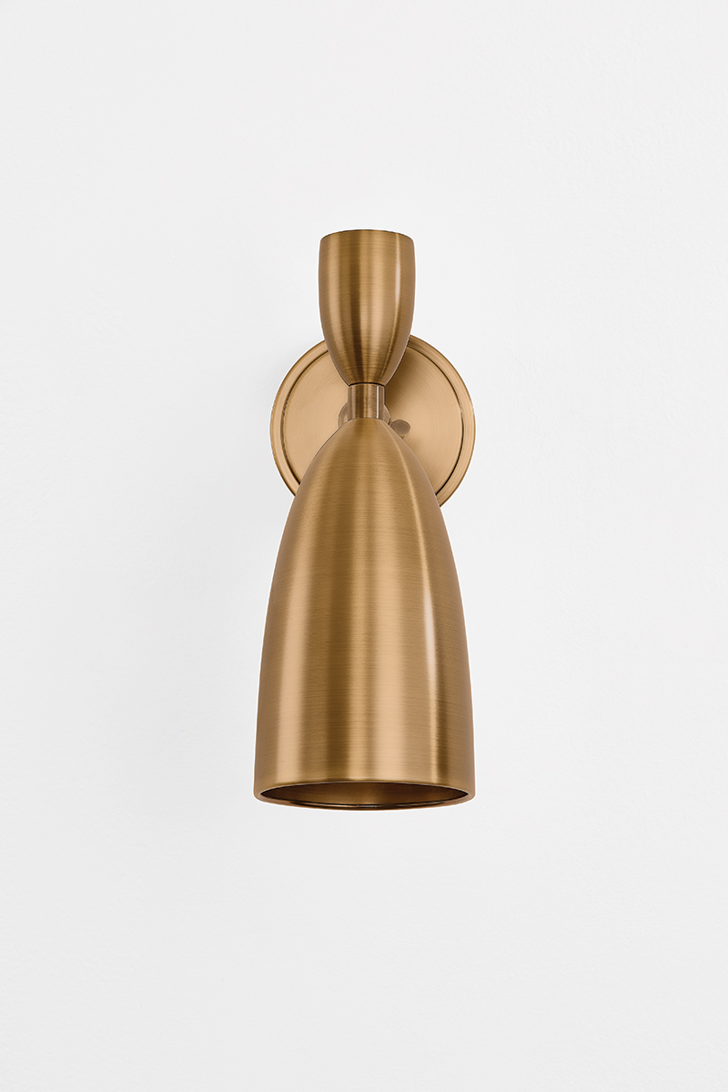 The Spade family offers a modern take on the Italian Stilnovo style. A classic tapered cone profile is softened to a pointed dome to create a modern, functional shade. Captured by a pivot, it can be directed to allow customized spot lighting wherever needed. The refined Patina Brass metalwork adds an antique note to the fixtures. Spade is available as a 1-light sconce or 5-light chandelier.