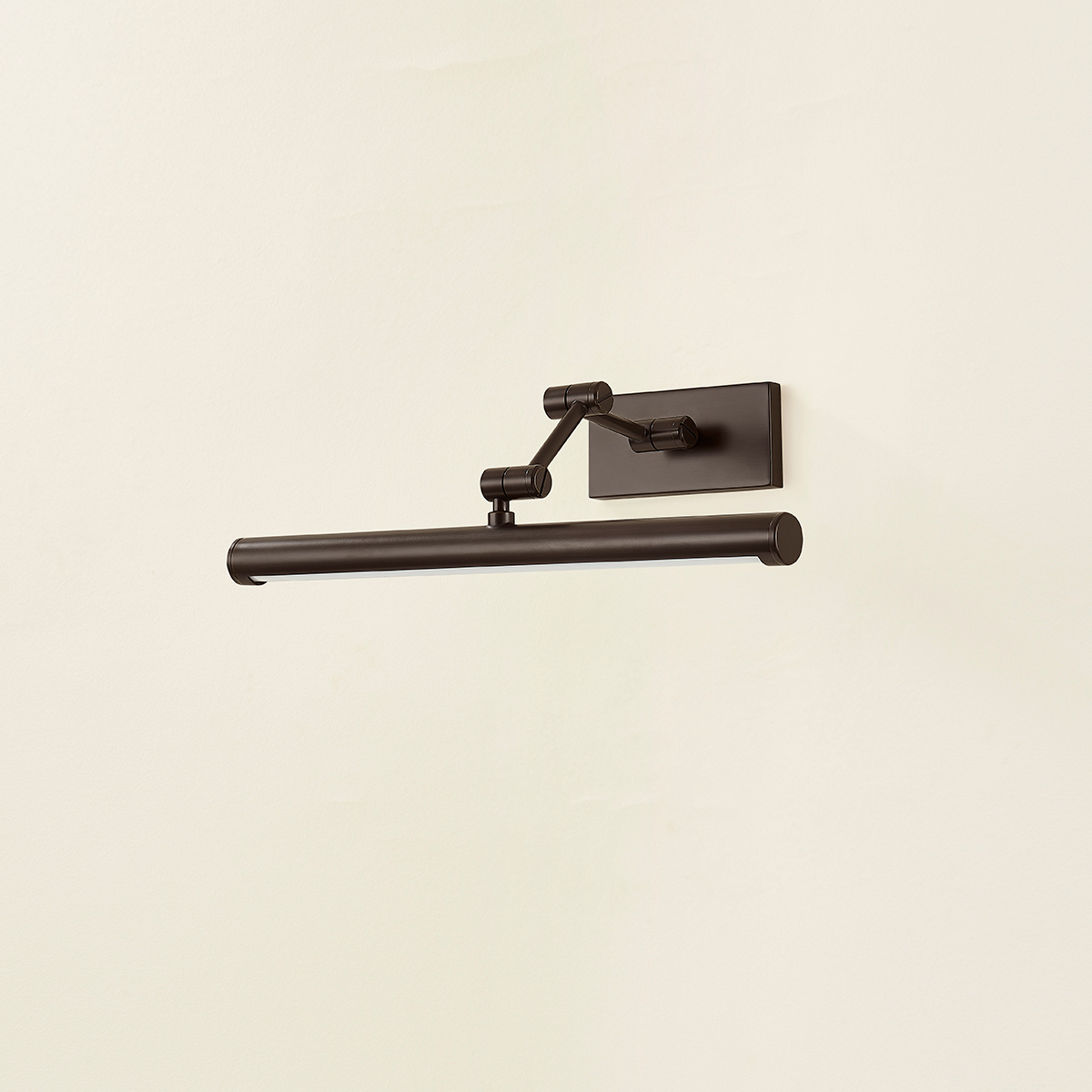 The industrial-inspired Isaac features an elongated, tubular head and thoughtfully designed hardware details. With integrated LED and three pivot points, this picture light ensures both high efficiency and adjustability. The slim silhouette enhances a space without distracting from your artwork. Isaac is available in two sizes and two finishes, Patina Brass and Bronze.