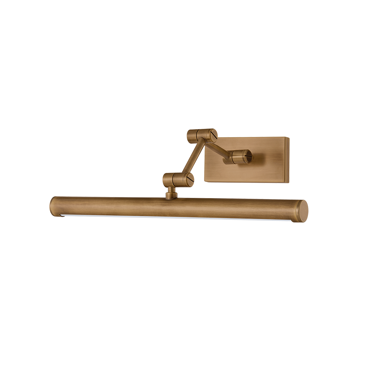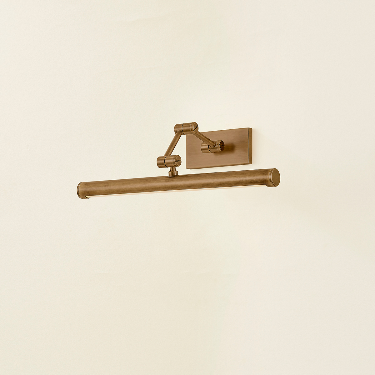 The industrial-inspired Isaac features an elongated, tubular head and thoughtfully designed hardware details. With integrated LED and three pivot points, this picture light ensures both high efficiency and adjustability. The slim silhouette enhances a space without distracting from your artwork. Isaac is available in two sizes and two finishes, Patina Brass and Bronze.