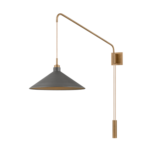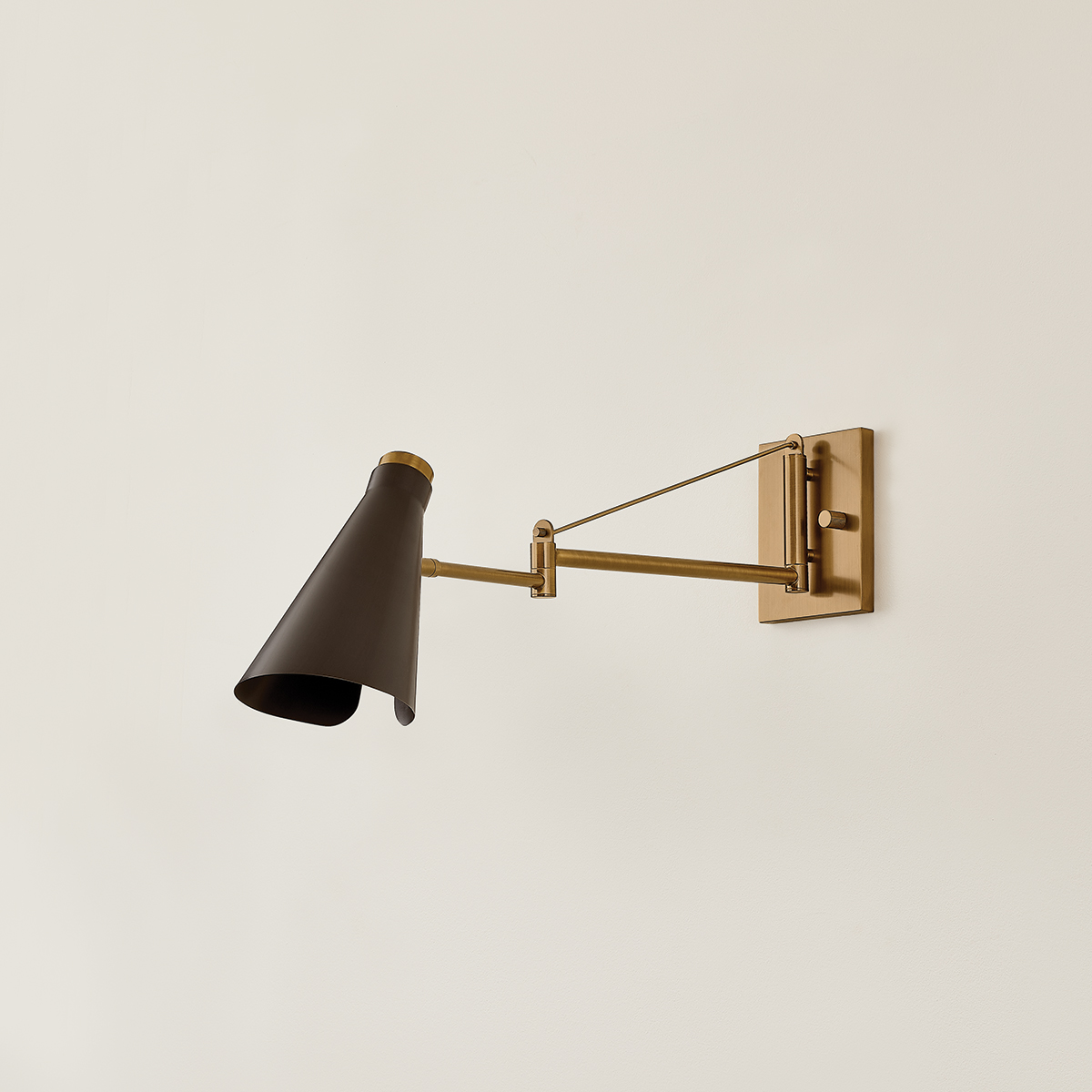 Inspired by the mid-century designs of Serge Mouille, this industrial-style family makes a statement with its sprawling yet delicate arms. Each shade features a slot for the arm to pass through, partially exposing the bulb. A mix of Patina Brass and Bronze finishes adds a sense of depth to the modern style of these fixtures. While the 1-light sconce features an adjustable arm, the 3 and 5-light chandeliers are cantilevered and reinforced by wire braces.