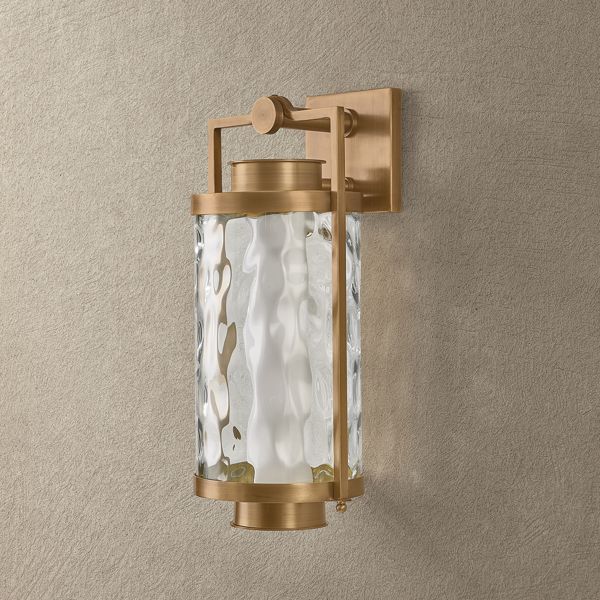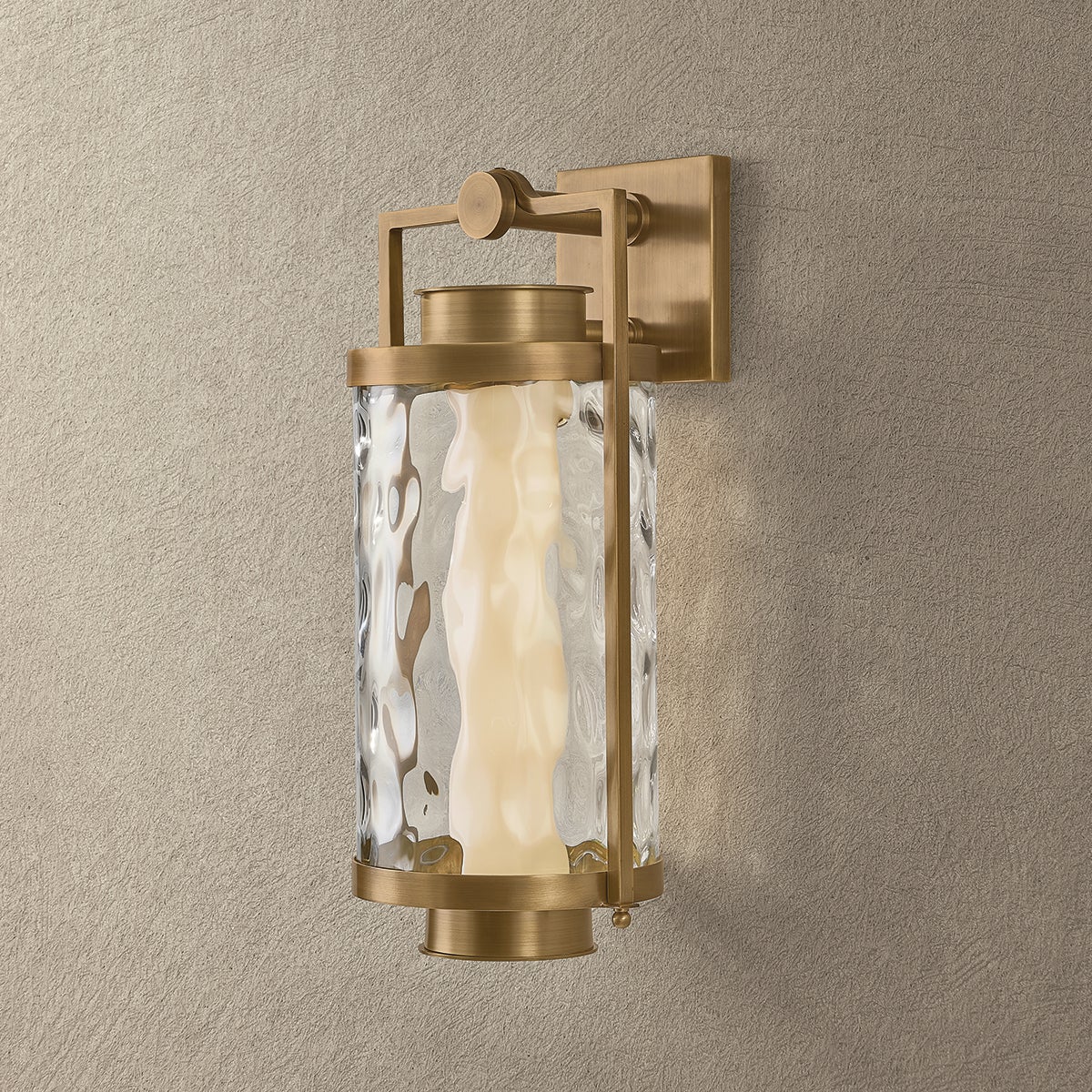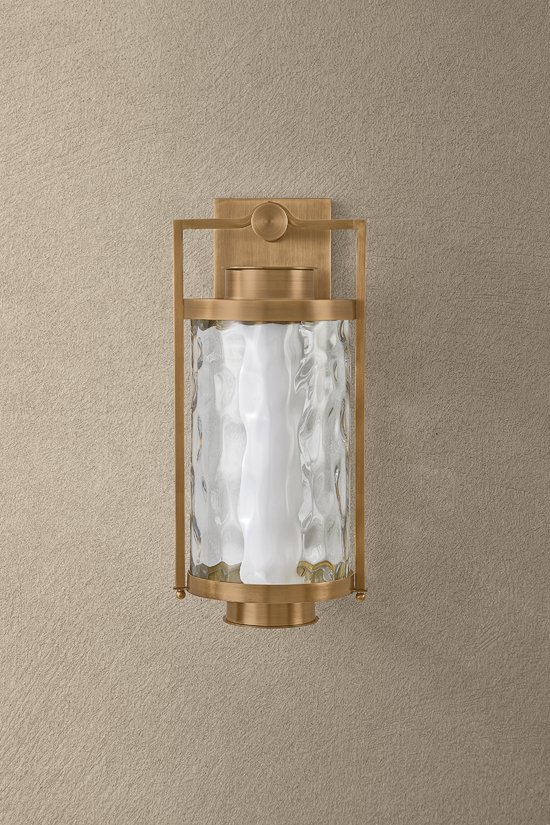 A modern, pared-back take on a traditional lantern, Haddock combines architectural stature with artisanal materials. A solid brass frame with a Patina Brass finish provides durable support for the curved, wavy glass panel. The hammered effect of the clear glass softens the LED illumination, eliminating glare at night. Haddock is available in three sizes to suit any outdoor area.