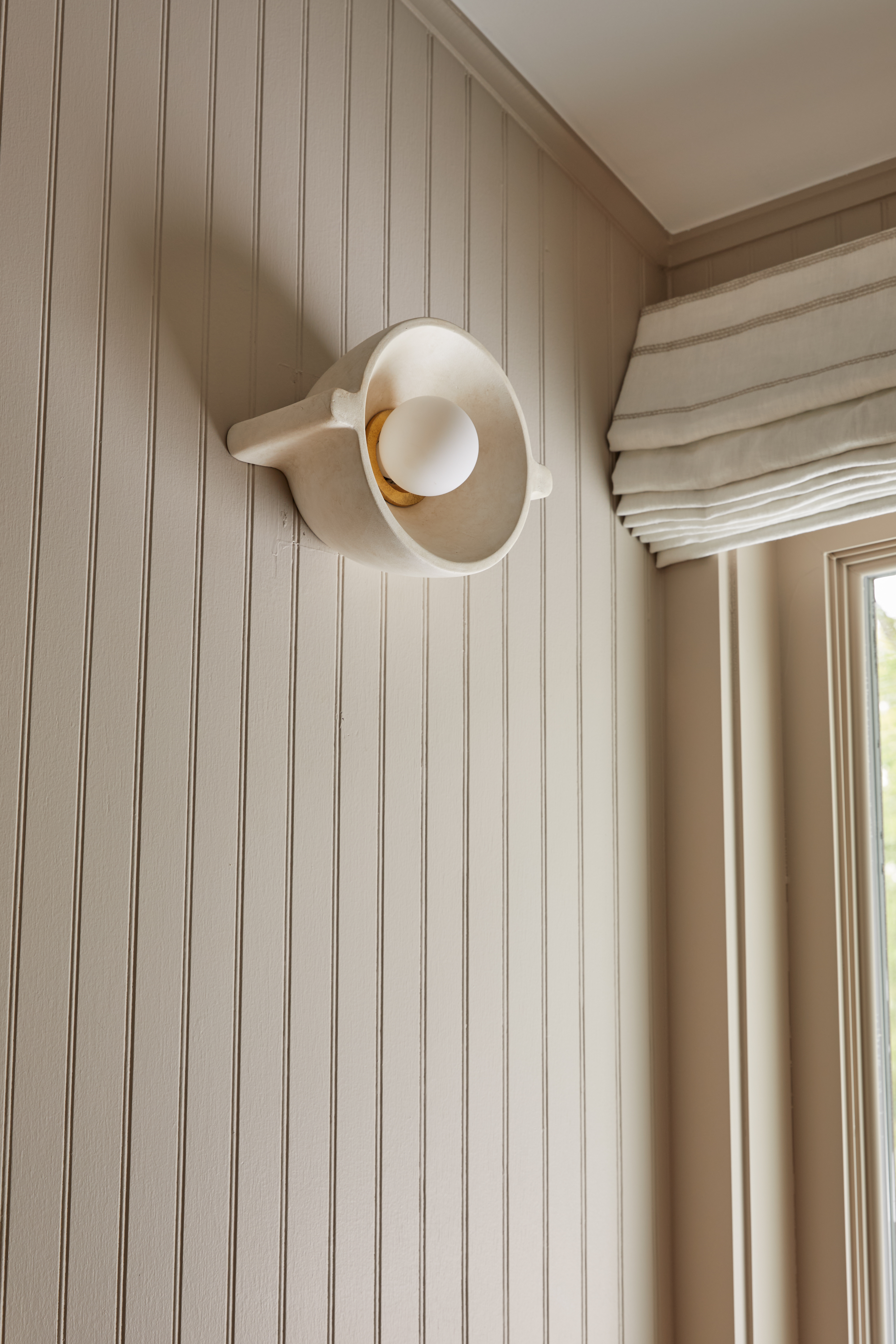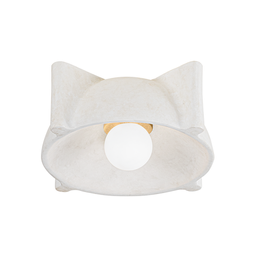 Inspired by nautical lighting, Modesto blends clean modern styling with warm, natural materials. A finned dome-shaped shade in Fossil White Ceramic finish gives the fixture a textured, weathered look. Minimal Vintage Gold Leaf hardware details add just a hint of shine. Available as both a wall sconce and flush mount.