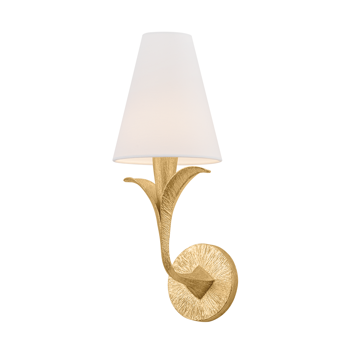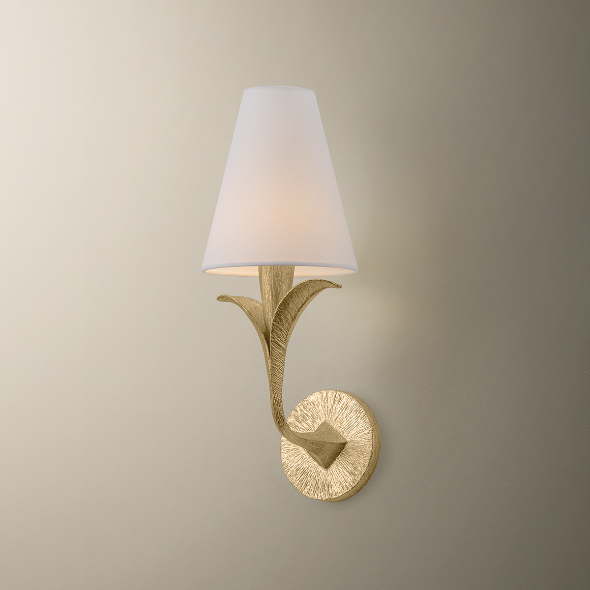 Equally captivating with or without the white linen shades, Quill blooms with botanical inspiration. Using dynamic shaping, it creates eye-catching statement pieces with curved armatures and leaf-like bobeche details. A Gilded Ivory finish lends a delicacy to the design. Available as a 1-light sconce and 6- and 8-light chandelier.