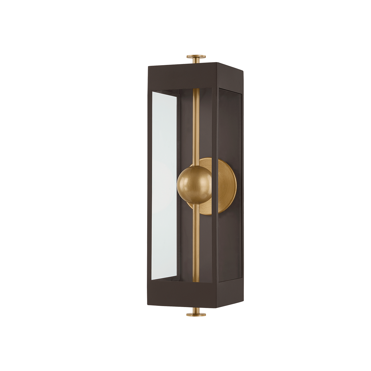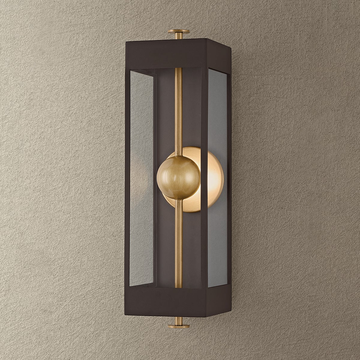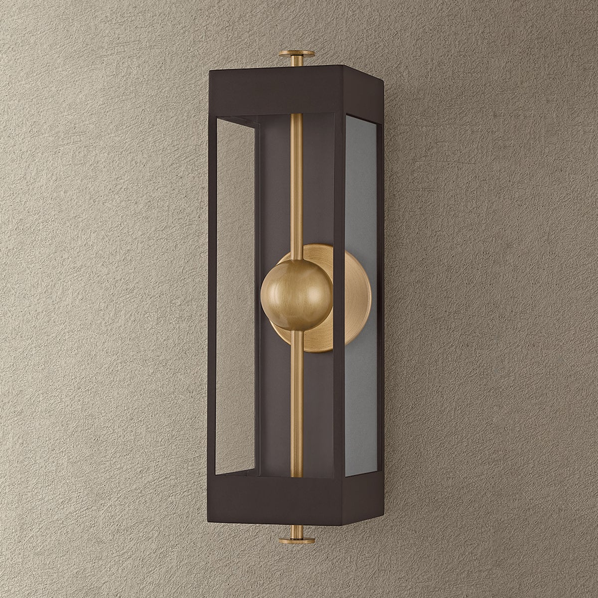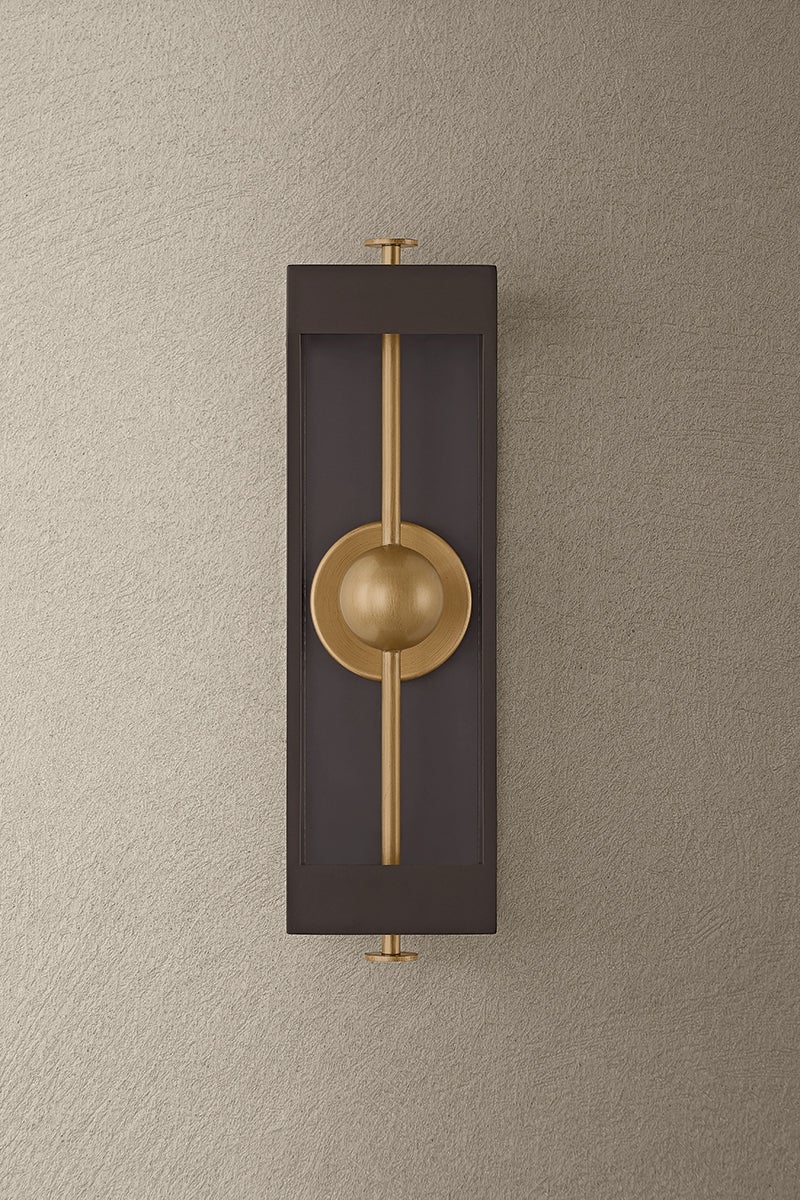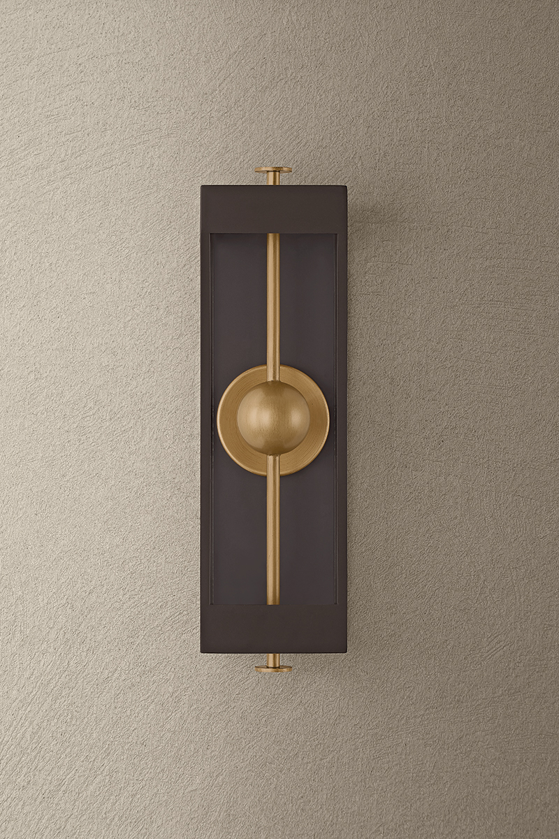 The Garvey sconce reimagines a traditional box lantern with a modern, artistic twist. A rod pierces vertically through the design, suspending a central bead that houses the LED light source. Behind it, a reflective panel amplifies the glow while adding a contemporary dimension. The interplay of the contrasting Textured Bronze and Patina Brass finishes creates visual depth. Available in three sizes.