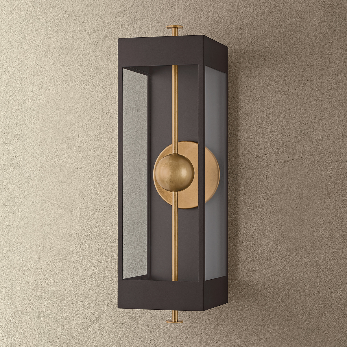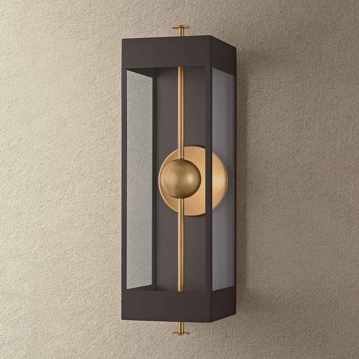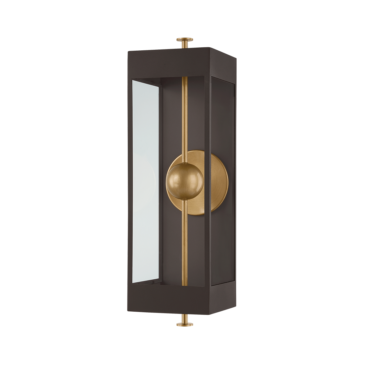The Garvey sconce reimagines a traditional box lantern with a modern, artistic twist. A rod pierces vertically through the design, suspending a central bead that houses the LED light source. Behind it, a reflective panel amplifies the glow while adding a contemporary dimension. The interplay of the contrasting Textured Bronze and Patina Brass finishes creates visual depth. Available in three sizes.