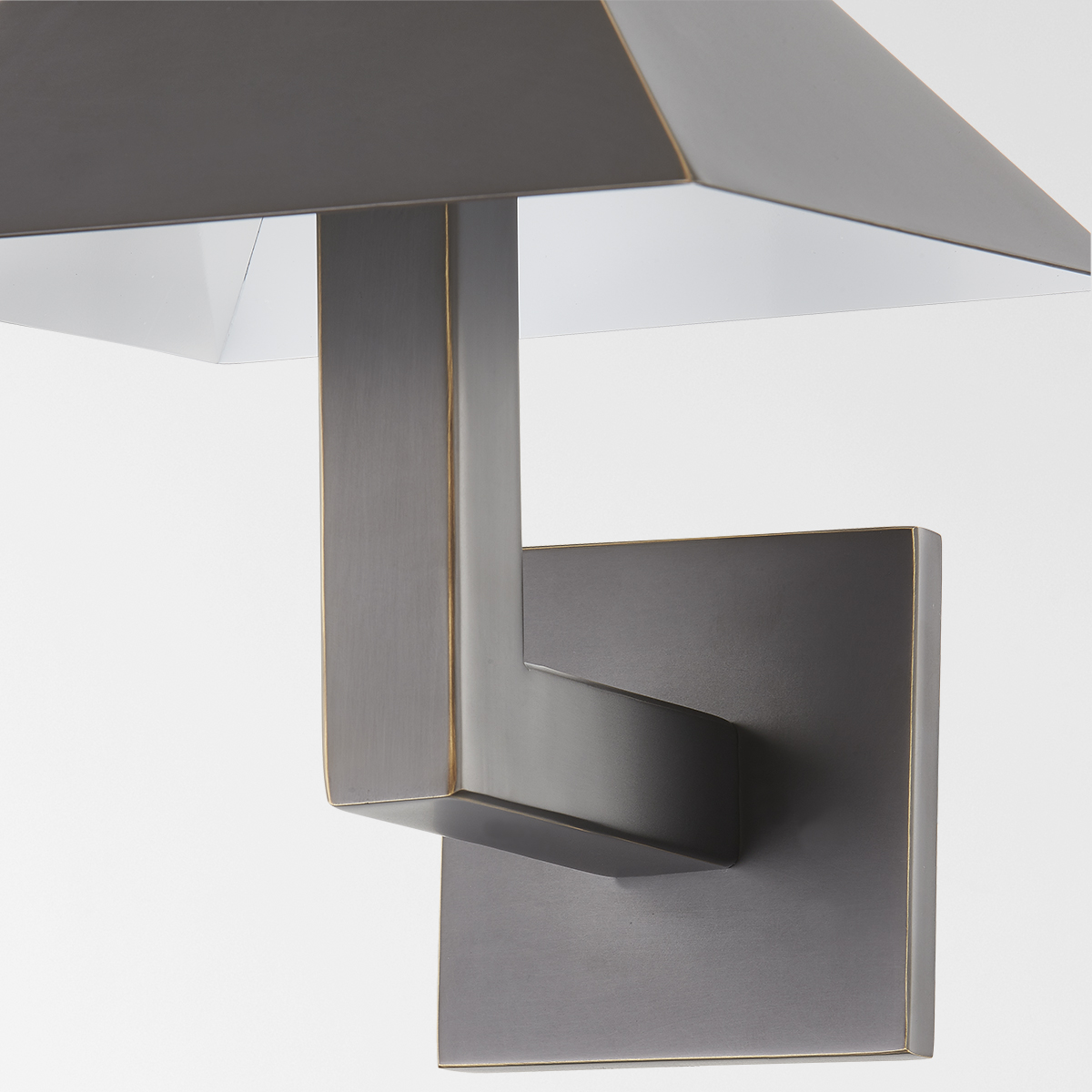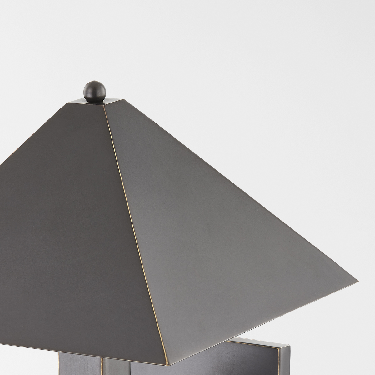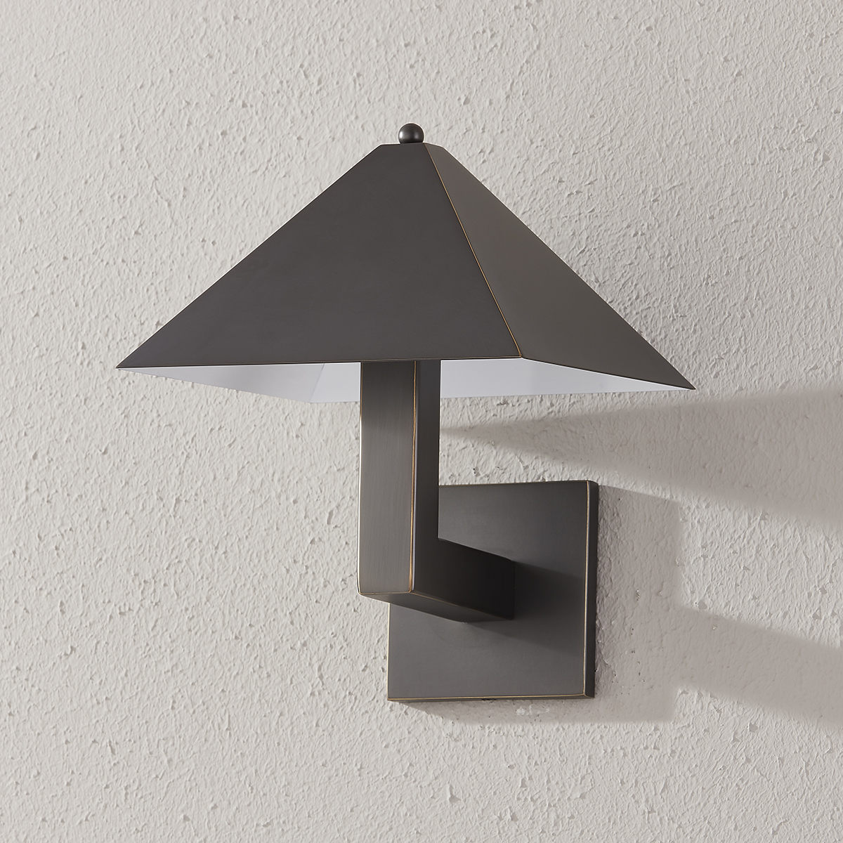 A pyramid-shaped metal shade rests atop a thick square arm that extends into a square backplate, giving Knight a modern industrial aesthetic. A small, circular finial brings a touch of softness to this stately sconce. Available in Patina Brass and Bronze.