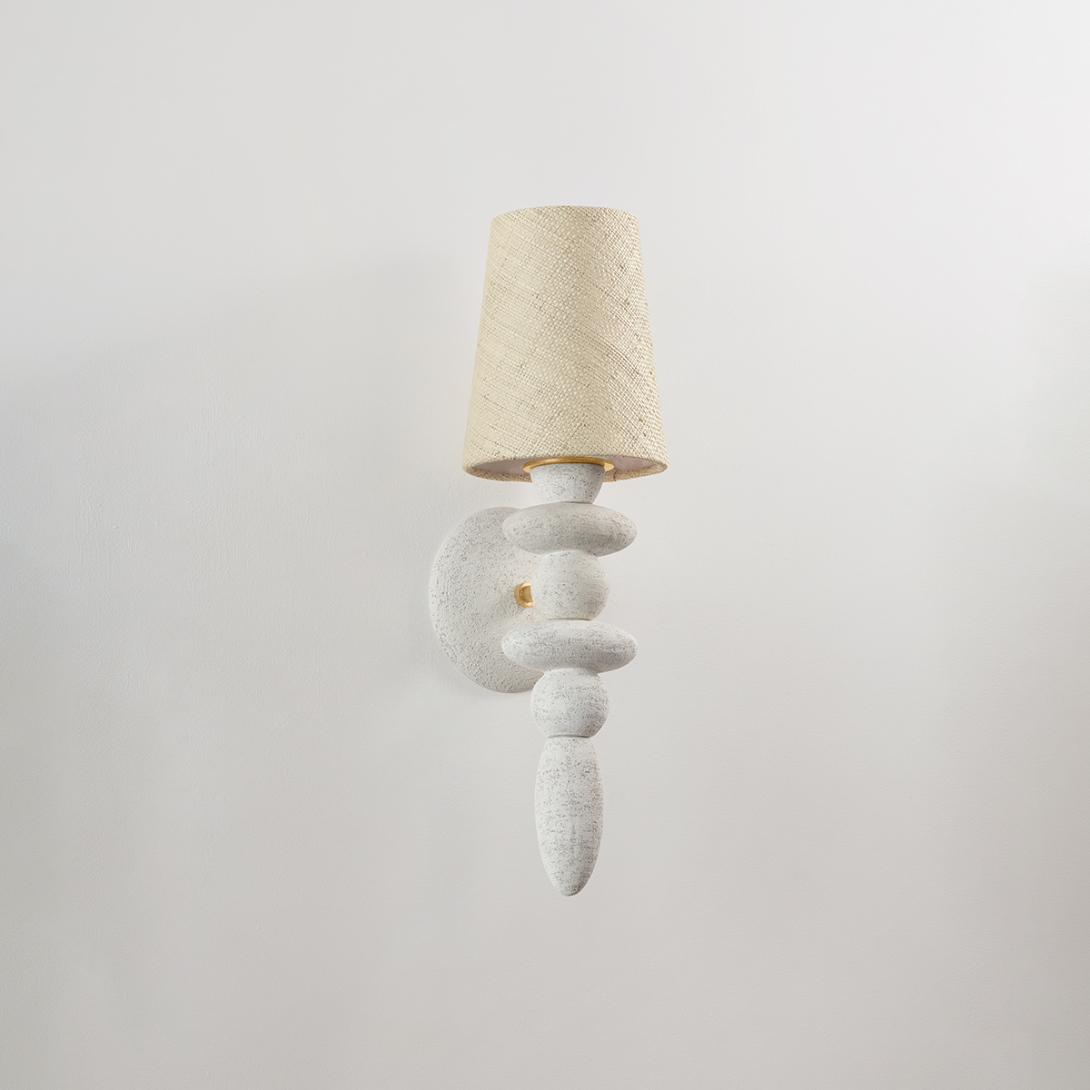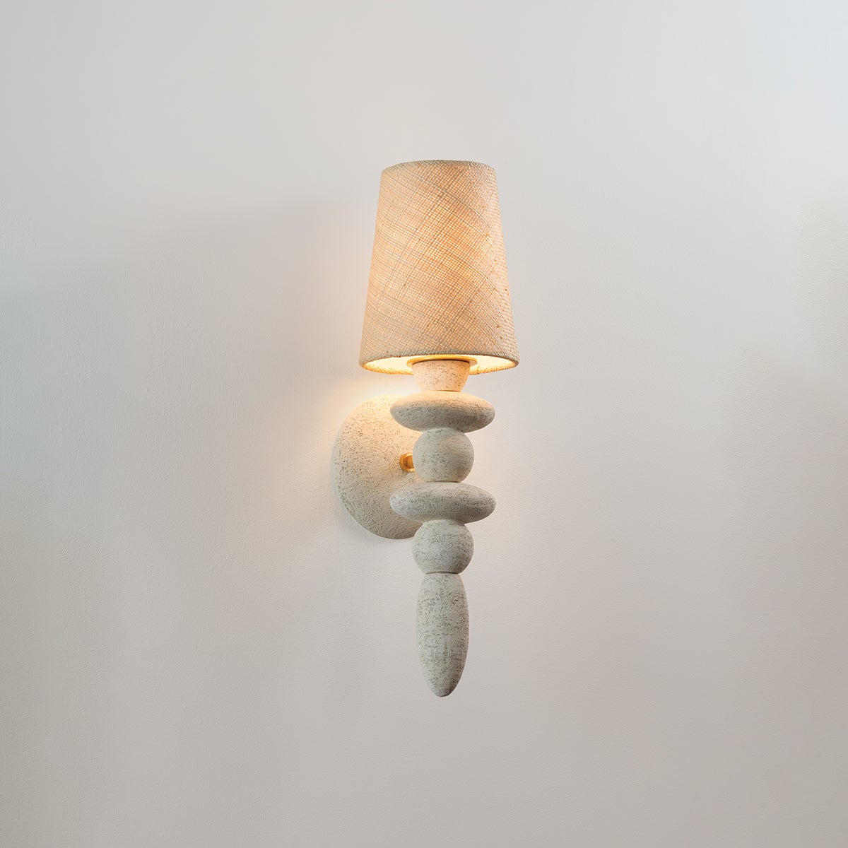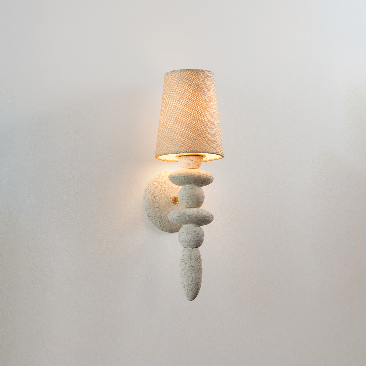 Based on a sketch by Chandler McLellan, the Cullen family explores silhouettes inspired by the beauty of Scottish dry stone construction. The dry stone technique appears rugged, yet it requires a precise understanding of balance. To give the Cullen floor lamp this sense of organic tension, some of the ‘stones’ are intentionally placed off-center. The elongated totemic profile of the sconce is framed by a metal circular backplate, adding an element of contrast to the monolithic design. Part of our Chandler McLellan collection.