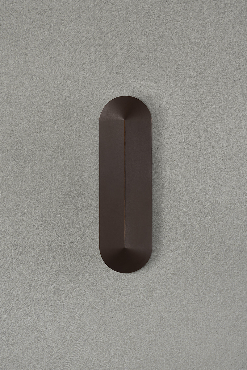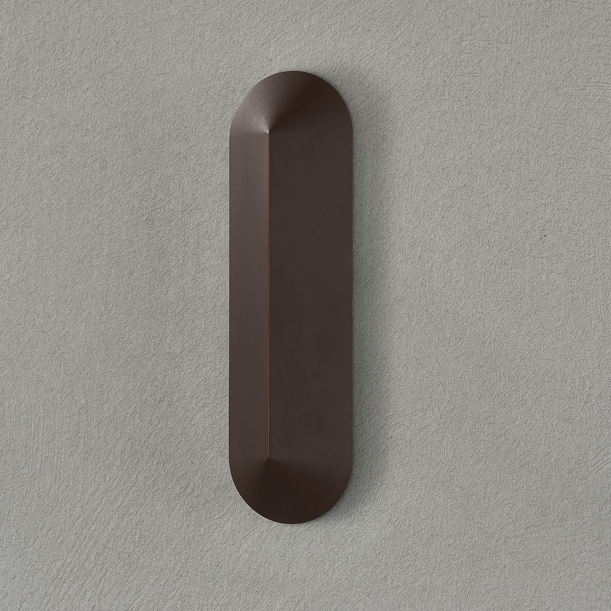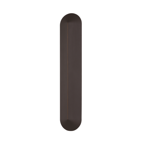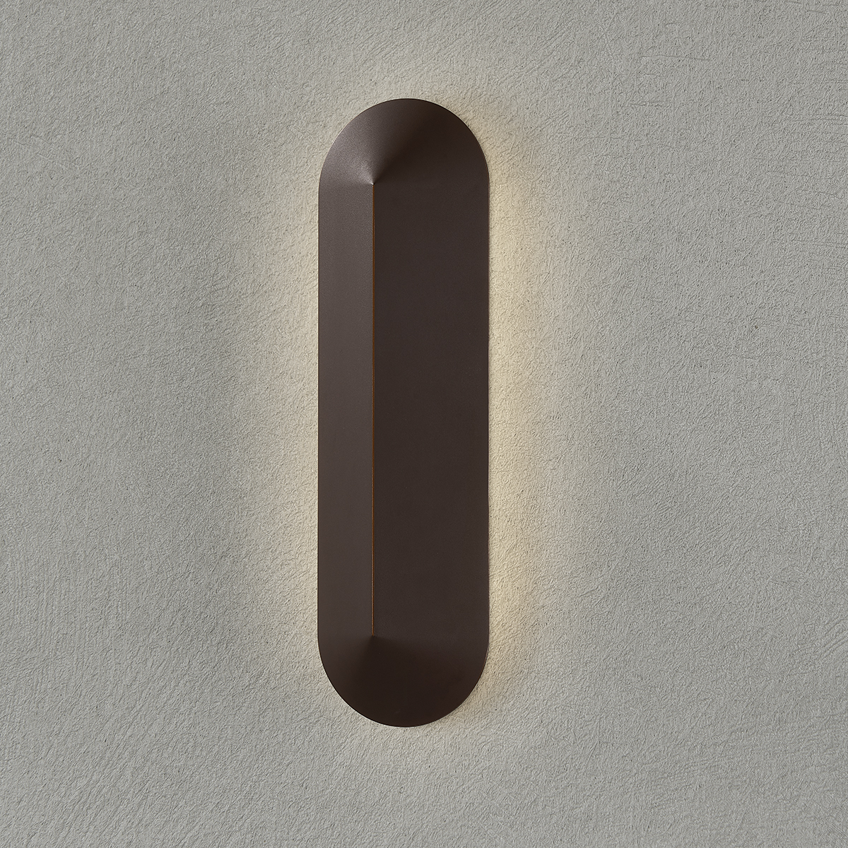 Adapting a modern, tapered racetrack design to an exterior sconce, Ronan is an ellipse of style and substance. The elongated, rounded shape is accented by a thin, raised centerline, revealing a warm coppery undertone beneath the Textured Bronze finish. The metal silhouette shields visibility of the canopy and LED strip, creating a warm wall wash that illuminates the dark nights.