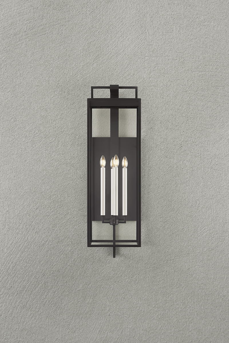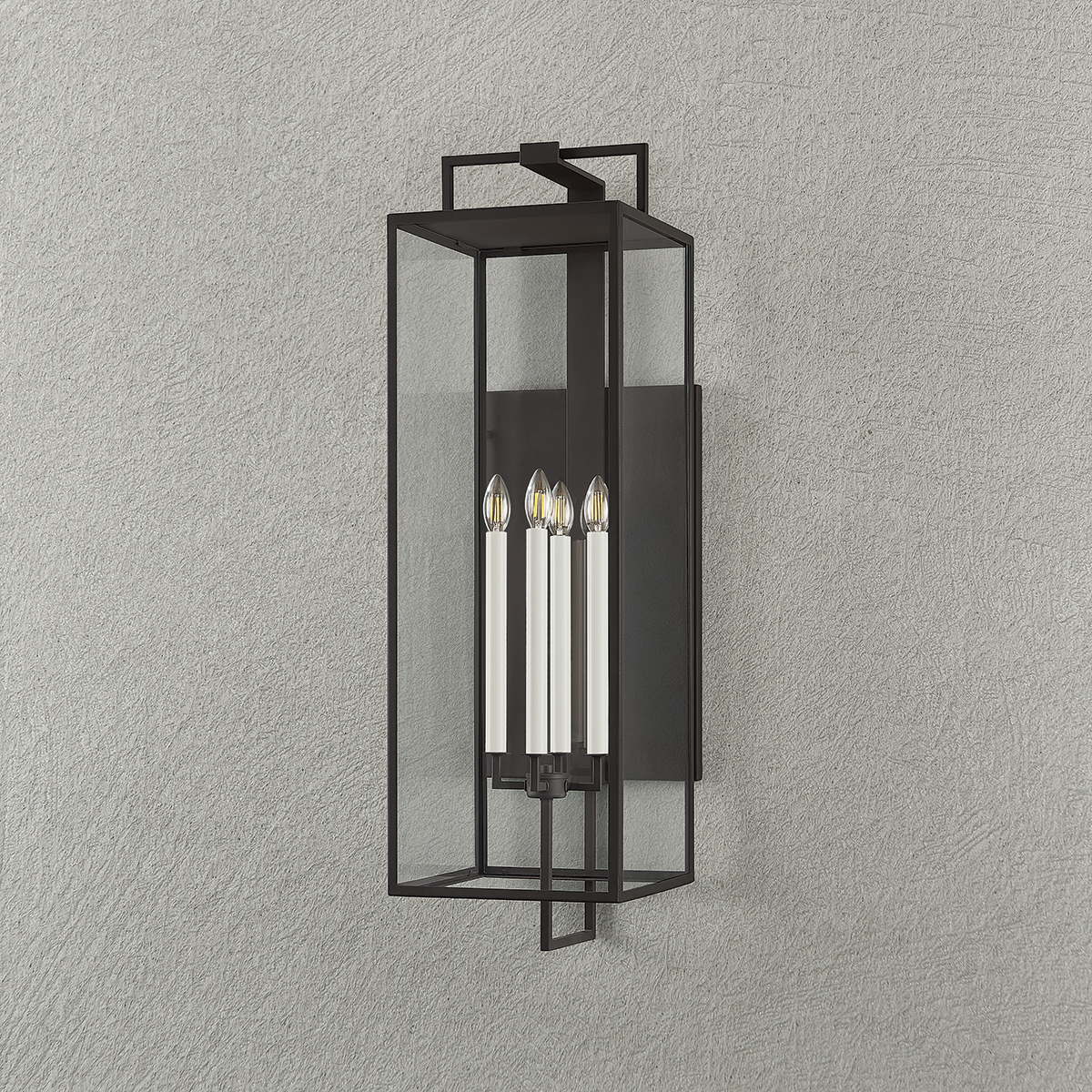Designed for the exteriors of large-scale homes, the Beckham sconce takes the form of a classic box lantern with a modern, elongated silhouette. Within the frame, two or four cream candles emit ambient light in all directions. Available in either a Forged Iron or Textured Bronze finish, Beckham blends sleek geometry with old-world charm.