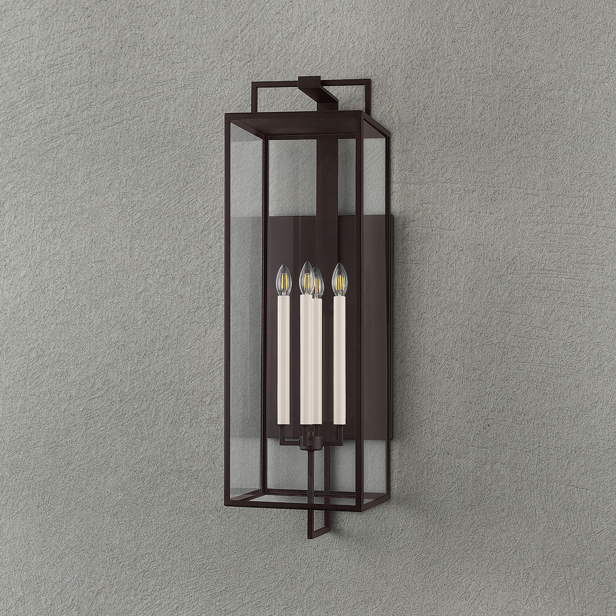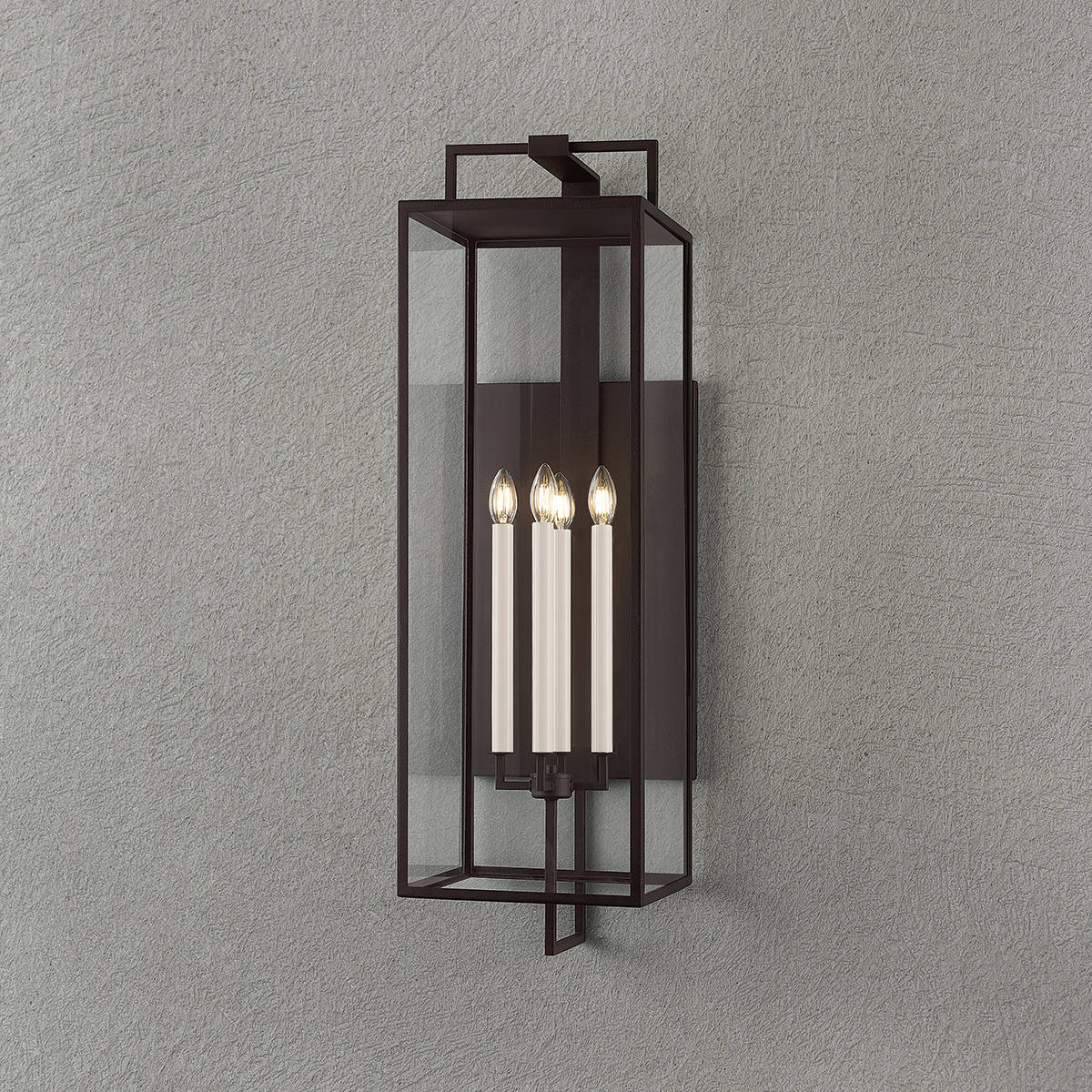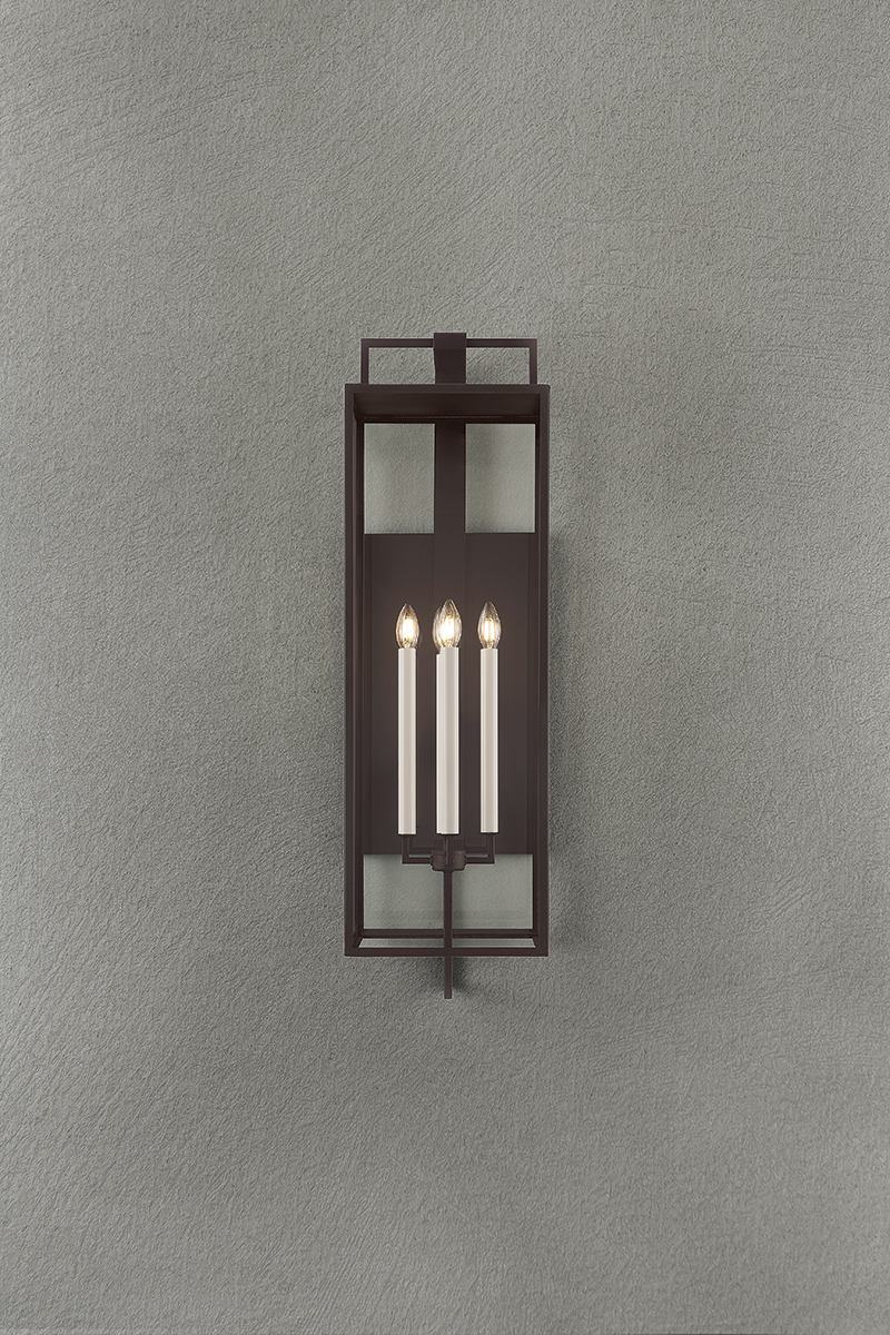 Designed for the exteriors of large-scale homes, the Beckham sconce takes the form of a classic box lantern with a modern, elongated silhouette. Within the frame, two or four cream candles emit ambient light in all directions. Available in either a Forged Iron or Textured Bronze finish, Beckham blends sleek geometry with old-world charm.