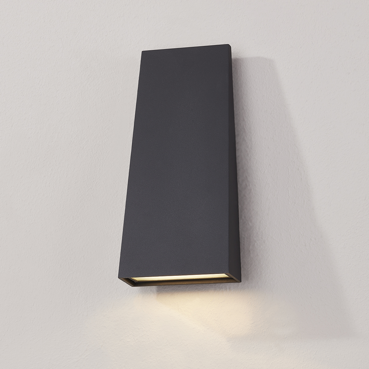 Angling from the wall adds depth and functionality to the straightforward, rectangular silhouette of this outdoor wall sconce. The sleek and architectural design features an etched ""spread"" lens that evenly distributes light from the LED bulb. Available in a Texture Black or Texture Bronze in two sizes, this exterior fixture feels very of-the-moment and will instantly elevate any exterior space.