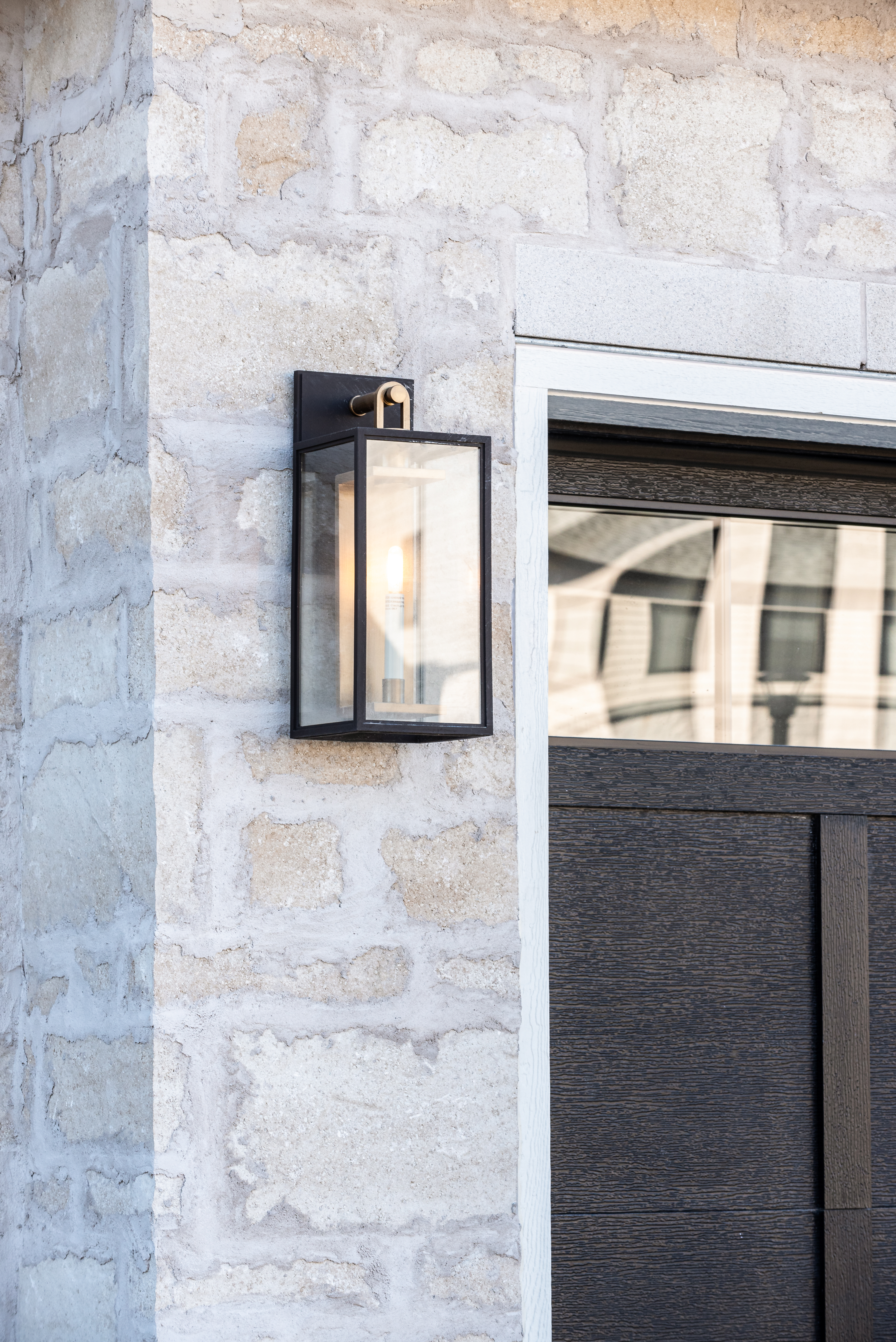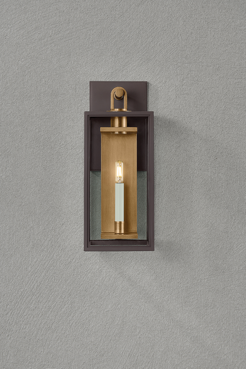 The Arnold sconce reimagines a traditional lantern with graphic geometry and mixed metal finishes. The design includes a clean-lined True Bronze frame and EPM encasing to resist fading and corrosion over time. Patina Brass accents create striking focal points, from the candle reflector to the suspension loop. Arnold comes in three sizes, making it suitable for any home size.
