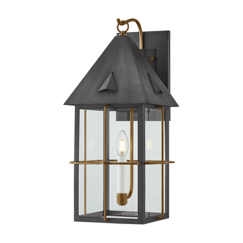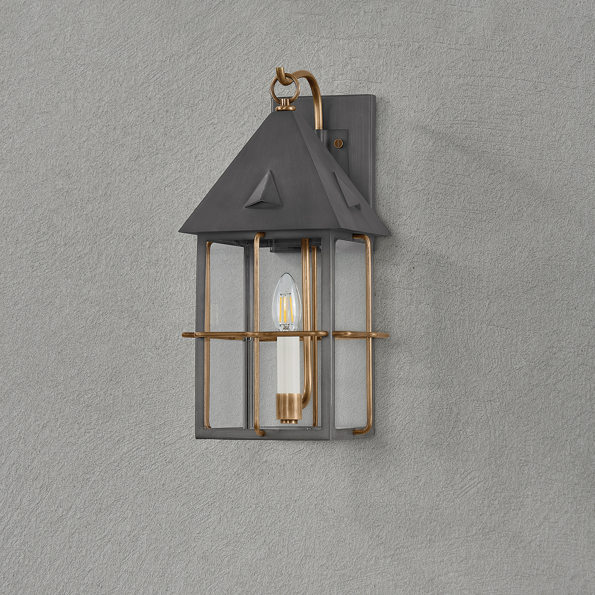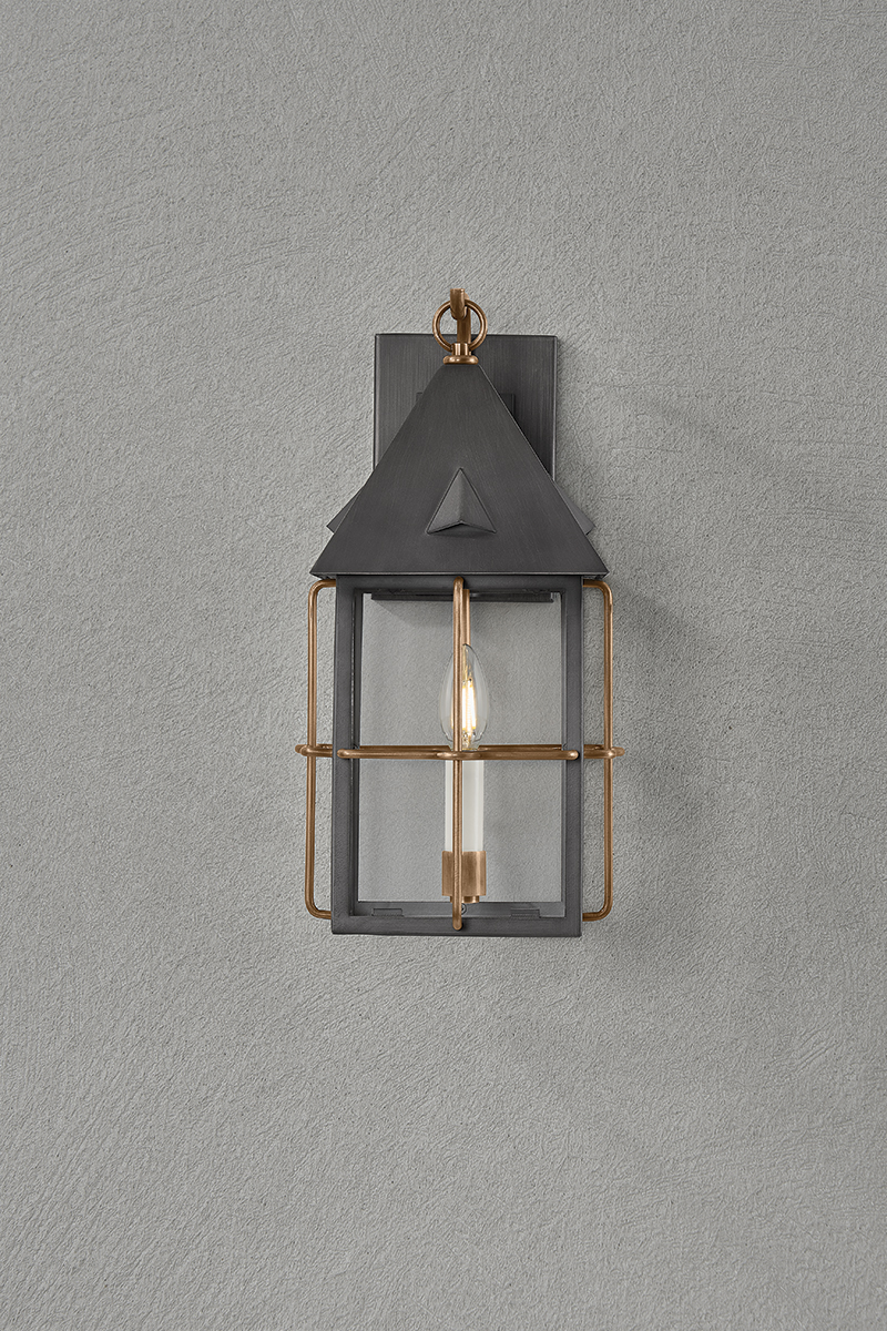 Inspired by a Cape Cod post lantern, this updated heritage sconce blends classic design features with contemporary mixed metal finishes. The Graphite frame is complemented by warm Patina Brass details, including the loop that suspends the fixture. A single cream candle lends a sense of nostalgia, welcoming you home on a dark night. Available in two sizes, Toby is particularly well-suited to coastal and cottage homes.