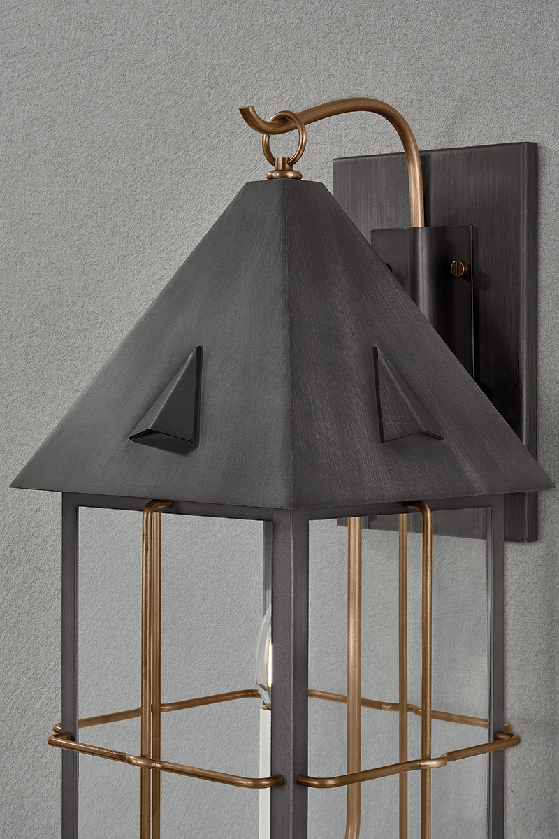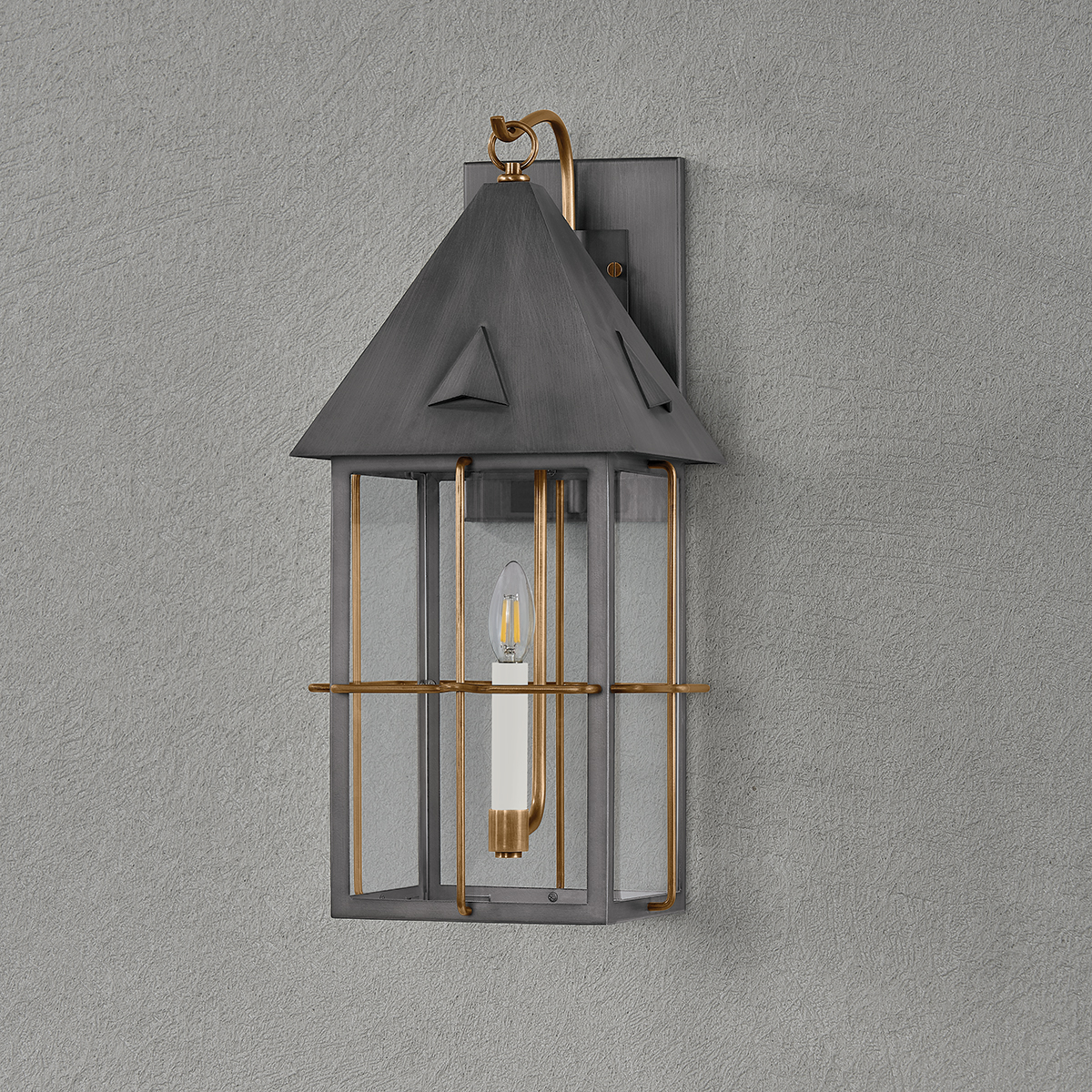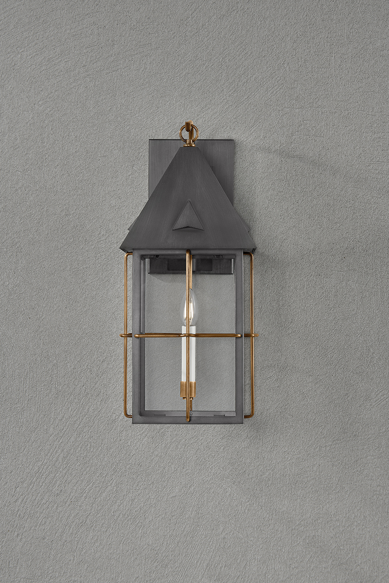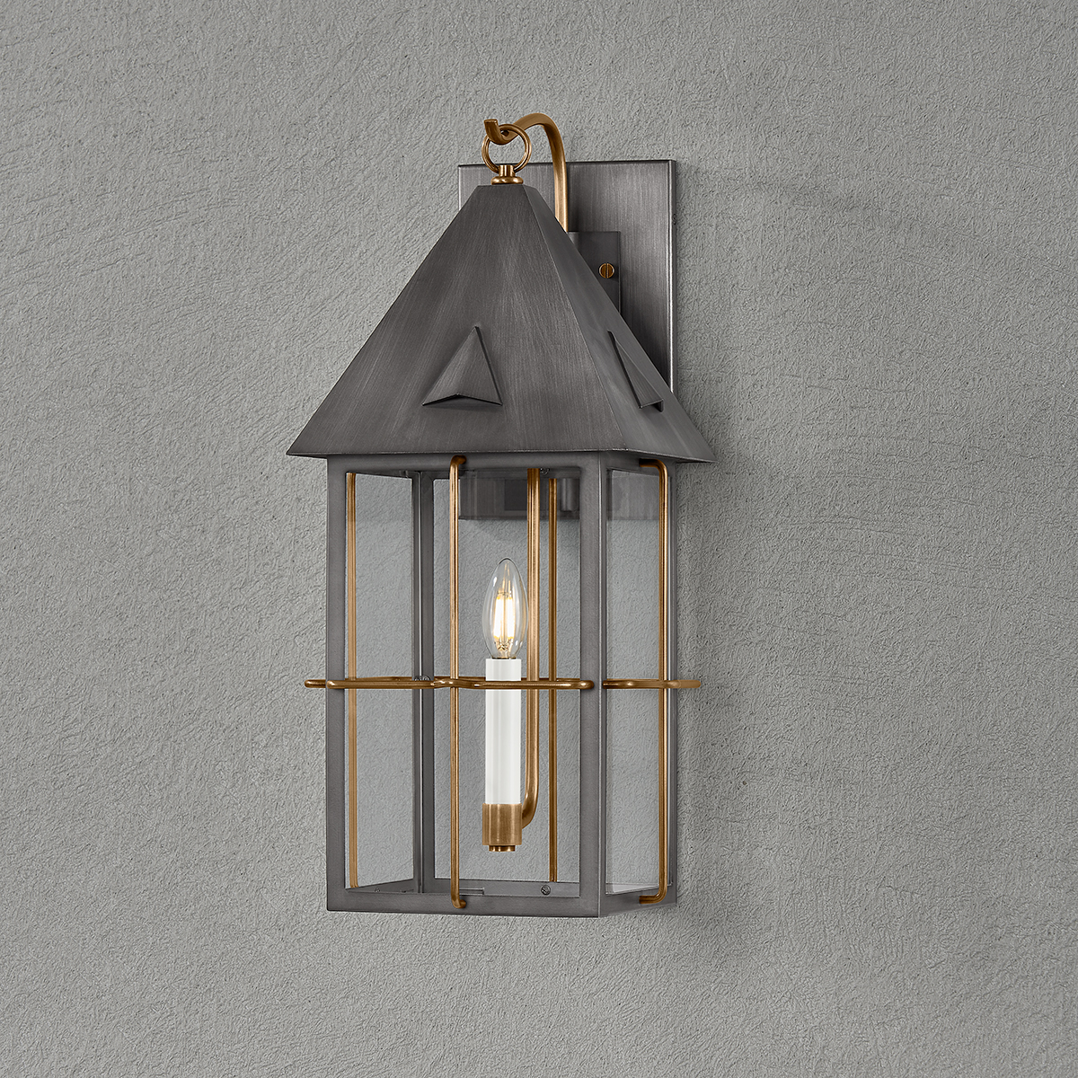 Inspired by a Cape Cod post lantern, this updated heritage sconce blends classic design features with contemporary mixed metal finishes. The Graphite frame is complemented by warm Patina Brass details, including the loop that suspends the fixture. A single cream candle lends a sense of nostalgia, welcoming you home on a dark night. Available in two sizes, Toby is particularly well-suited to coastal and cottage homes.