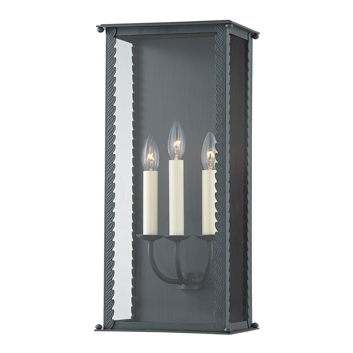 Zuma embraces its surroundings, taking cues from the natural world to inform its captivating silhouette. This candelabra style cage light features a delicate leaf detail climbing up the edges, revealing demure finials on each corner. Clear glass allows you to admire the candlestick lights clearly. Available in French iron or verdigris finish. Available as a one, two, or three-light wall sconce, and pendant in two sizes.