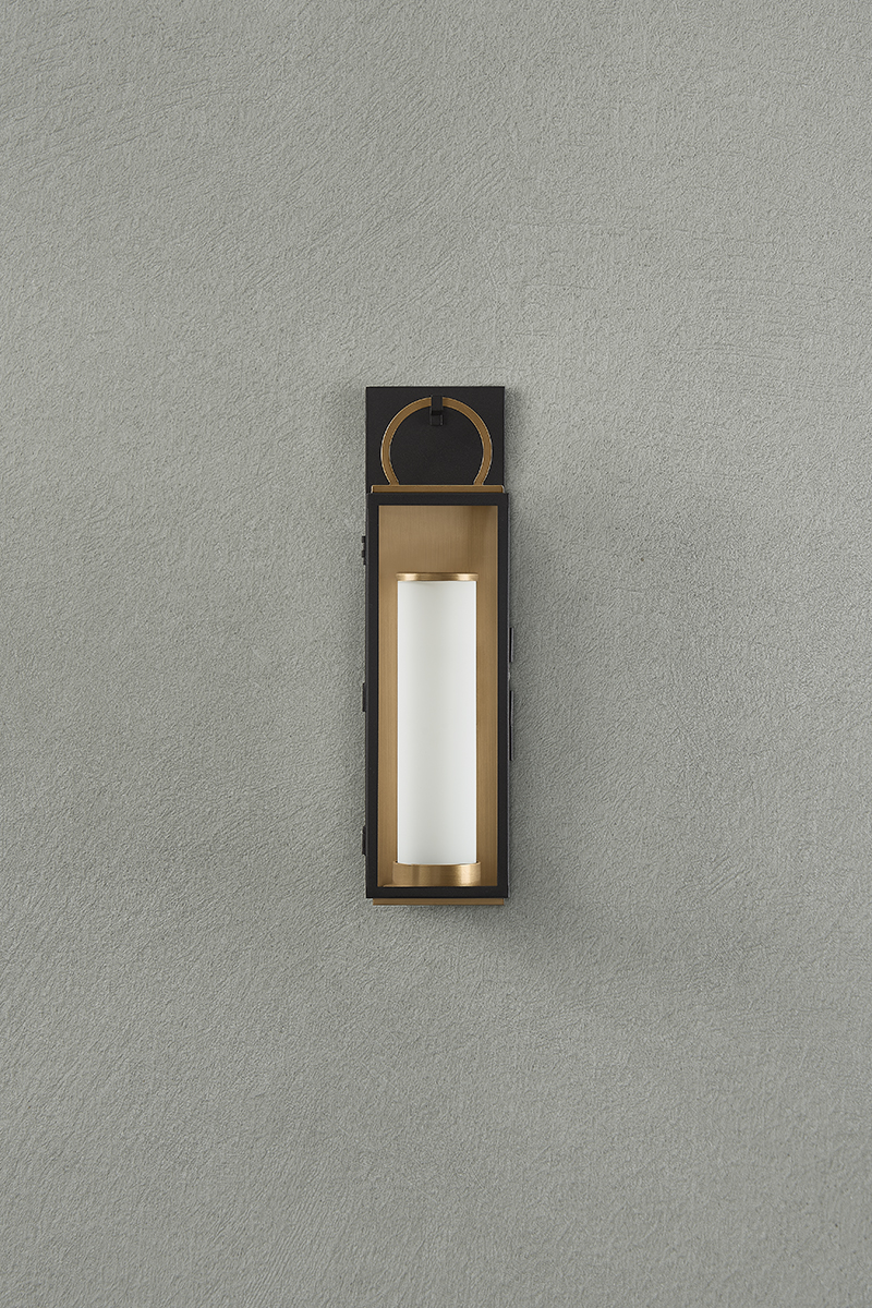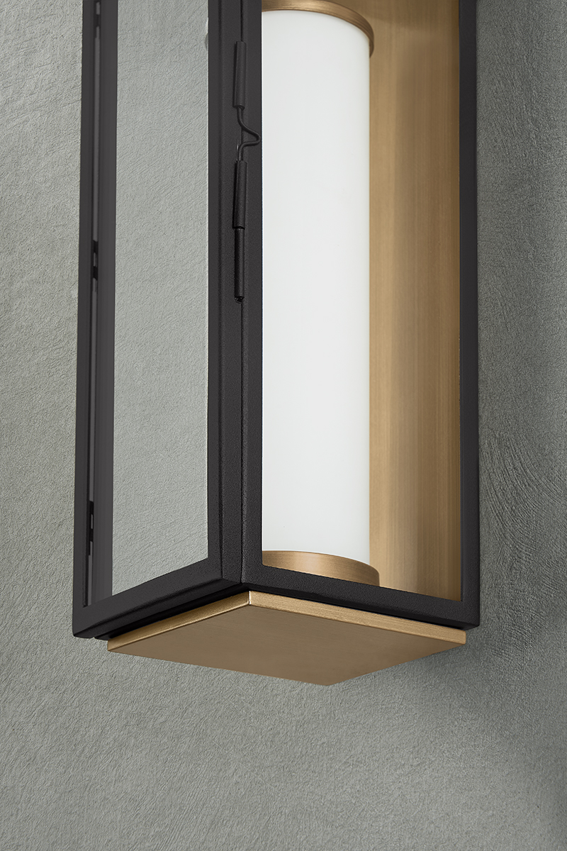 Drawing inspiration from traditional lanterns, this family of sleek exterior fixtures includes sconce and a portable lantern in multiple sizes. Elongated silhouettes and a mixed-finish combination of Textured Black and Patina Brass give these lanterns a contemporary update. While Gareth is equipped with a single chunky pillar candle for a timeless look, the light source is actually a lightweight aluminum puck with LED technology housed the bottom of the glass cylinders. Gareth is available as both a sconce and a portable lantern in multiple sizes. The portable option is rechargeable and includes a convenient handle for easy transport.