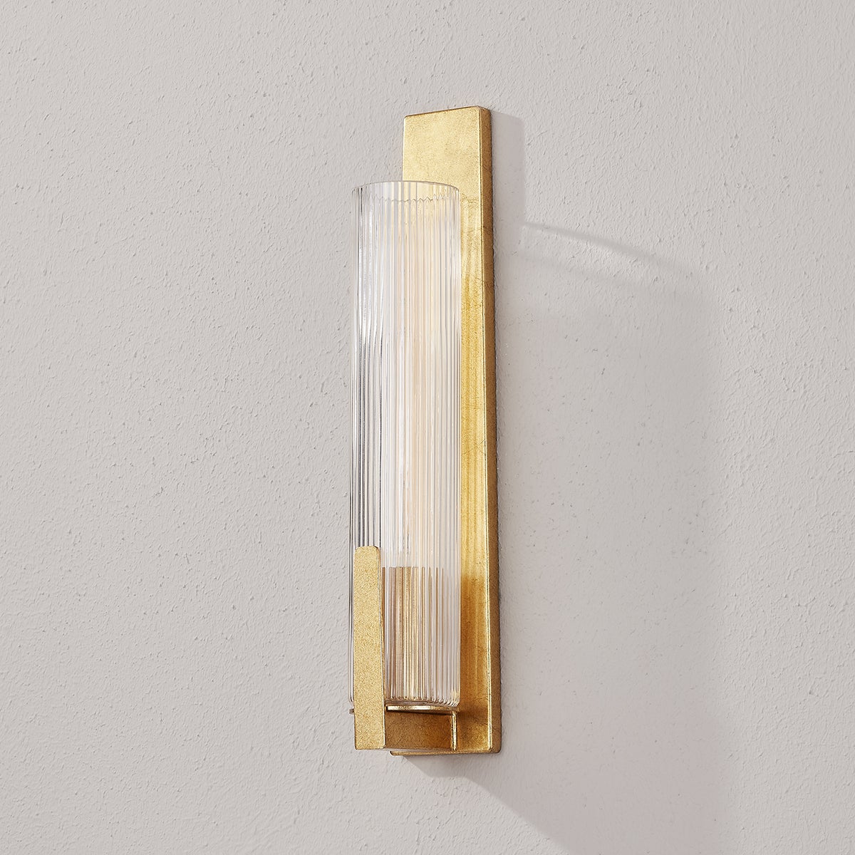 A ribbed glass tube shade rests on a slim backplate specifically designed for a gem box creating Malakai's slender silhouette and straightforward design. This modern sconce is an obvious choice for the bath and the Vintage Gold Leaf and Forged Iron finishes pair well with many interiors.