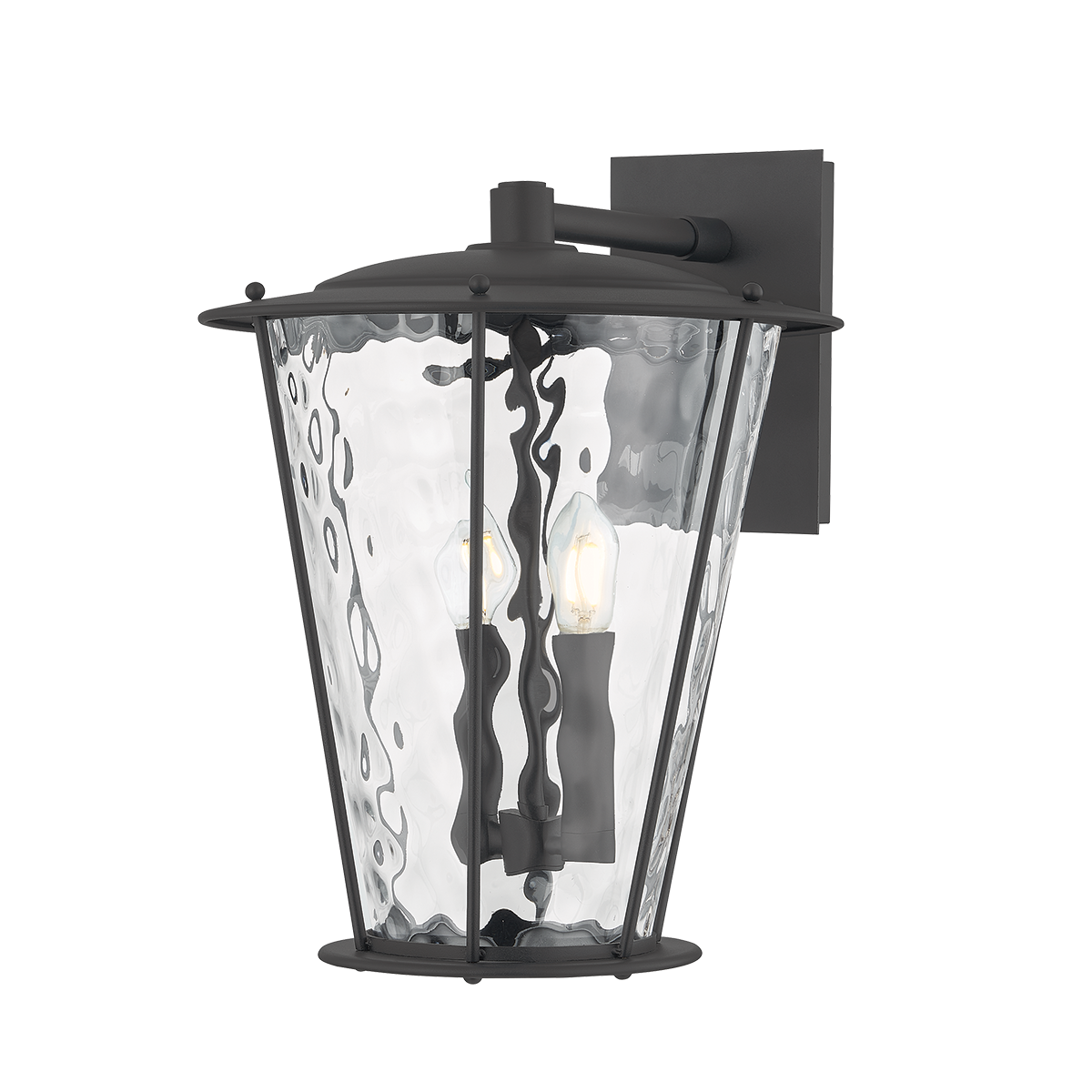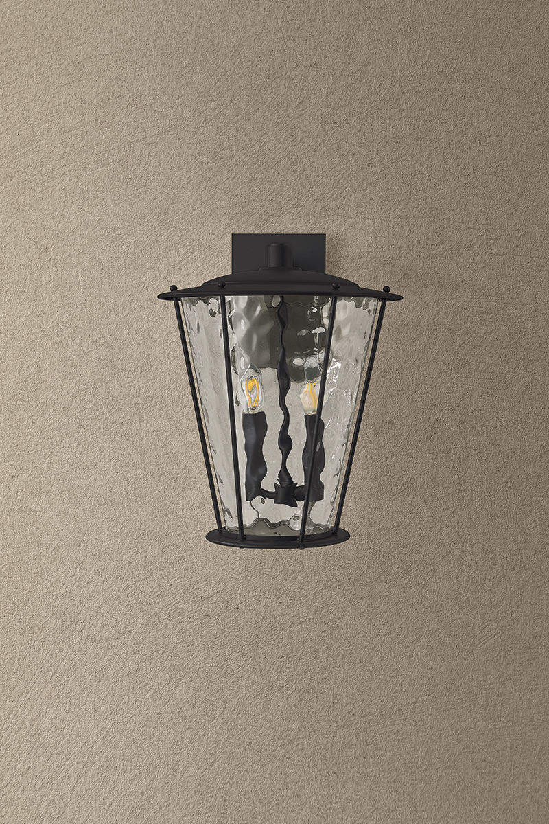 Jantzen draws inspiration from classic lantern designs, reinterpreting a traditional caged form with distinct angled edges. The wavy water glass panels lend texture and movement, subtly elevating the design. Cream-colored candles add a bright note in contrast to the robust Textured Black finish of the frame. Available as a 2-light sconce and 2-light post, Jantzen modernizes heritage influences to create a timeless outdoor staple.
