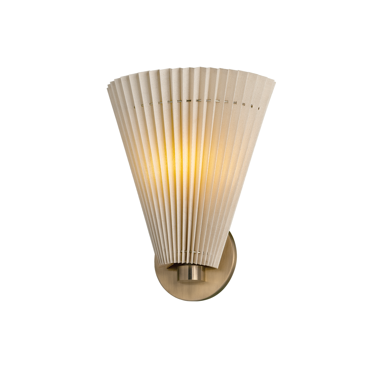 Simultaneously soft and architectural, the Dell sconce pulls from vintage references of artful pleats and fan-like shapes. Available in a single or double light, the faux silk shades are gathered by thin metal rods that run through the shades, creating a natural, slightly irregular draping. The Patina-Brass finish of the hardware adds to the antique feel of this elegant wall light.