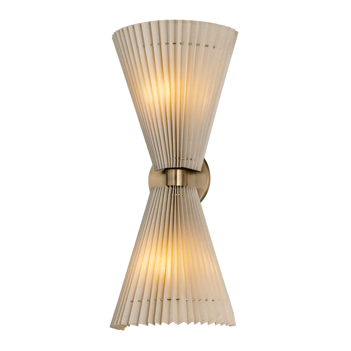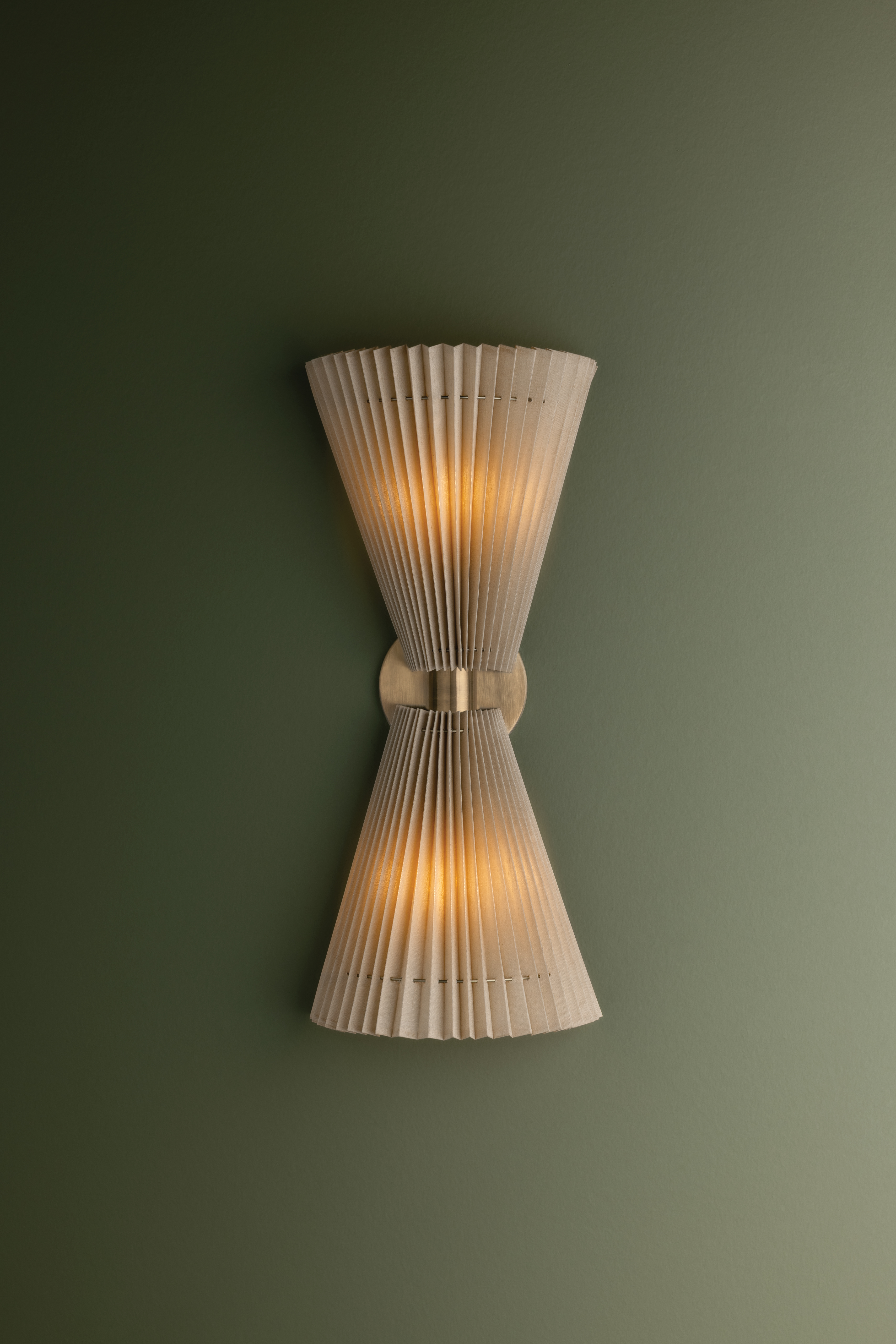 Simultaneously soft and architectural, the Dell sconce pulls from vintage references of artful pleats and fan-like shapes. Available in a single or double light, the faux silk shades are gathered by thin metal rods that run through the shades, creating a natural, slightly irregular draping. The Patina-Brass finish of the hardware adds to the antique feel of this elegant wall light.