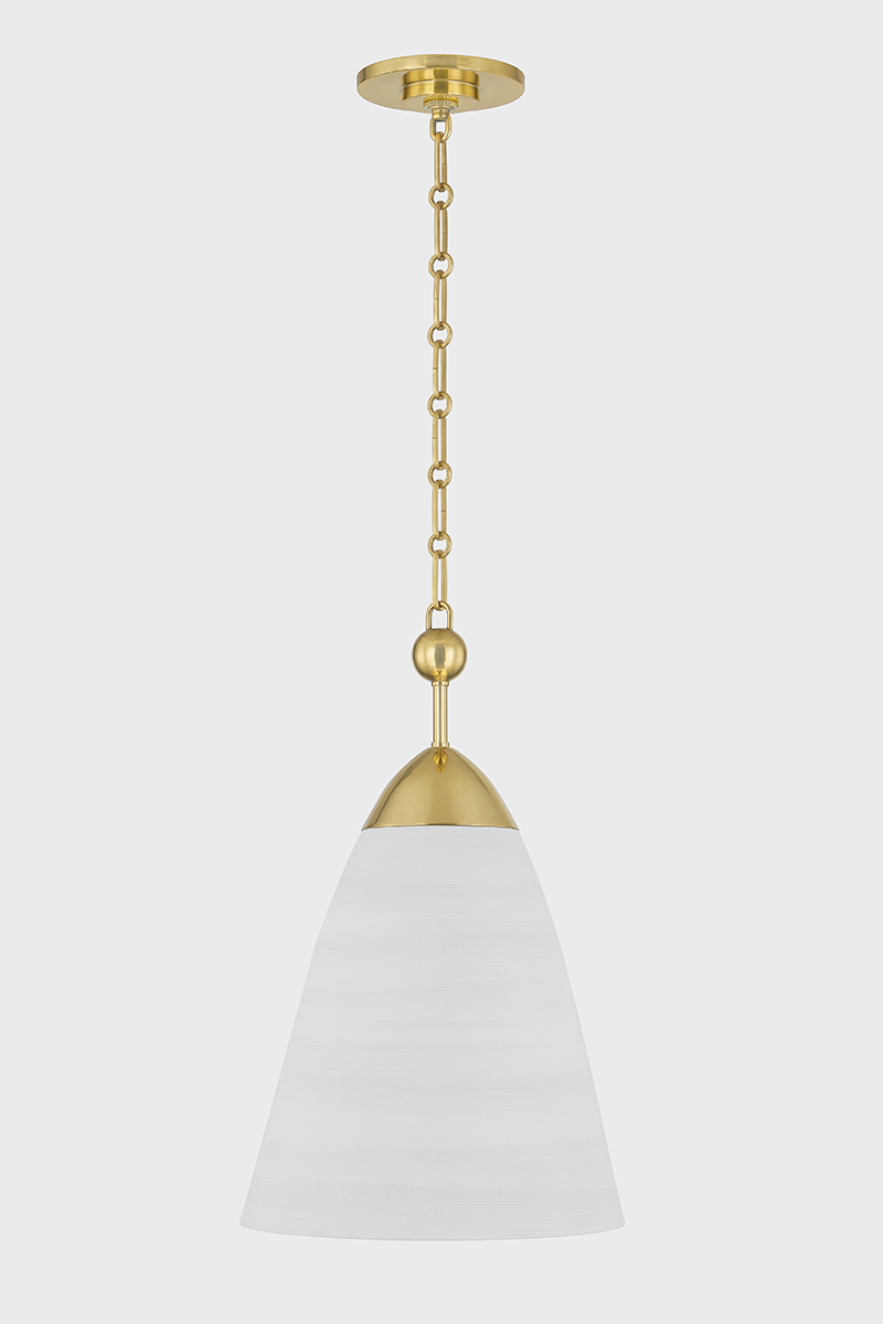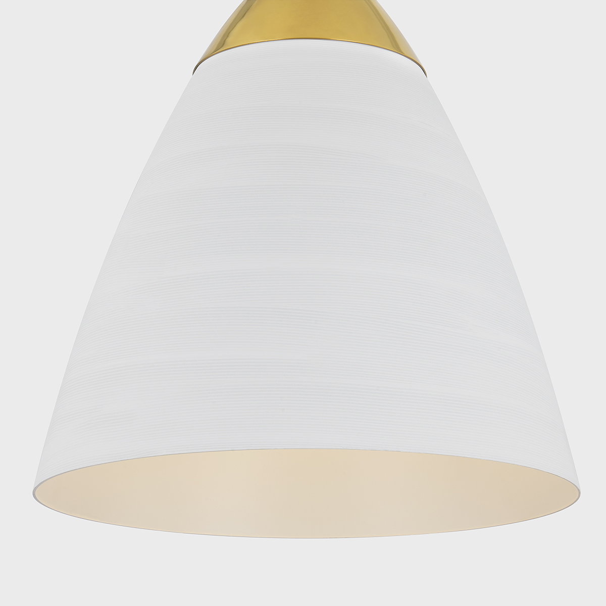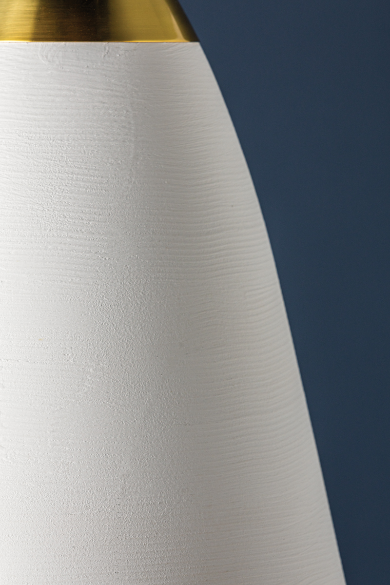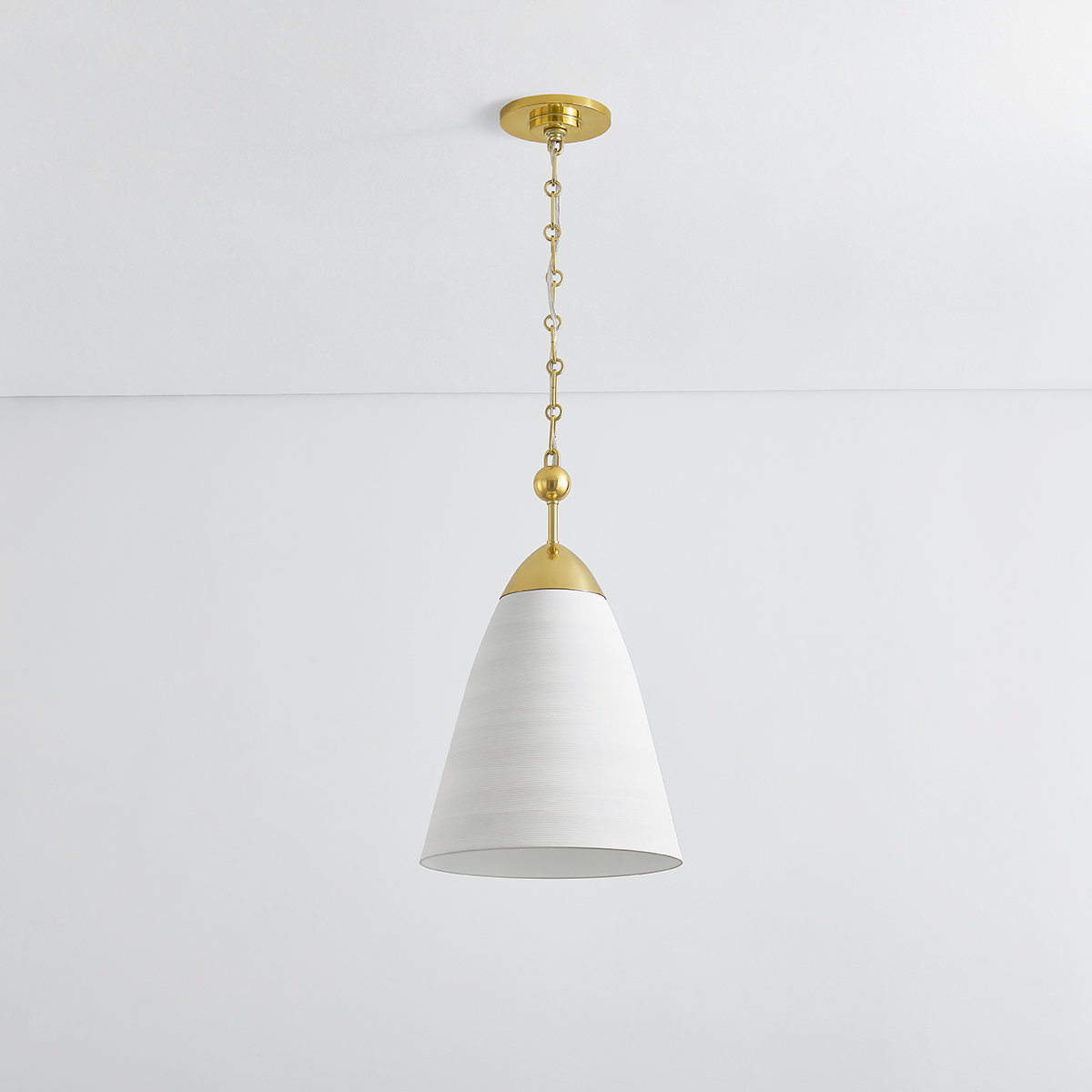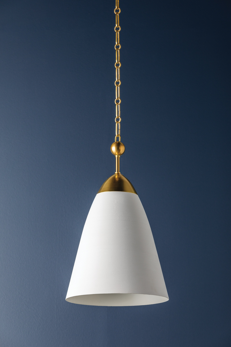 A refined bell-shaped fixture with a modern edge, Bronson features a sleek, tapered silhouette crafted from clean White Plaster. The opaque materiality and funnel shape creates a powerful downlight to fill a large area. Accented by the inviting warmth and reflective nature of Aged Brass, including a large cap and finial, it evokes an organic feel. Available as a chandelier or pendant in two sizes. Part of our Becki Owens collection.
