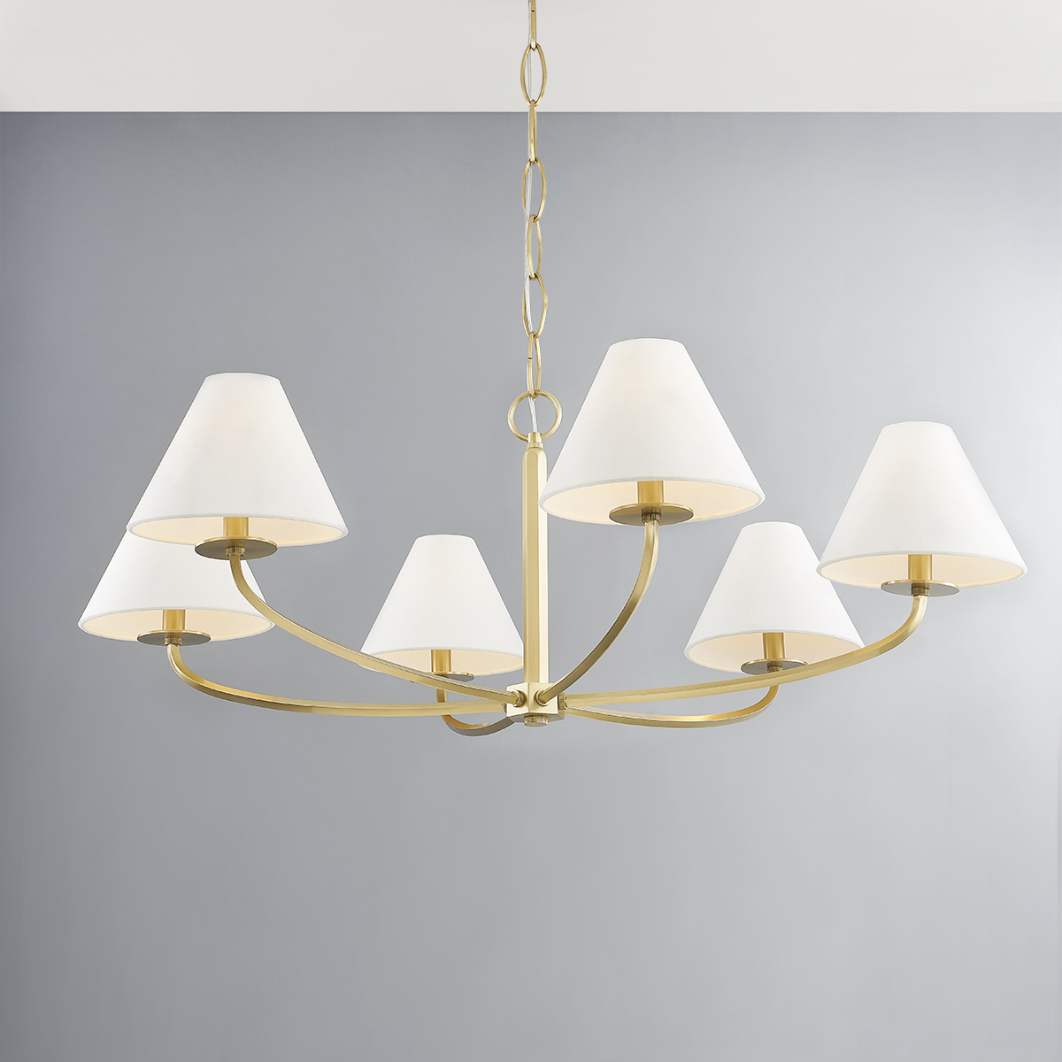 At first glance, Stacey is your classic shaded fixture, but a closer look reveals a familiar silhouette with subtle elevated details. In sconce form, a layered circular backplate with bias cut edge detailing is the base for a swooping square arm that slightly twists into knurled caps at either end. The chandelier highlights the same bias cut technique in an elegant stem. Stacey's stunning metalwork is available in three classic finishes.