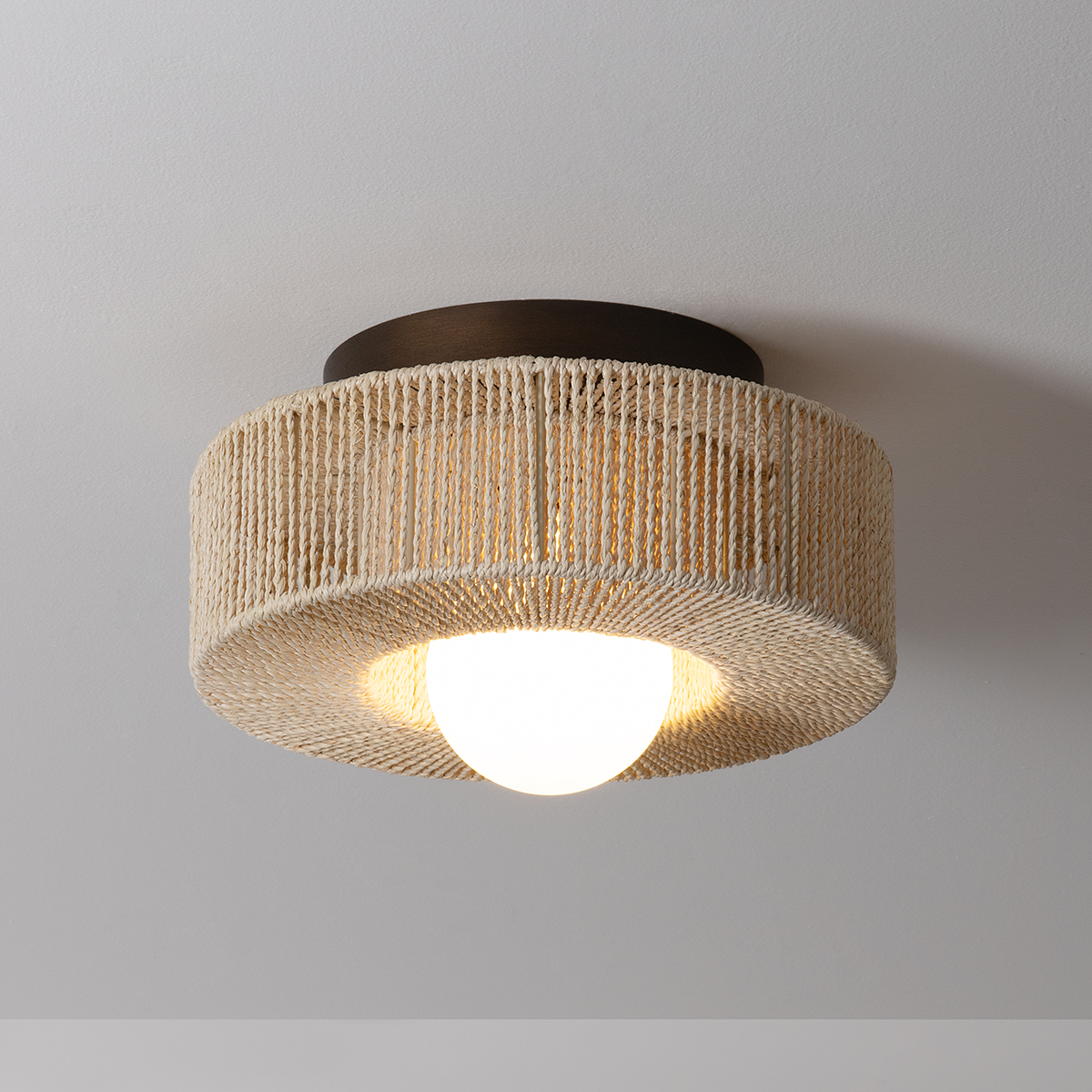 An expression of substantial geometry with lightweight materiality, Coleman features a dimensional, Abaca string-wrapped frame that resembles a vintage carousel. The inside of the shade is densely wrapped, while the outside has a more sparse distribution, creating a sense of visual dynamism that is enhanced when lit. The Bronze Leaf finish of the mount carries through the antique aesthetic while balancing the lightness of the bleached strings.