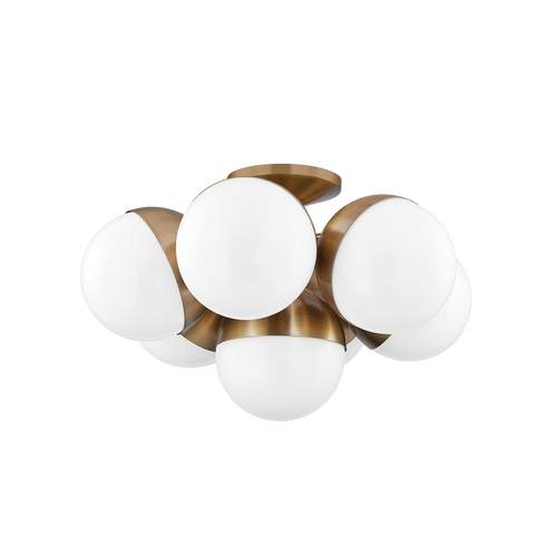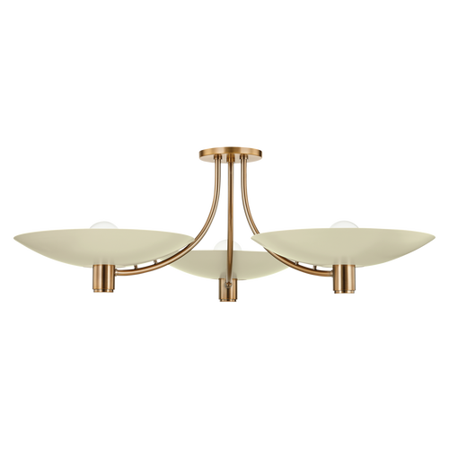 A cluster of thin, broad shades spread across the ceiling in the overscale Rory chandelier. Combined with the warm Patina Brass finish, the wide surface area of the cloud glass shades brings vintage style to an otherwise contemporary design. Whether in its 3 or 6-light iteration, Rory brings an artful ambience to any space.