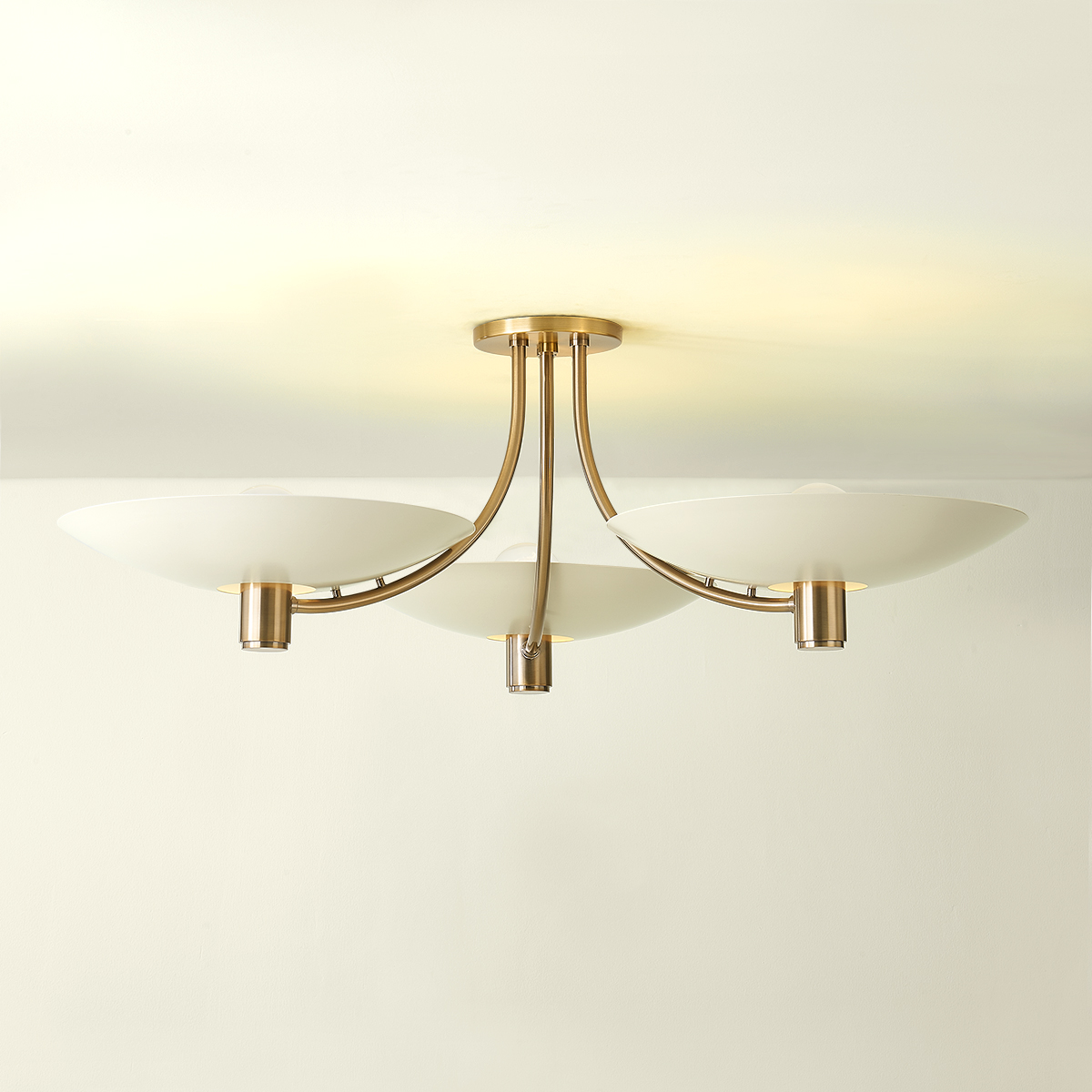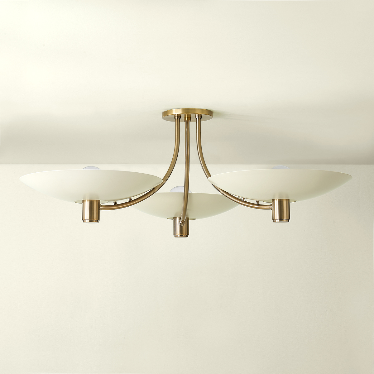 Taking inspiration from mid-century designs, Wolfe features updates in arm shape and finish combinations that give this chandelier a fresh look. Circular discs in a Soft Sand hue balance on top of graceful arms finished in Patina Brass. Marrying clean geometry with elegant curves, Wolfe provides serene and even lighting from above. Available with 5 lights.