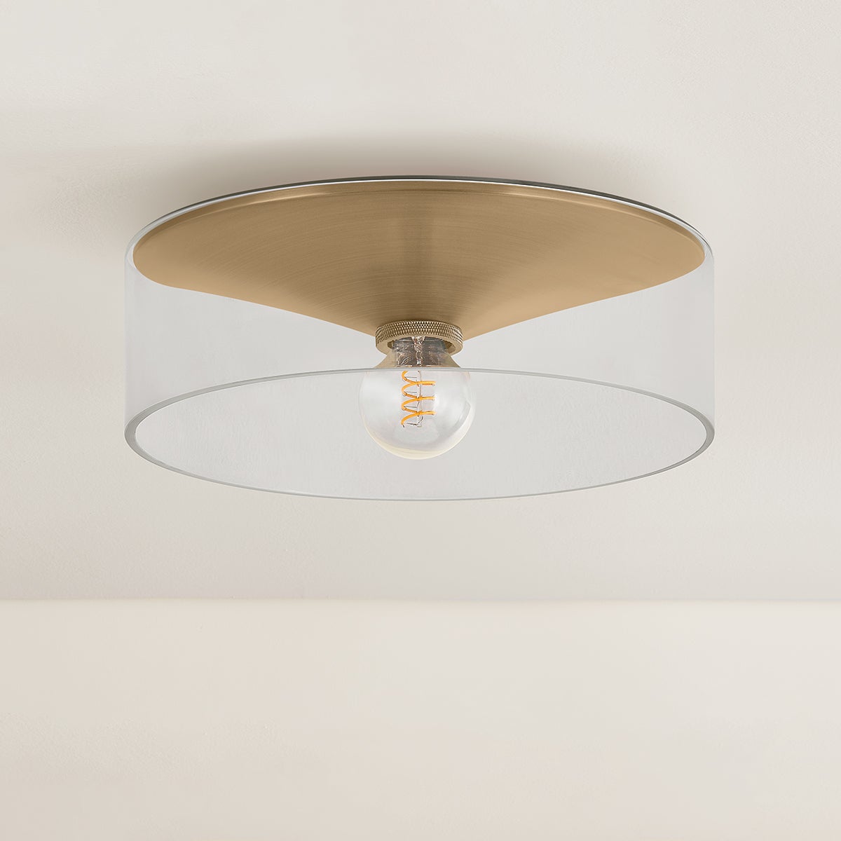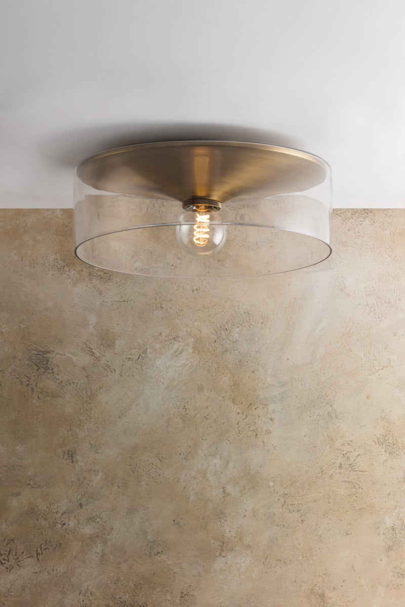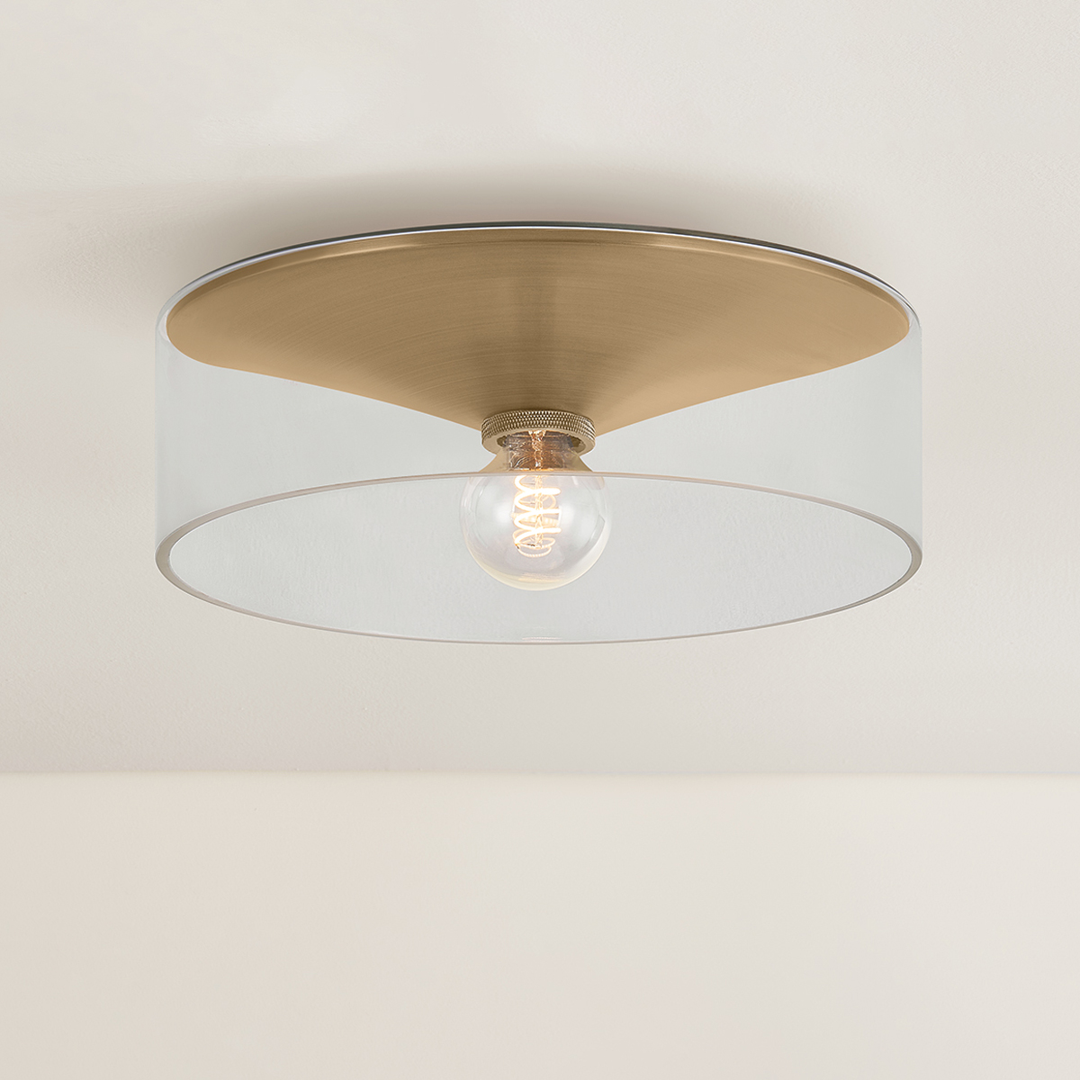 The Killian flush mount’s imaginative design is simple yet impactful. An inner funnel-shaped metal dish is encased by a cylindrical outer glass piece, creating a seamless shade. As a notable detail, a clear glass bulb emerges from the central gap like a drop of water. The Patina Brass finish adds a soft warmth to this organically-inspired fixture.