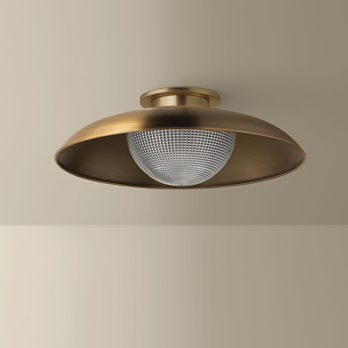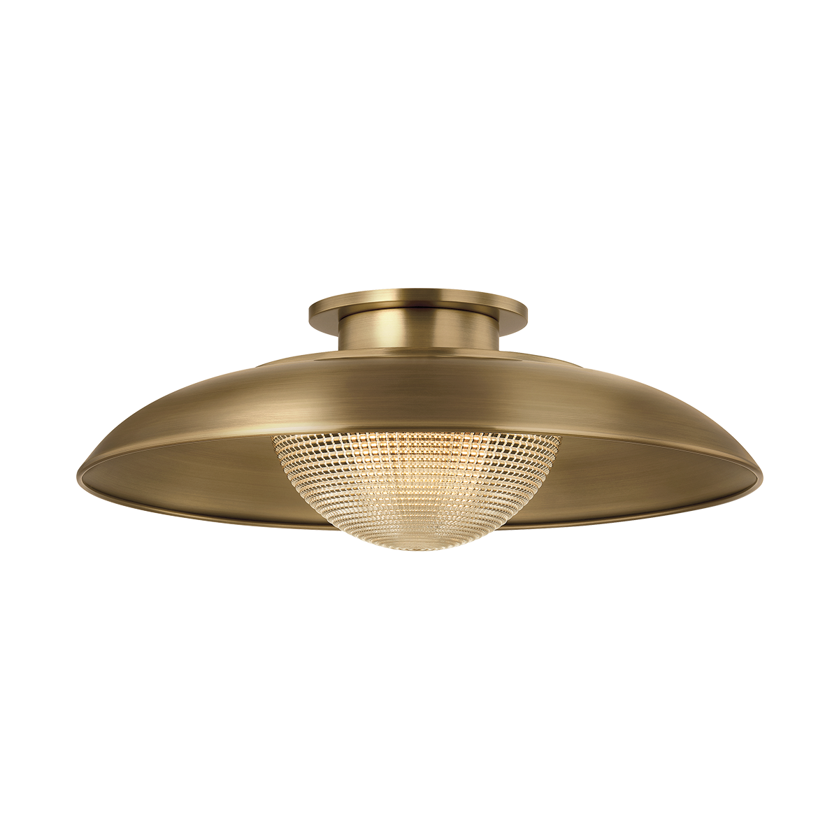 Braxton speaks to refined utility in both form and function. The shallow RLM-style shade in Patina Brass nods to industrial influence, while the clear optic glass diffuses light beautifully through prismatic ridges. Available as a 1-light flush mount or pendant, Braxton is a versatile fixture for any contemporary space.