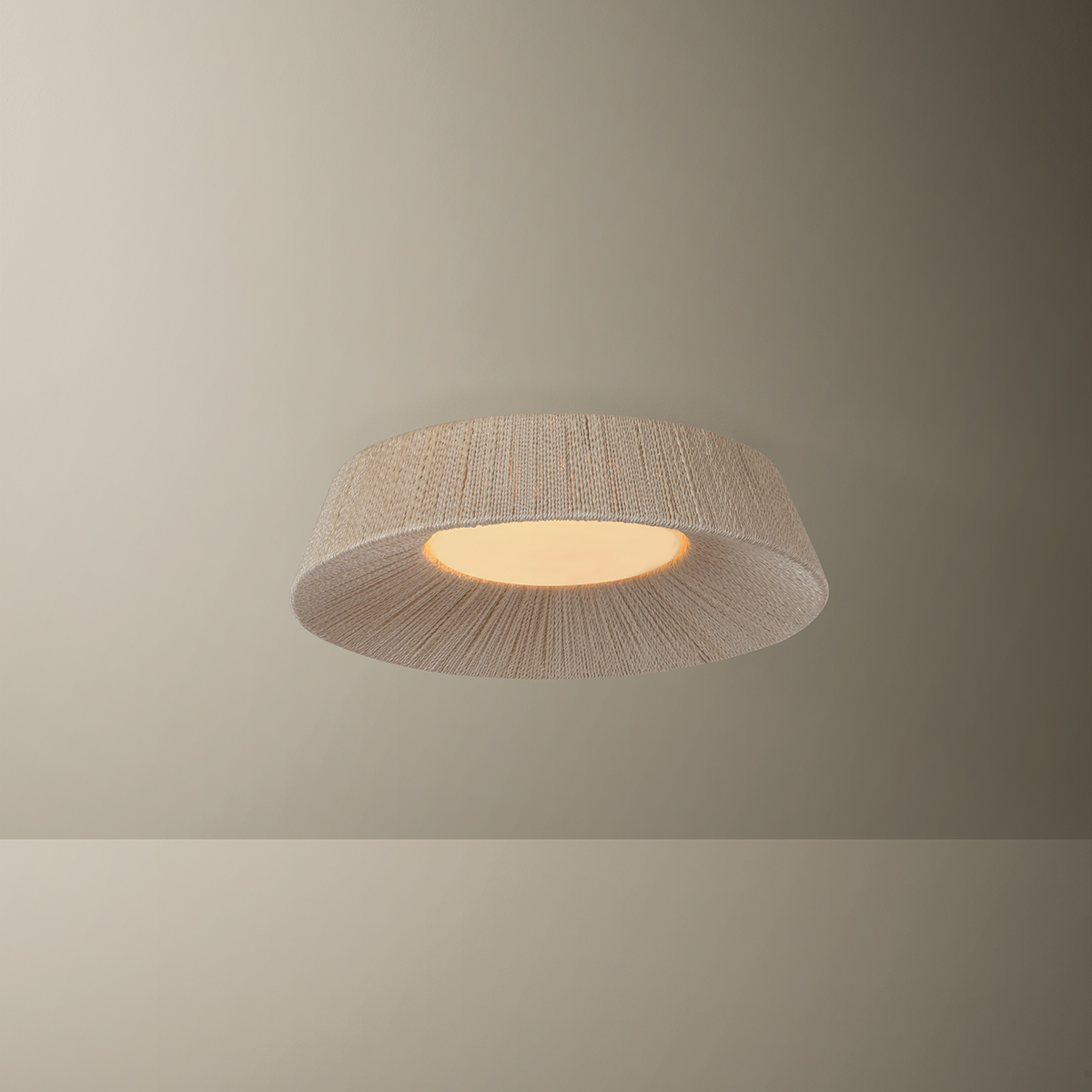 Wrapped in bleached abaca, a minimalist flush mount silhouette becomes a textural statement piece. The wide circular frame of Kenton is fitted with a glossy opal glass diffuser, emanating soft light across a large area. Available in two sizes, the warming shades of Kenton illuminate modern, coastal, or transitional interiors.