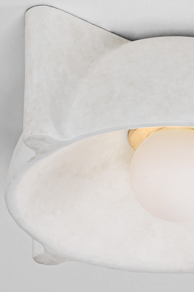 Inspired by nautical lighting, Modesto blends clean modern styling with warm, natural materials. A finned dome-shaped shade in Fossil White Ceramic finish gives the fixture a textured, weathered look. Minimal Vintage Gold Leaf hardware details add just a hint of shine. Available as both a wall sconce and flush mount.