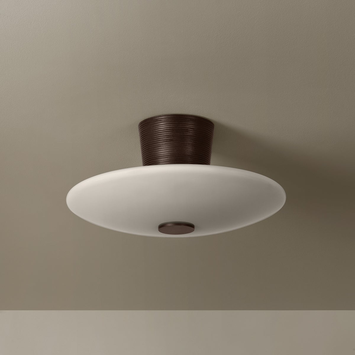 Striking metal details complement the clean, geometric silhouette of the Albus semi-flush mount. The slightly dished glossy opal shade emits a broad spread of atmospheric light, free from harsh glare. Finished in Bronze Leaf, a central metal piece adds a note of contrast to the shade. Soft light washes upward over the wide stem, highlighting the unique textural ribbing detail.