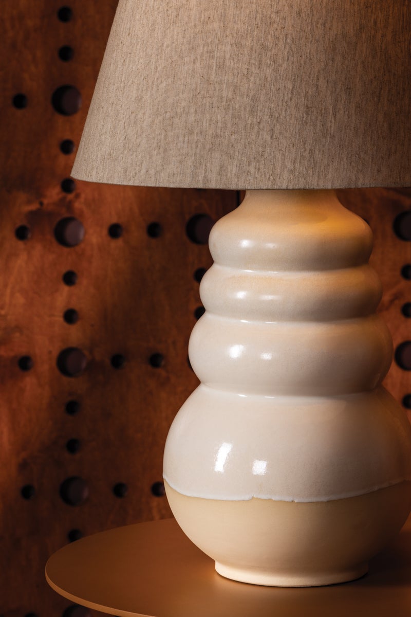 Pairing an oversized natural linen shade with a funky ceramic base, the Tybee table lamp feels peppy and offbeat, though still refined. The unique Elemental White Ceramic glaze has an organic dripping effect that lends an artisanal note to the base. Tybee’s joyful, handcrafted aesthetic dresses up a space as it creates an effortless focal point. Finished with Aged Brass hardware.
