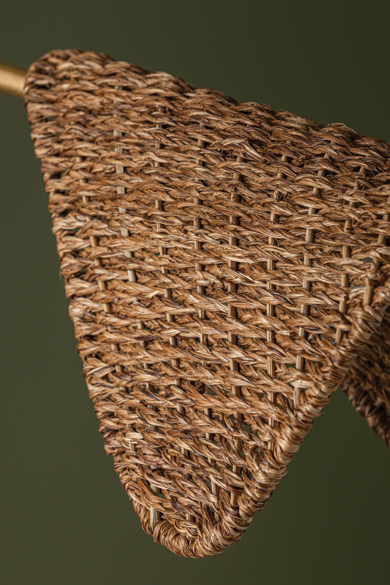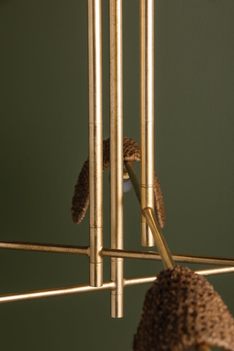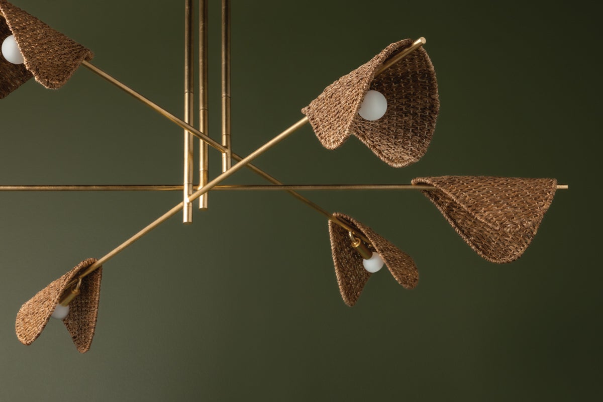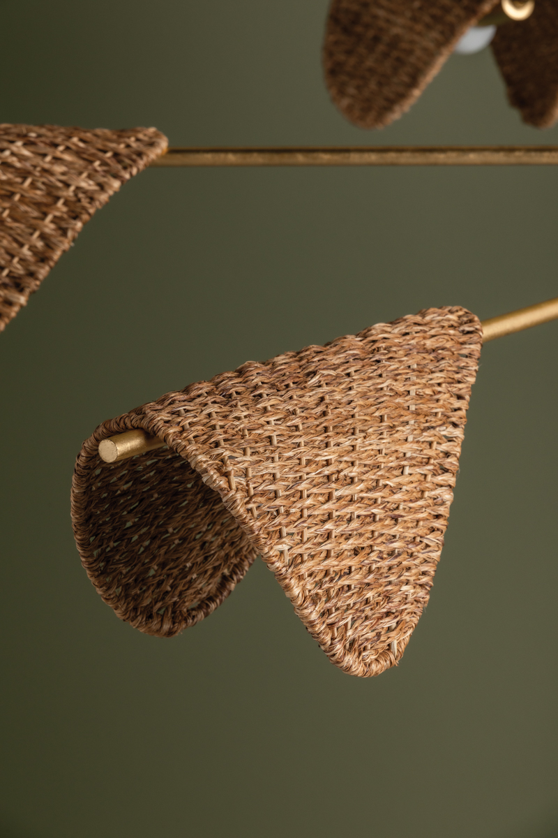 Let your imagination take flight with the dynamic artistry of Barnaby. Mimicking the elliptical wing movements of birds, each shade has been handwoven from natural abaca fibers to create an airy and sculptural centerpiece. As a point of contrast, the clean lines and right angles of the Aged Brass frame lend this mobile-inspired chandelier a pleasing sense of order.