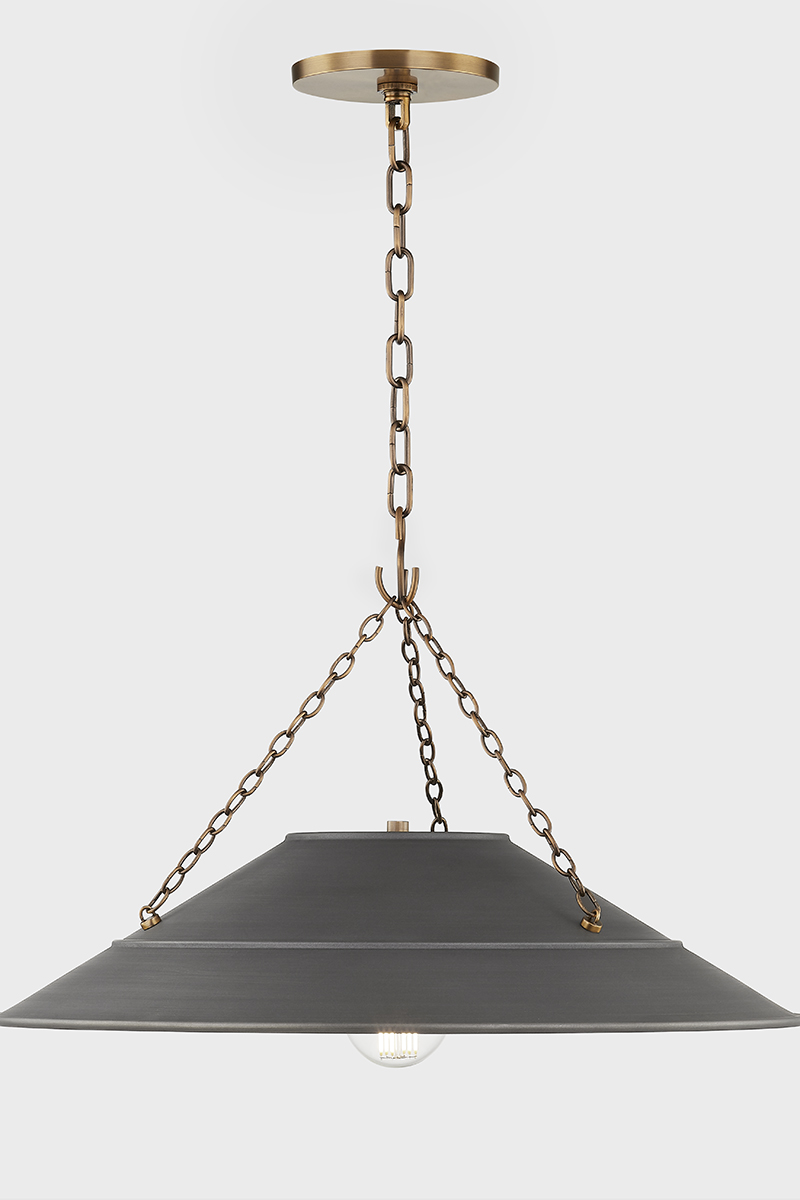 With its exposed metalwork, chain detailing, and unique finish combination, Arcane has an elevated, industrial vibe. The graphite shade feels chic and gives off a warm glow. The Patina Brass hardware, chain, and canopy add a hint of shine that plays wonderfully off the graphite. The twisted black fabric cord is a subtle detail that gives the pendant a vintage feel. Part of our Lauren Liess collection.