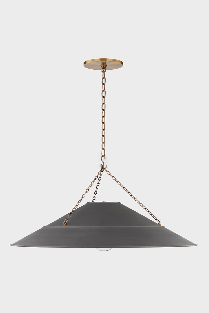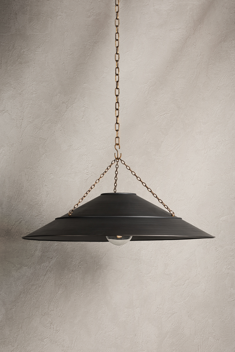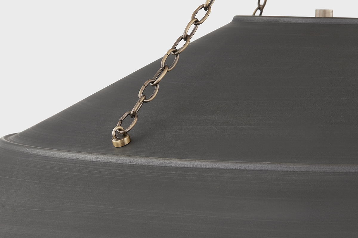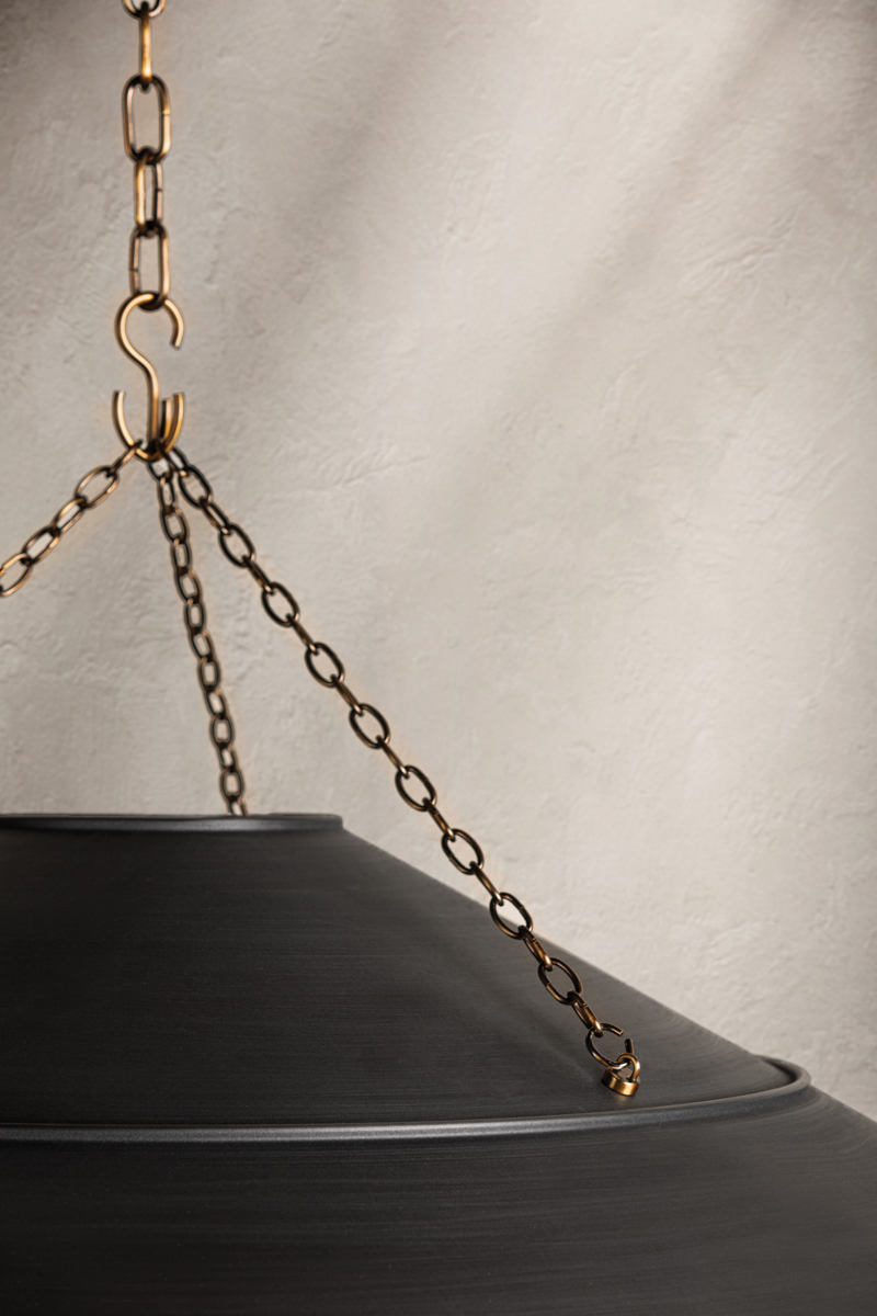 With its exposed metalwork, chain detailing, and unique finish combination, Arcane has an elevated, industrial vibe. The graphite shade feels chic and gives off a warm glow. The Patina Brass hardware, chain, and canopy add a hint of shine that plays wonderfully off the graphite. The twisted black fabric cord is a subtle detail that gives the pendant a vintage feel. Part of our Lauren Liess collection.