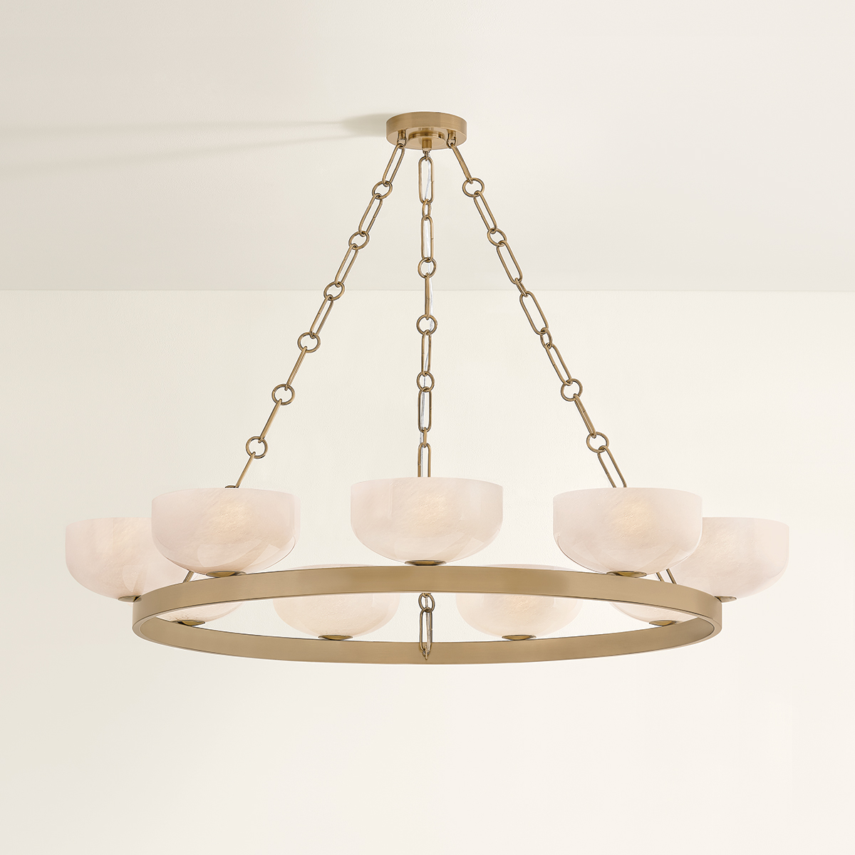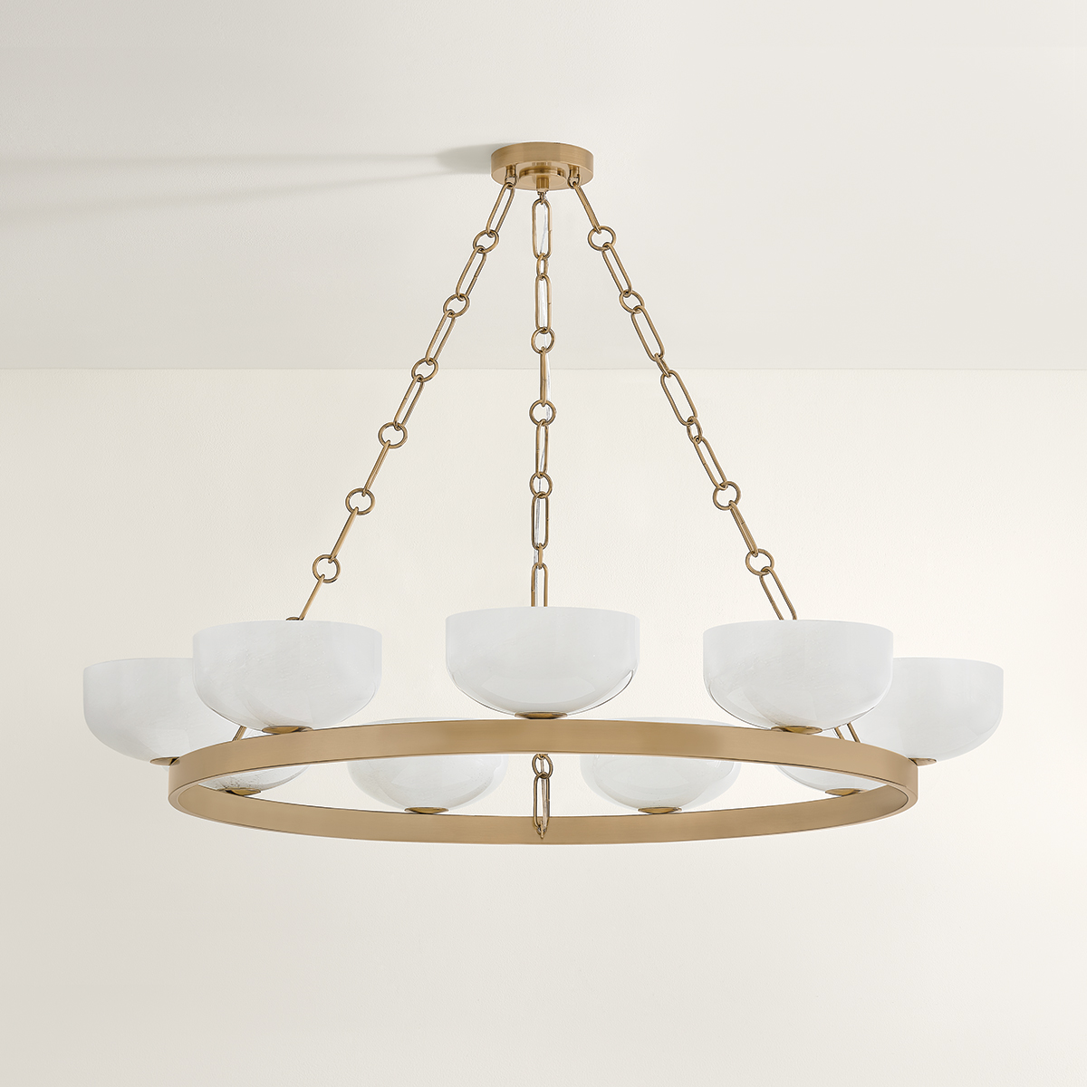 The innovative design details of Caelum modernize a classic ring-chandelier silhouette. Seedy cloud glass bowls perch closely along the frame to create a luxe, maximalist feel. The unique elongated rod and hook suspension feel equally dainty and industrial. Finished in Patina Brass, Caelum is available with 6 or 9 lights.