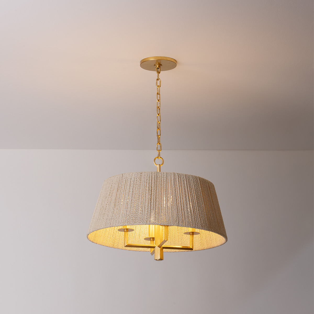 French Riviera finesse meets mid-century modernism in the Azar pendant. The large drum shade is wrapped entirely in Bleached Abaca cord, allowing light to shine through. Finished in Vintage Gold Leaf, the angular frame takes its cues from vintage iron lighting as it peaks out from under the shade. Available in two sizes with either 4 or 6 lights, Azar provides a sophisticated lighting experience.