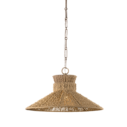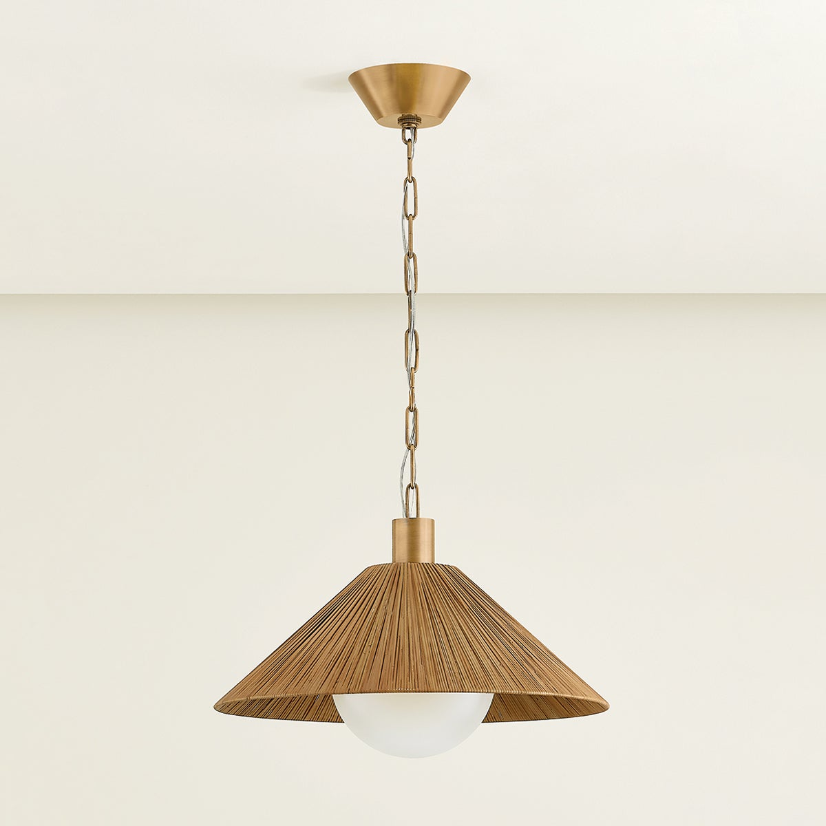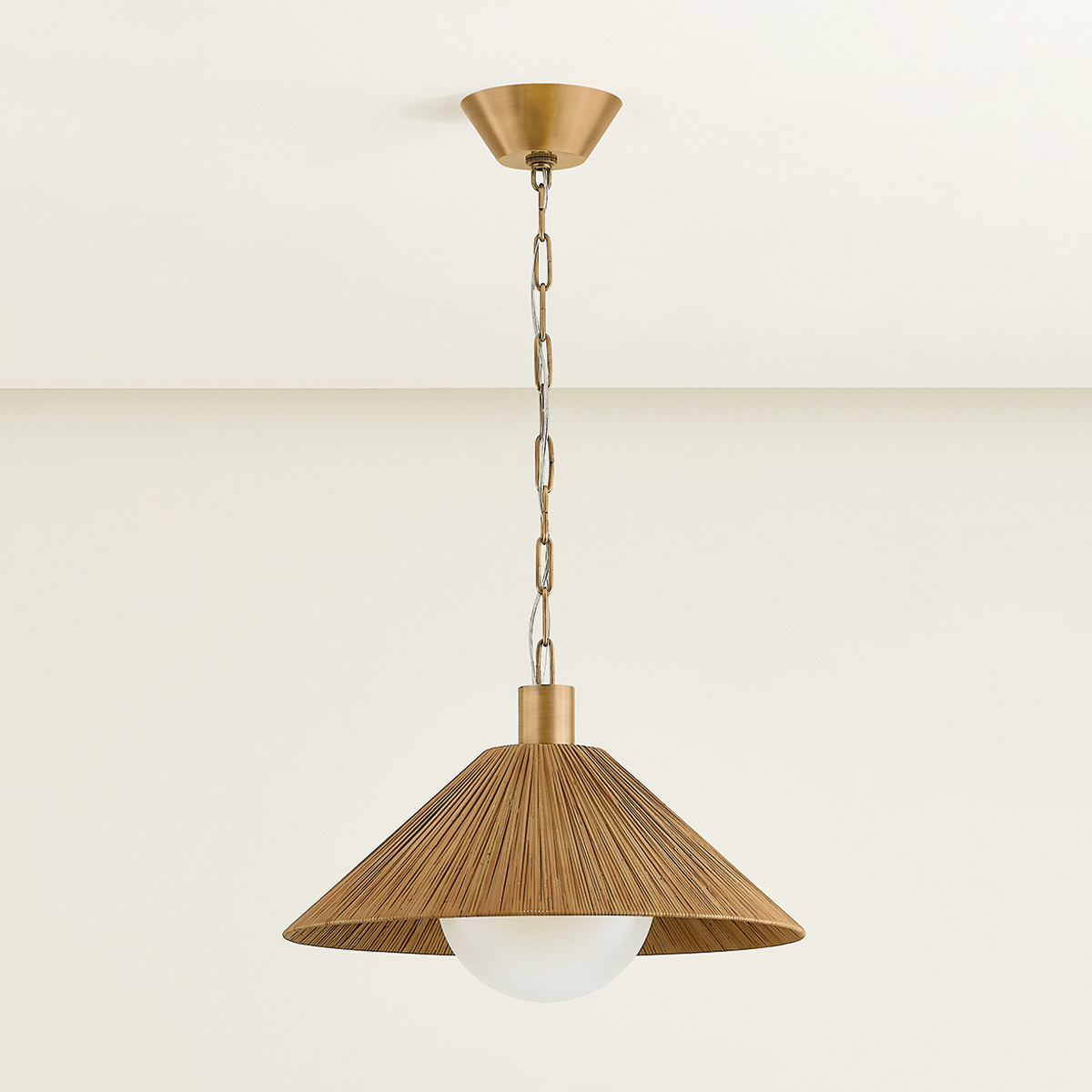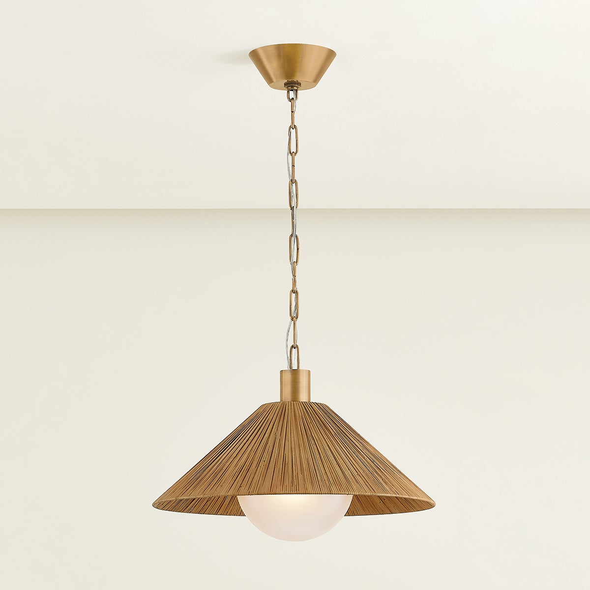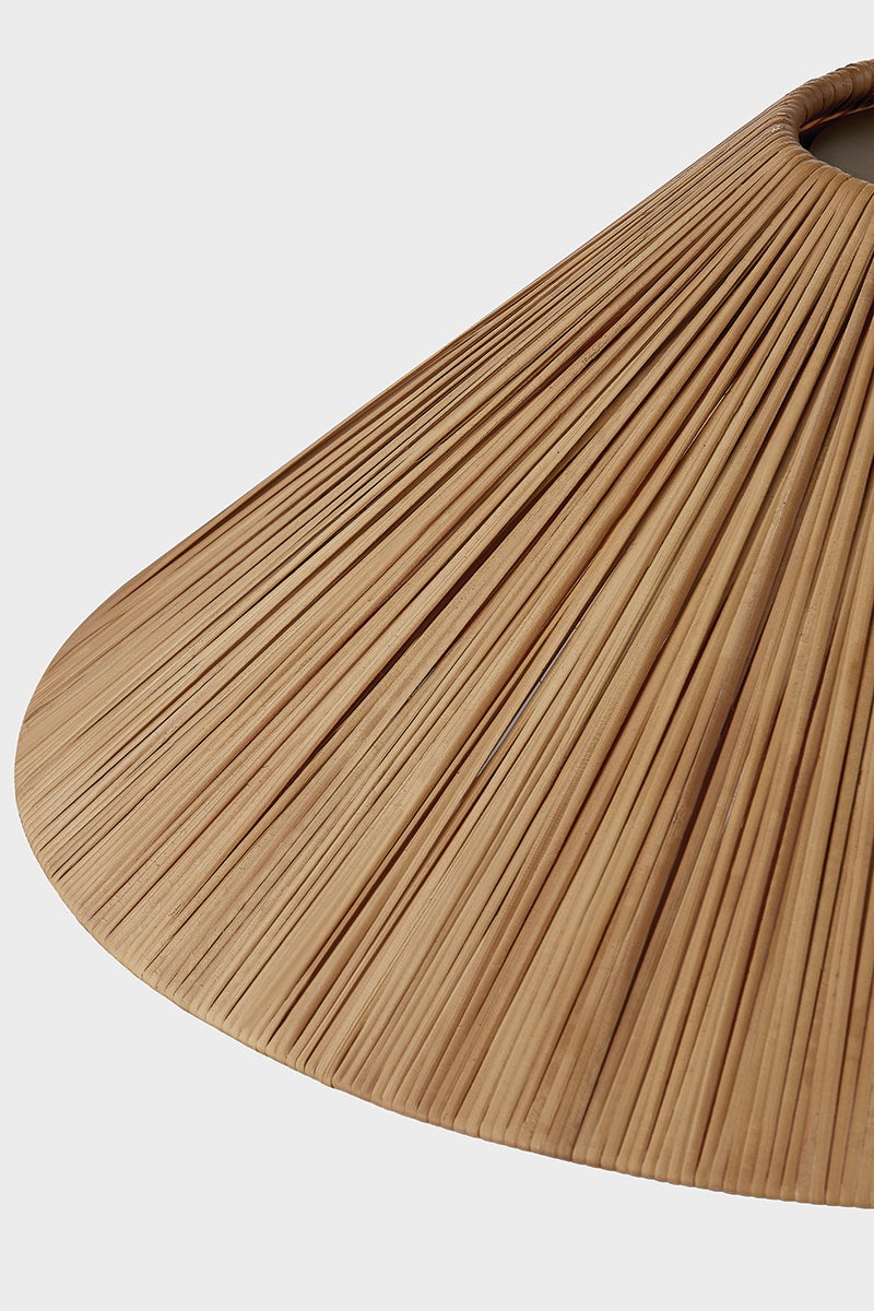 Elevating classic RLM design language, the Woodside pendant incorporates natural materials and unexpected proportions. The conical shade has been woven from flat rattan, giving the piece a highly textural, organic quality. A large etched glass globe protrudes from beneath the shade, adding considered geometry to the composition. When lit, the rattan glows with a reddish-brown hue that feels warm and inviting.