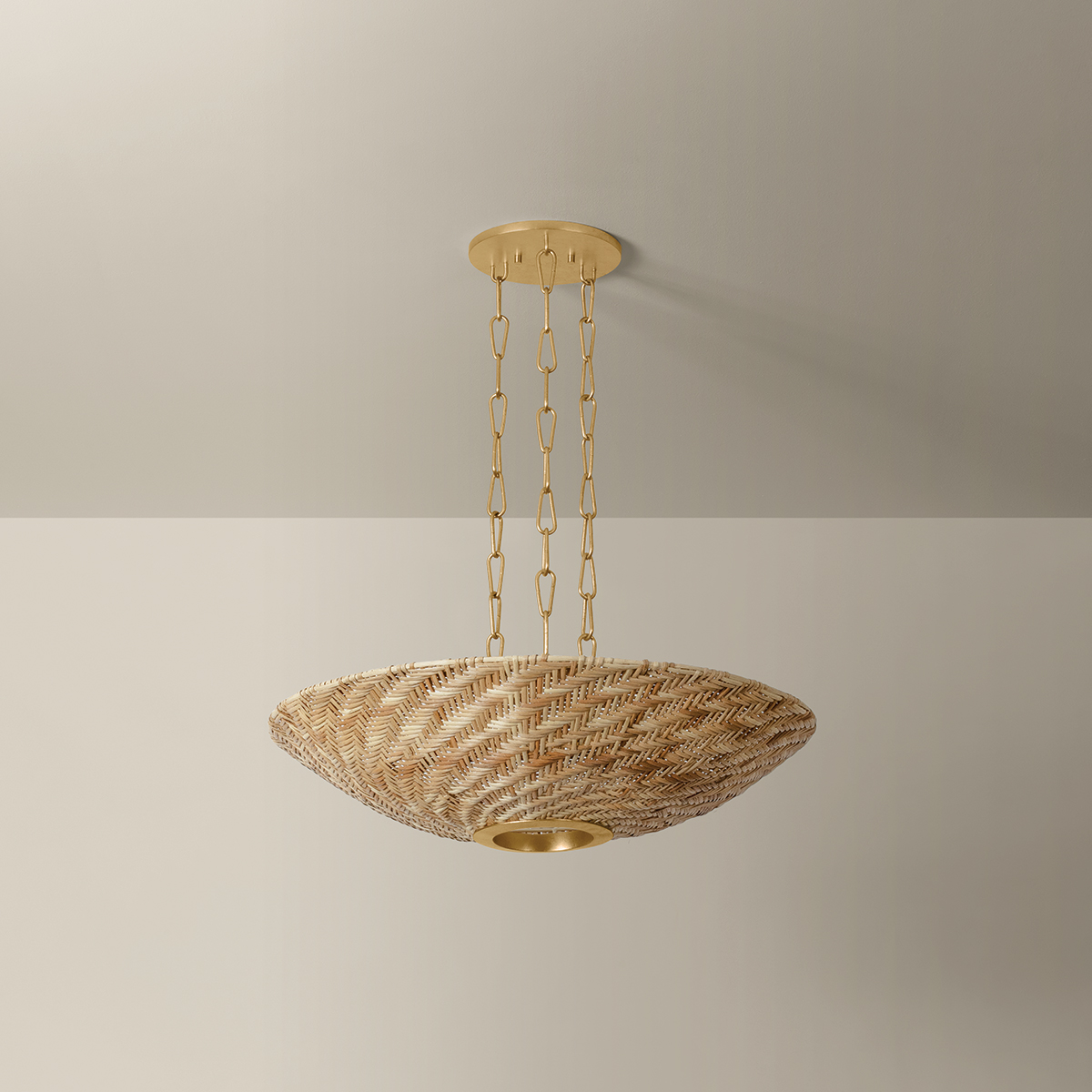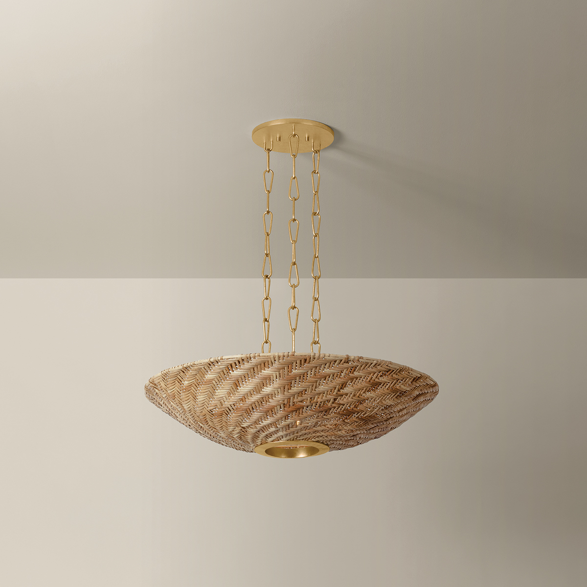 The Ollie family pairs earthy, tactile rattan with Vintage Gold Leaf-finished hardware to create a display of casual elegance. The light natural wicker runs diagonally along the shade's surface, revealing a dynamic moiré effect. Drawing from vintage designs, the airy suspension includes three elongated link chains and a large canopy that matches the scale of the shade. Available as a 3-light pendant and 6-light chandelier with a Vintage Gold Leaf finish.