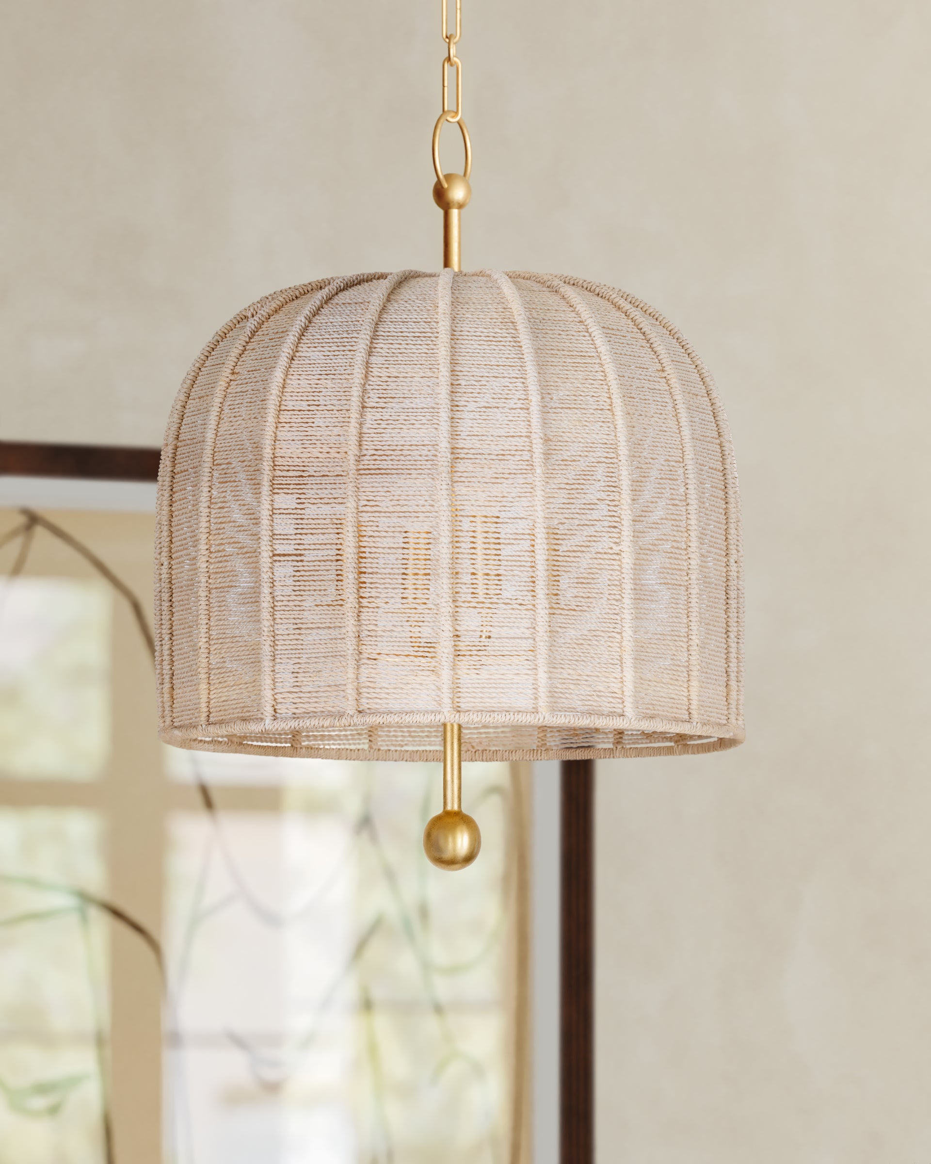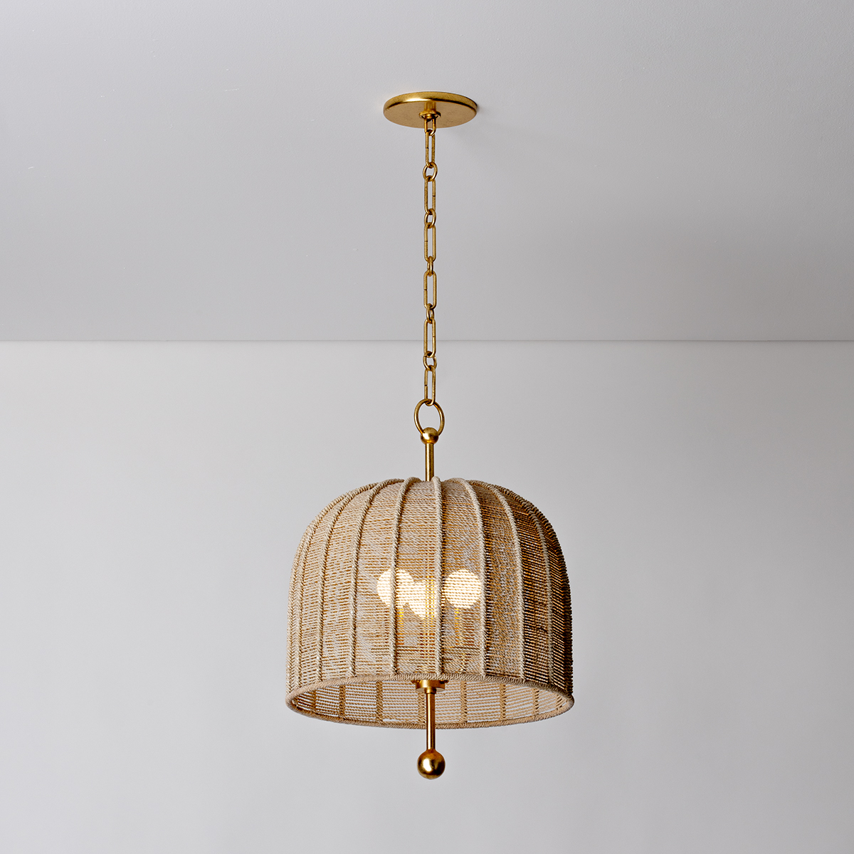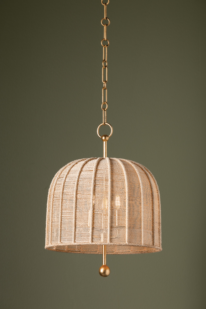 Tipping its cap to designer Hans-Agne Jakobsson, Lonnie rethinks the materiality of his classic umbrella-shaped shade. In this interpretation, the frame of the shade is wrapped in Bleached Abaca rope, allowing light to pass through. As a design detail, the Vintage Gold Leaf stem suspending the shade appears to pierce through the entire fixture, finishing in a decorative sphere. Lonnie is available in two sizes with 3 or 4 lights. *Due to the one-of-a-kind nature of the medium, exact colors and patterns may vary slightly from the image shown.