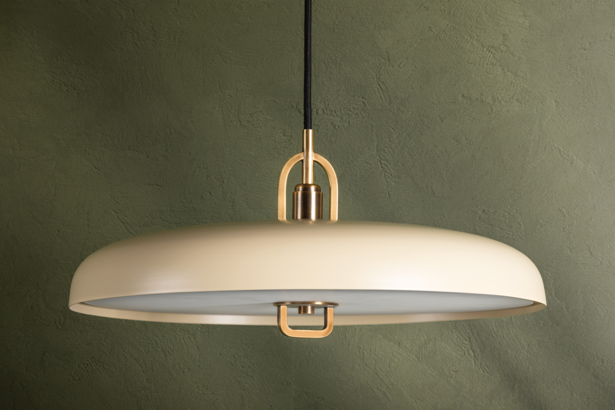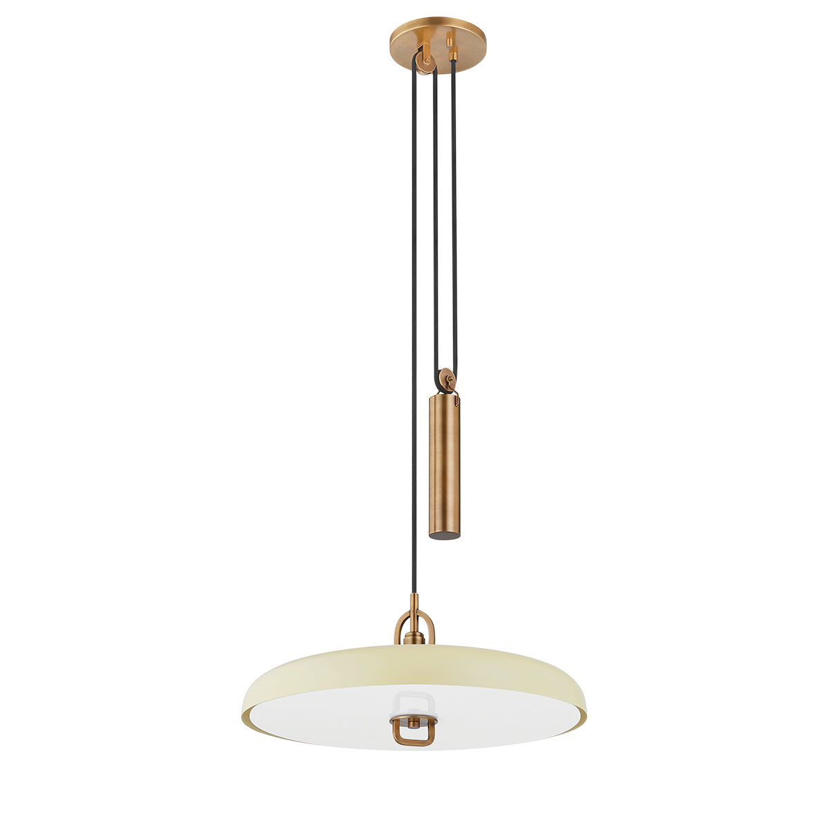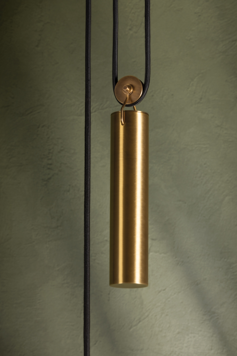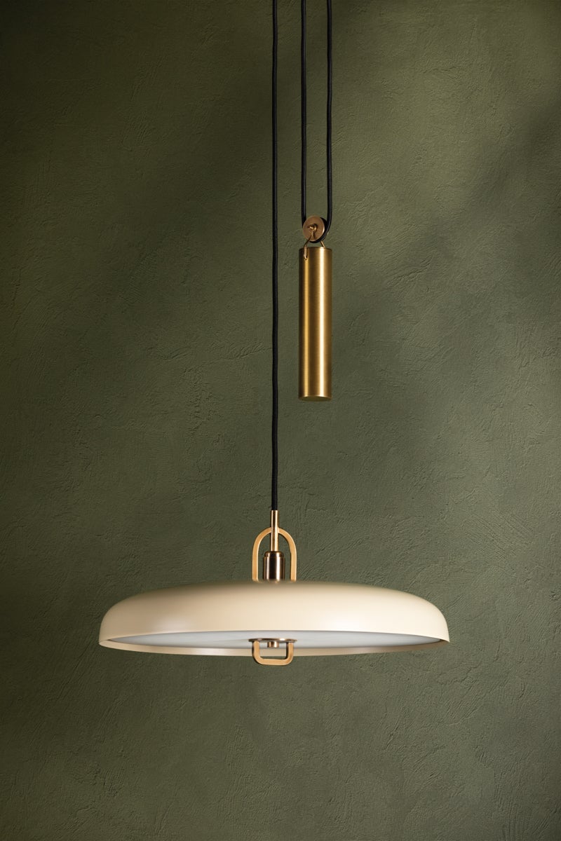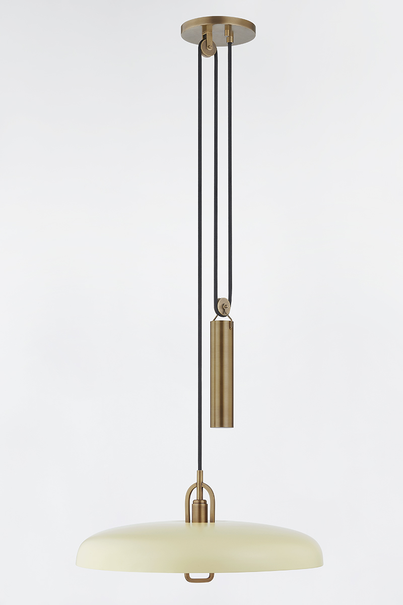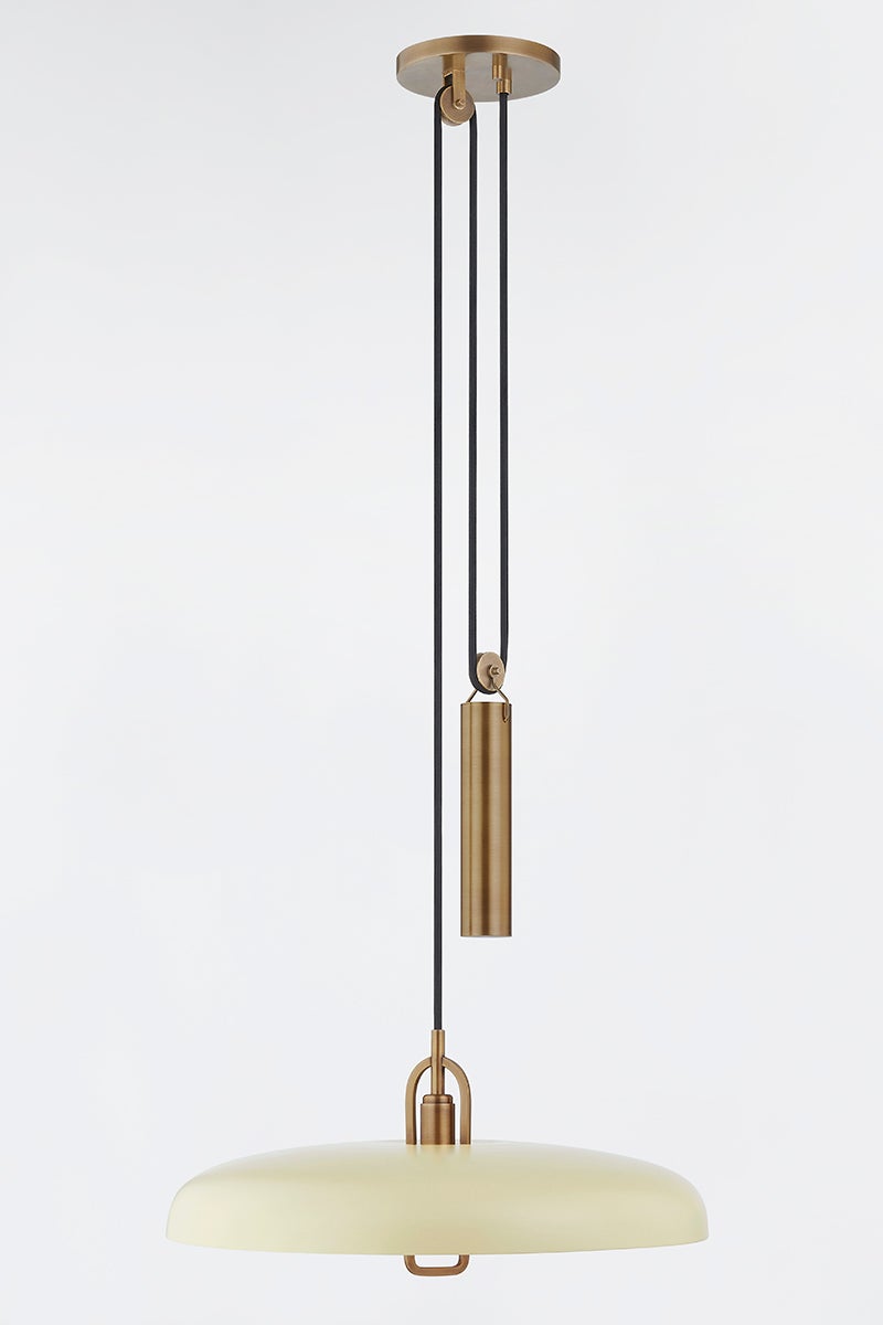 Plummet has a modern look with vintage inspiration. The functional design features a striking Patina Brass weighted pulley that draws the eye and serves a purpose—it allows the height of the pendant to be adjusted. The Soft Black or Soft Sand shade paired with a matte white acrylic diffuser gives the piece a fresh feel that works well with many interior styles. Part of our Lauren Liess collection.