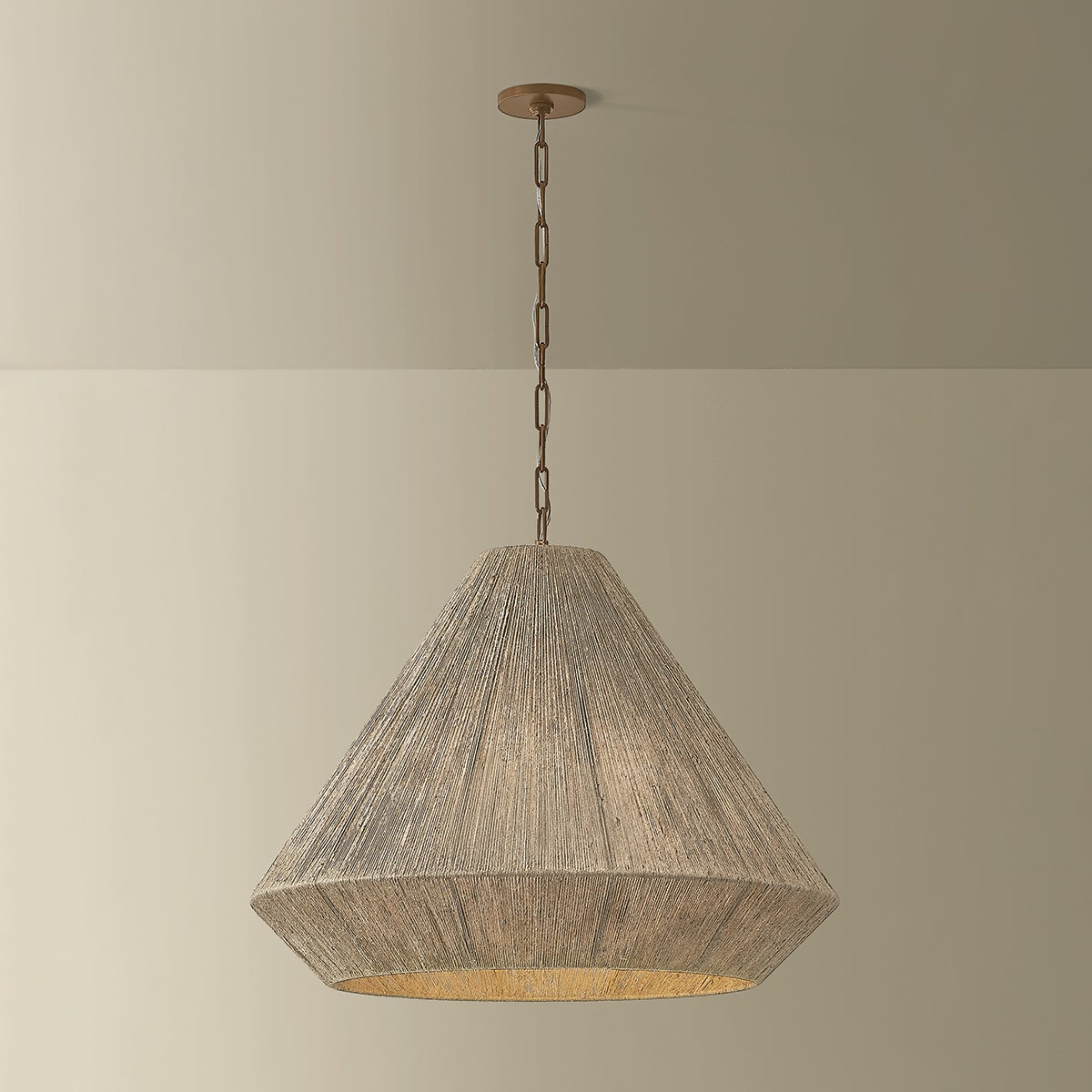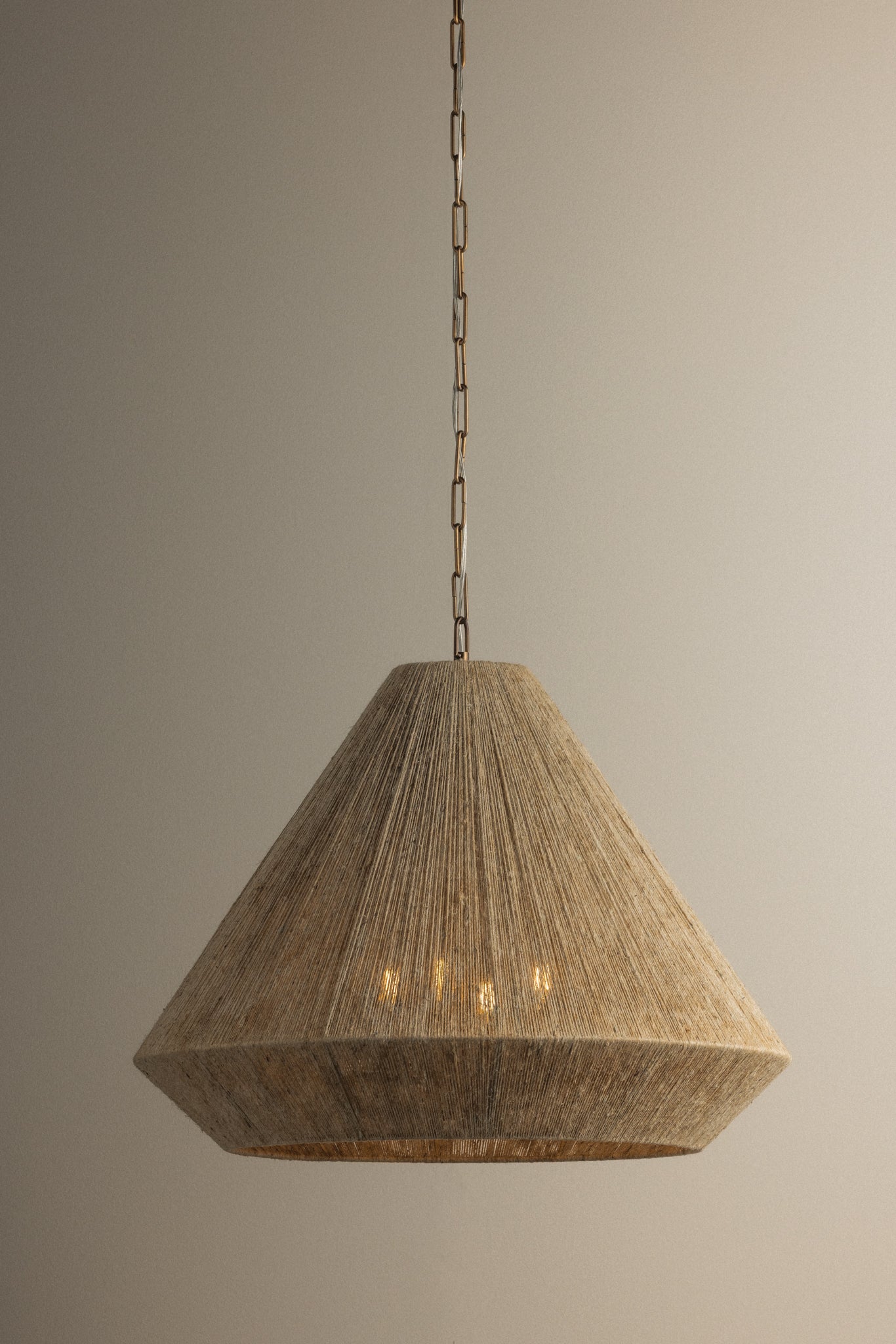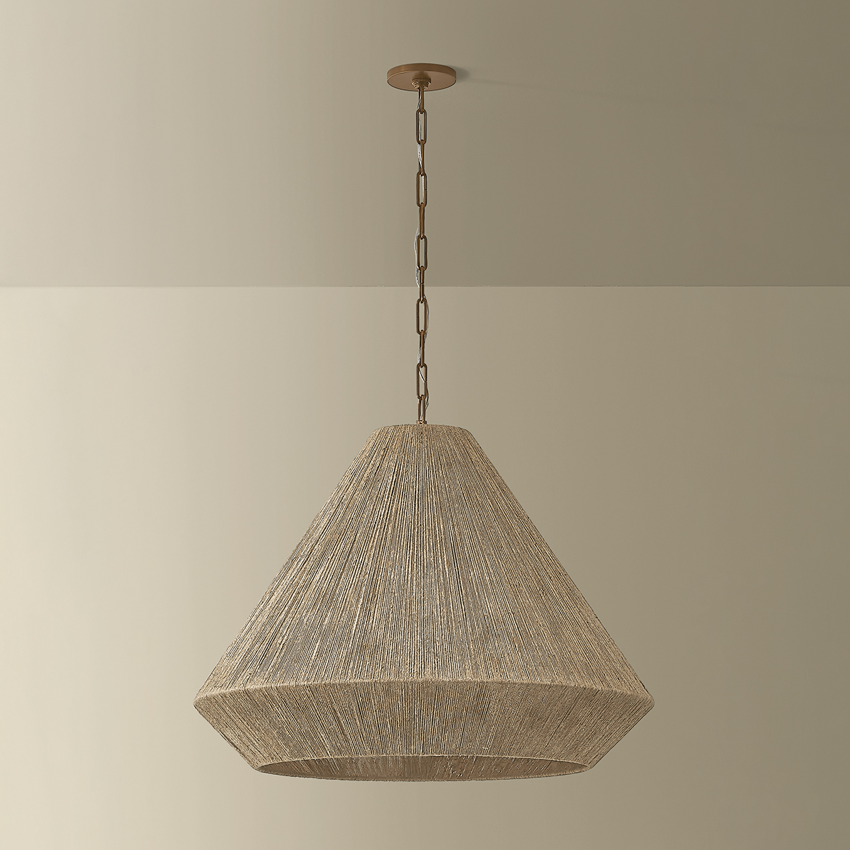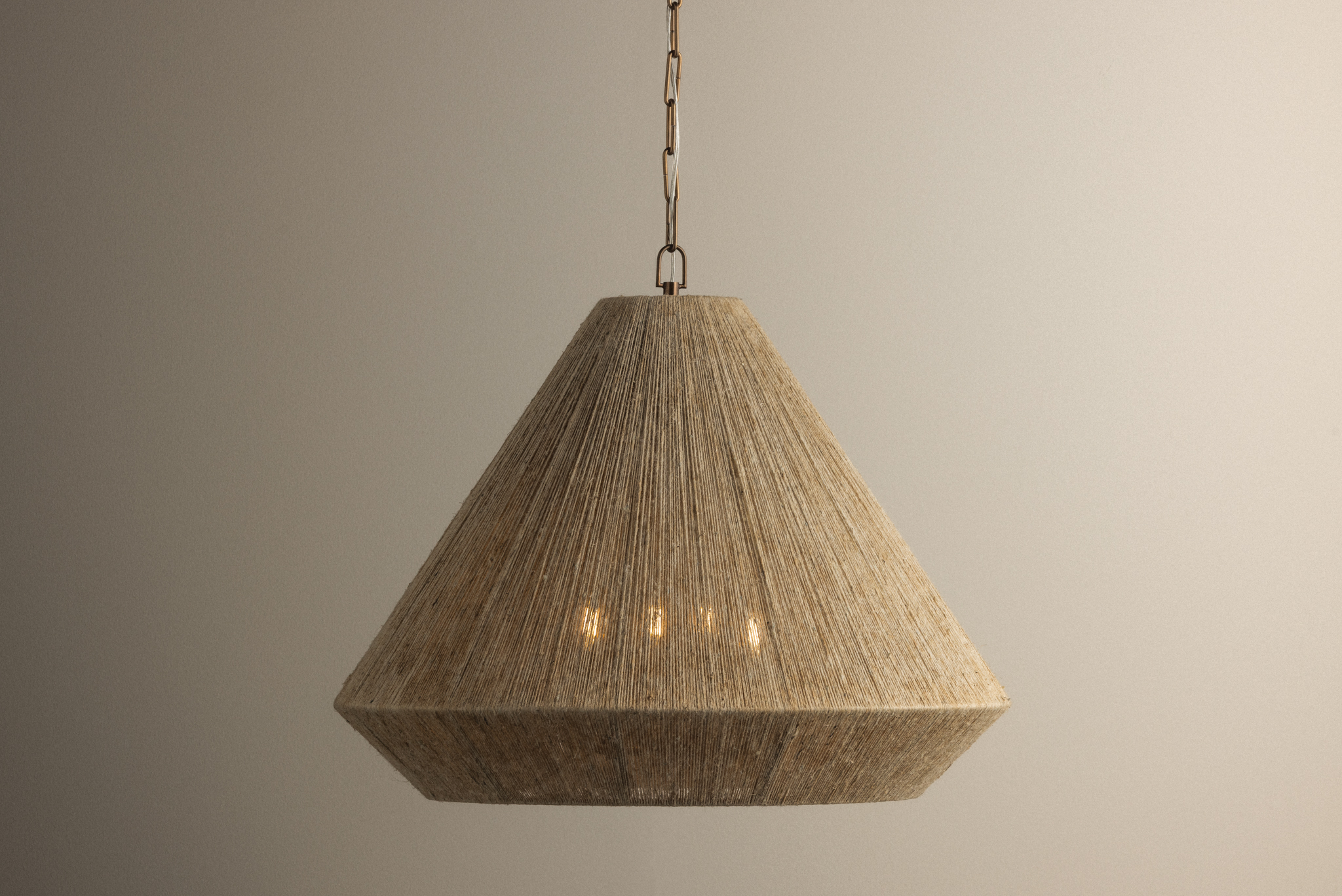 Commanding attention, the Keats pendant features a generous scale and tailored use of natural materials. A central candle cluster fills the conical shade with a warm glow, accentuating the beauty of the woven jute. Keats is available in two sizes and two material combinations: Patina Brass with natural bleached jute for a light, organic feel, or Bronze with black jute for a bolder contrast.