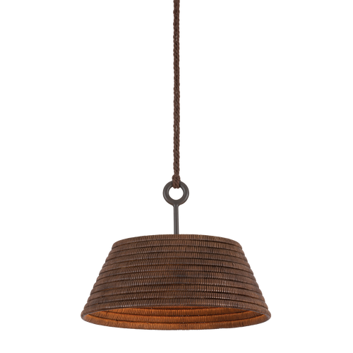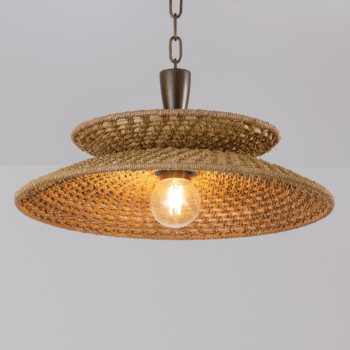 Two shallow shades are stacked in opposite directions to create the balanced artistry of this coastal pendant. The open weave of the natural abaca fiber shades allows light to filter through both sides, producing a dramatic visual effect. For the finishing touch, Landry dangles from a chunky vintage Gold Leaf chain. Available in two sizes.