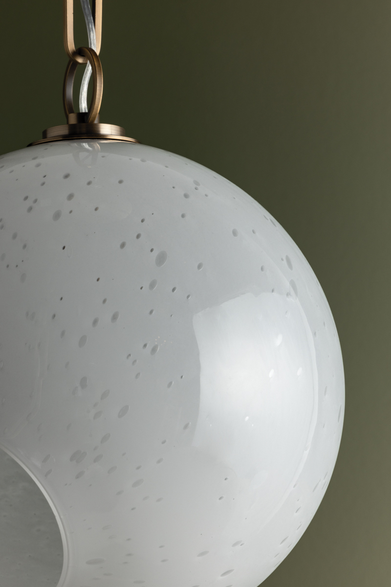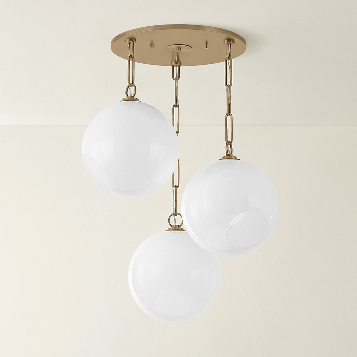 The Bramble pendant features an asymmetrical design with clear seedy cloud glass globes intentionally suspended off-axis. The unique orientation of each shade directs light outward while adding a dynamic, sculptural quality to the composition. Bramble is available in 3 or 5-light configurations with a Patina Brass finish on the frame.