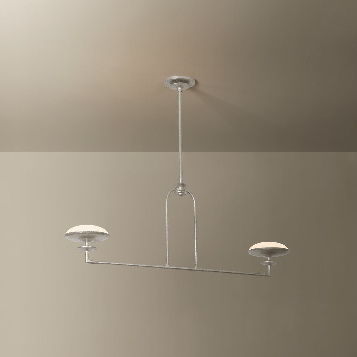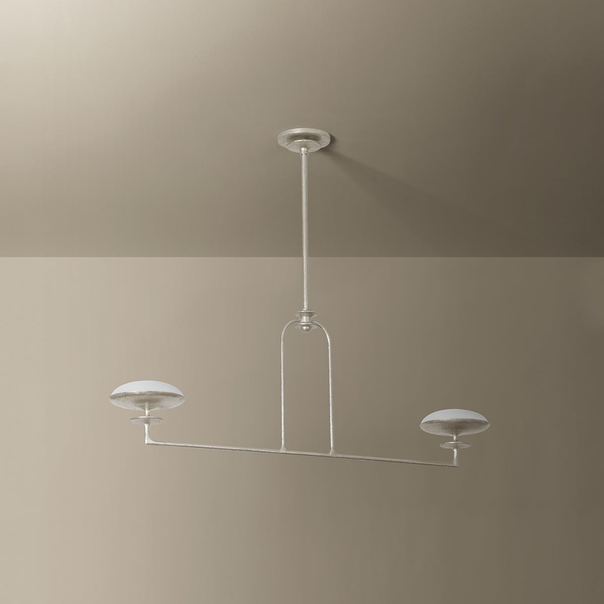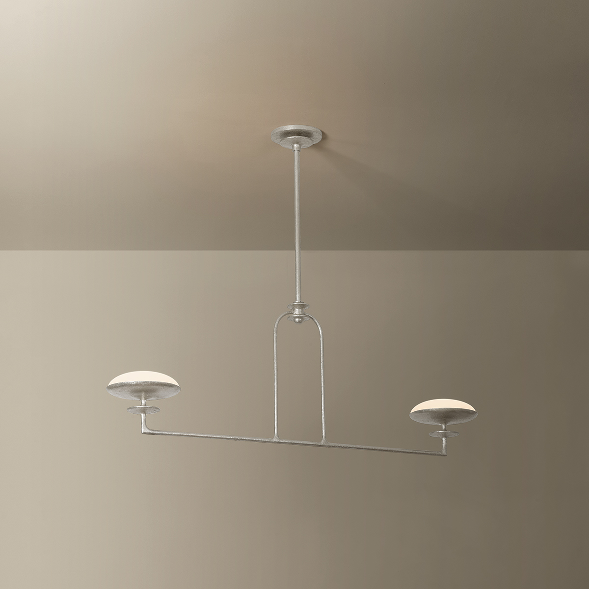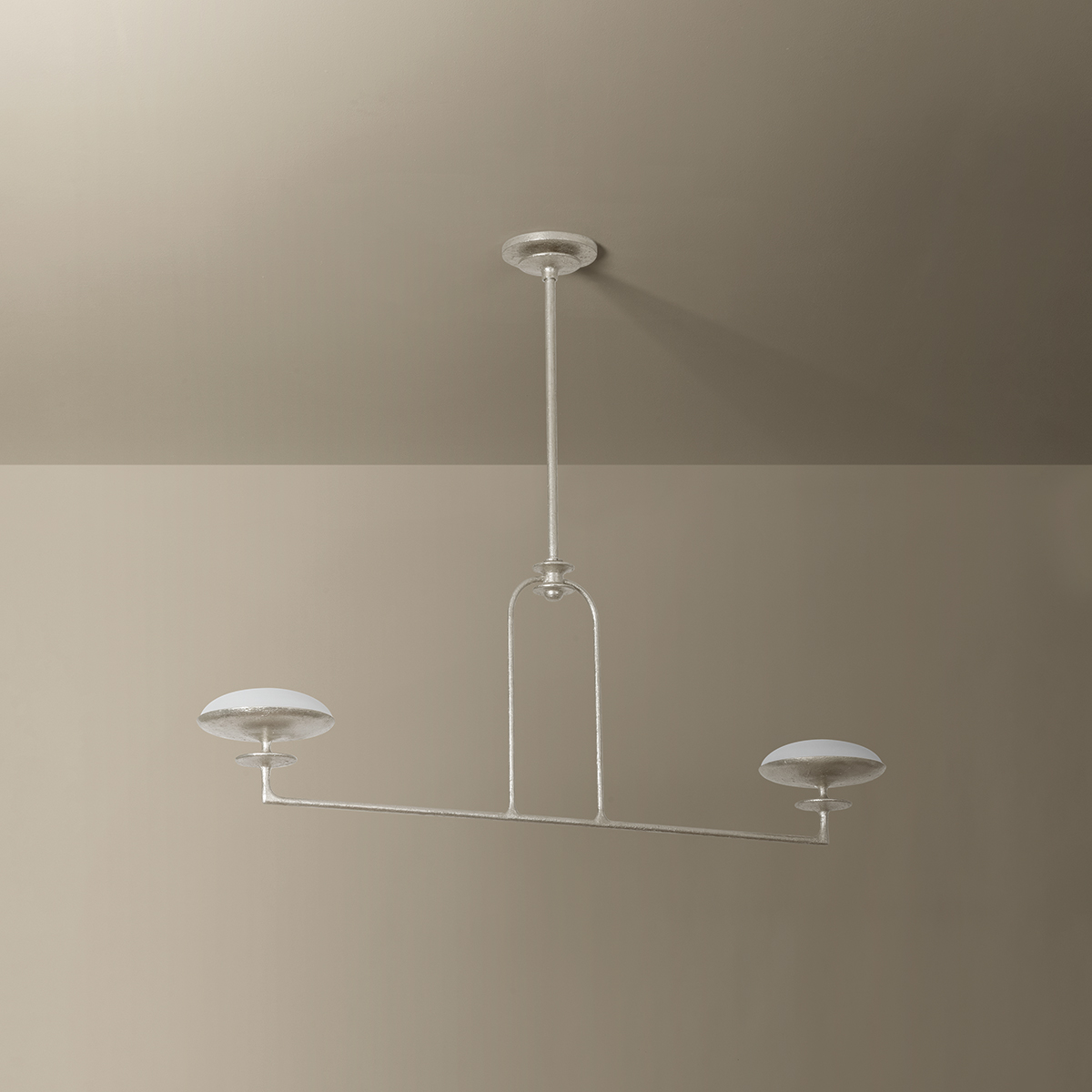 The Pacific family responds to the need for uncomplicated, yet sculptural chandeliers in contemporary interiors. A handcrafted Warm Silver Leaf finish adds texture to the geometric shapes, architectural arches, and decorative bobeches while the etched matte glass shades provide a soft diffusion of light. Available as a 1-light wall sconce, 2-light linear, and 3 or 4-light chandelier, Pacific creates a stunning focal point in any space.