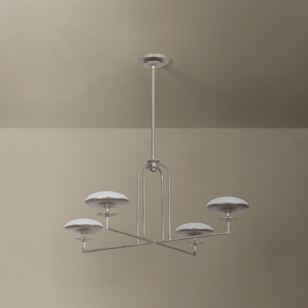 The Pacific family responds to the need for uncomplicated, yet sculptural chandeliers in contemporary interiors. A handcrafted Warm Silver Leaf finish adds texture to the geometric shapes, architectural arches, and decorative bobeches while the etched matte glass shades provide a soft diffusion of light. Available as a 1-light wall sconce, 2-light linear, and 3 or 4-light chandelier, Pacific creates a stunning focal point in any space.