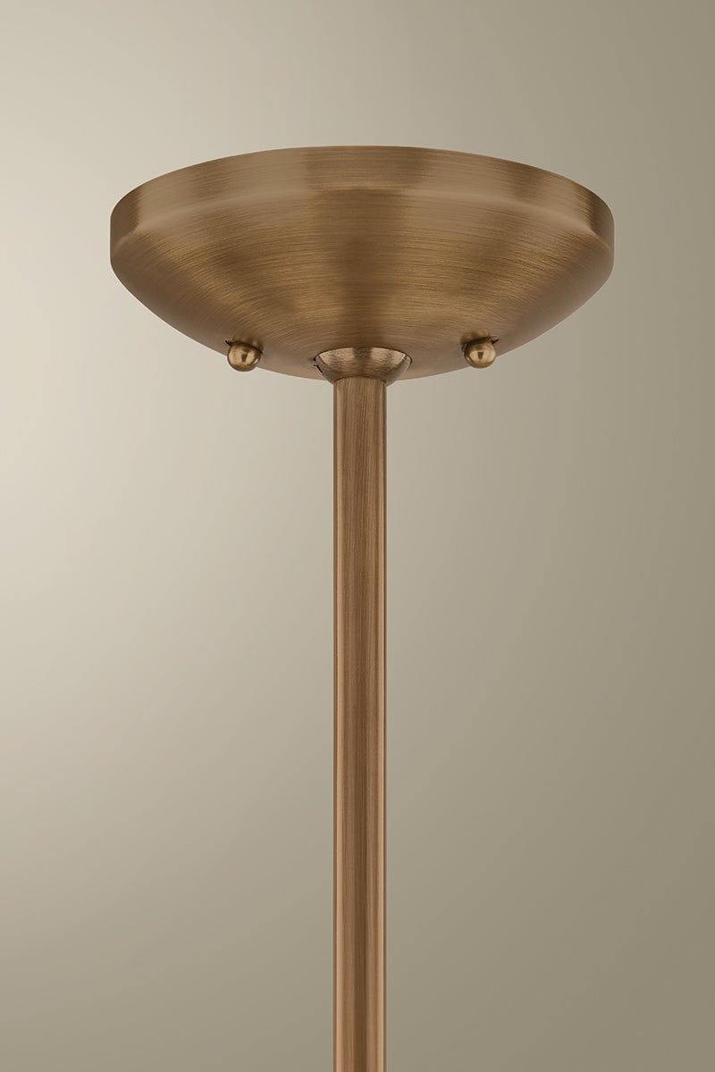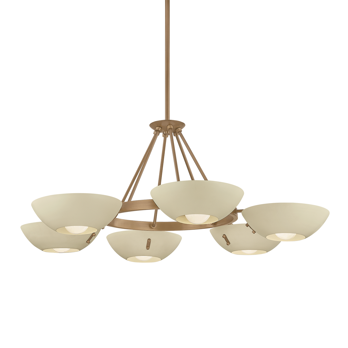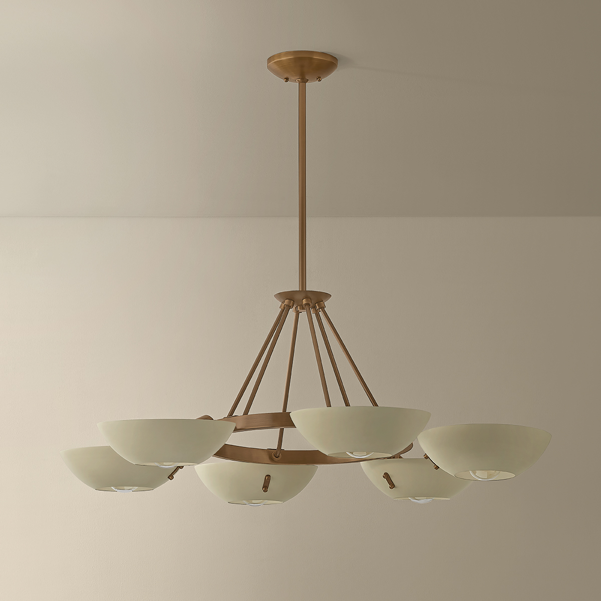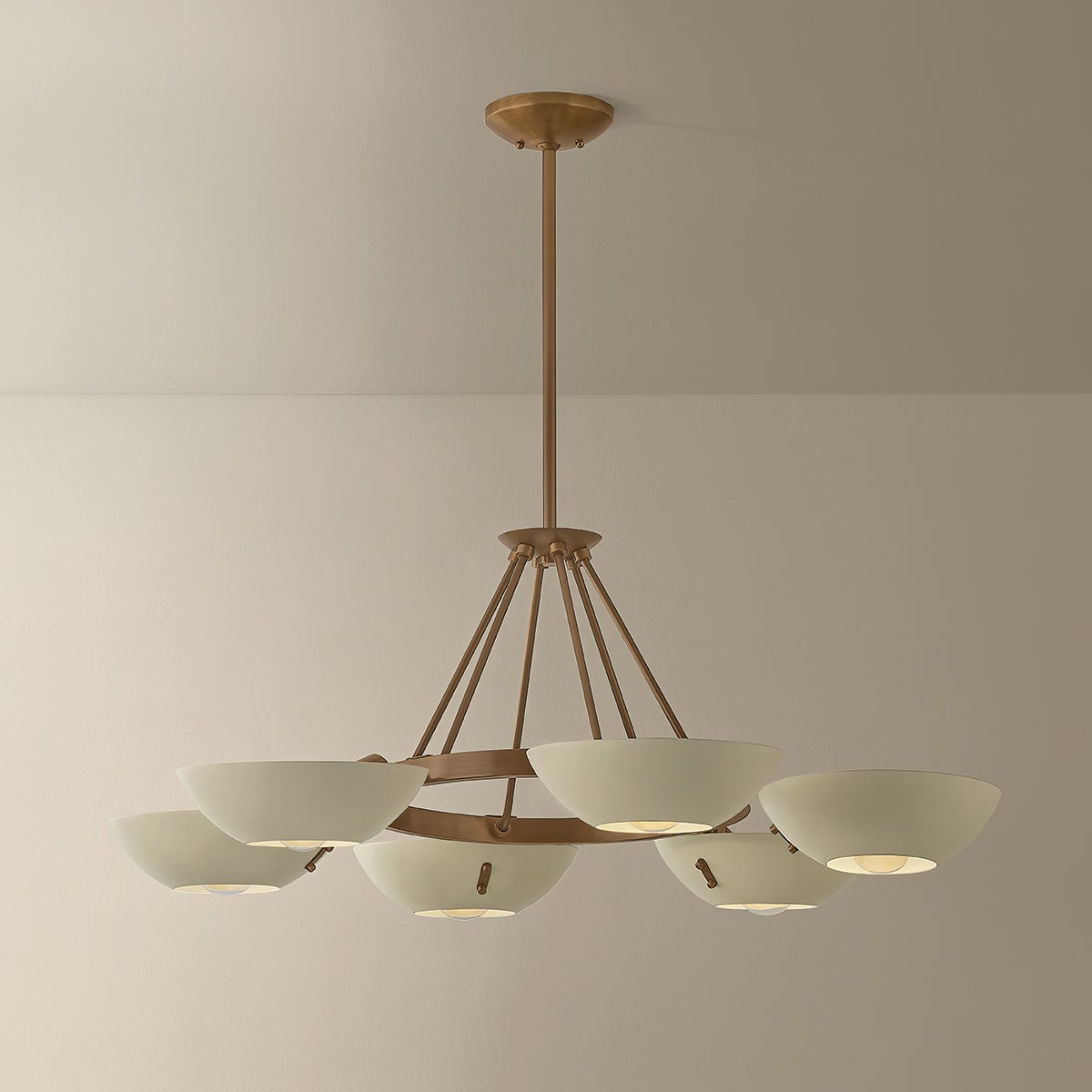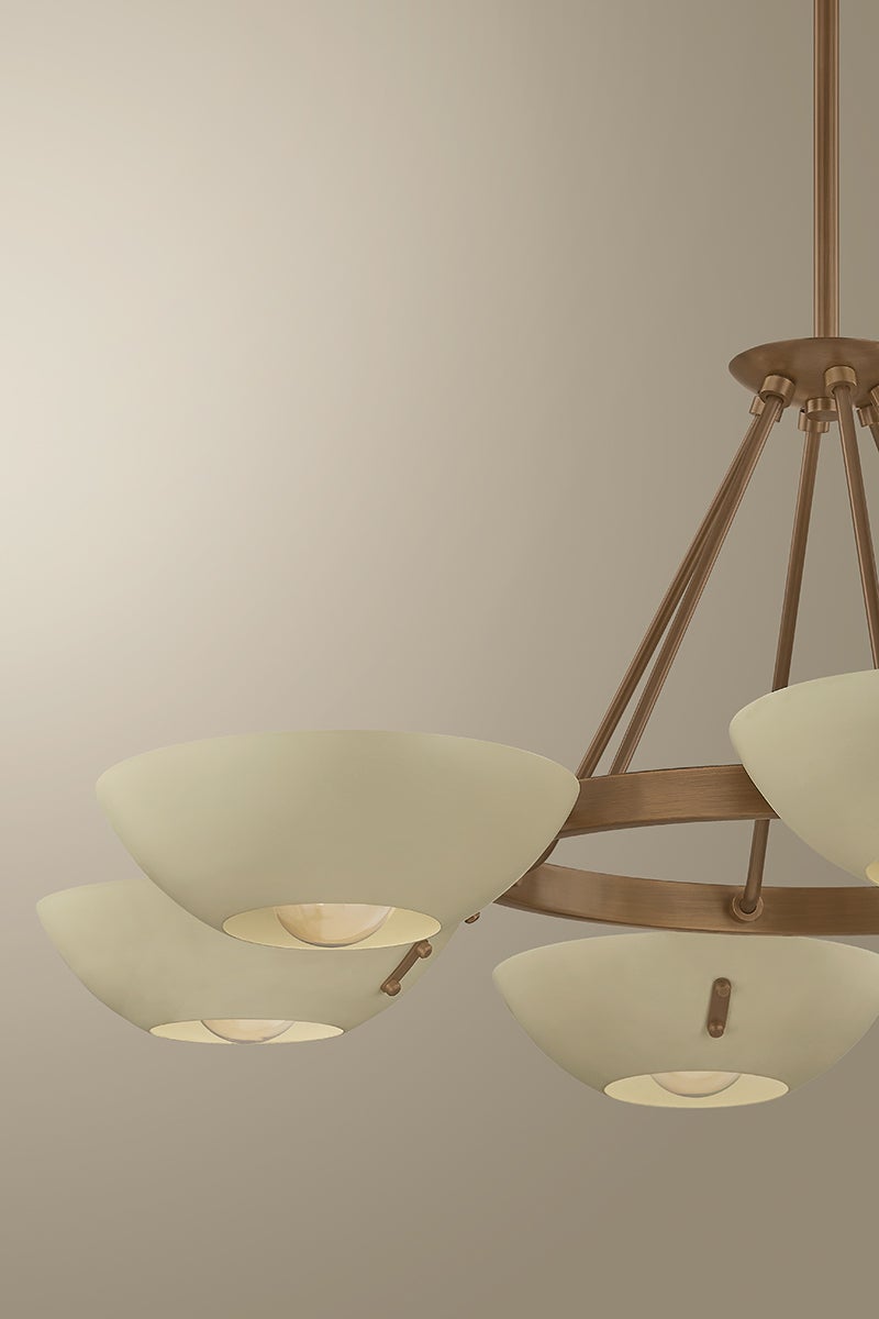 Channeling the spirit of vintage Stilnovo designs, the Alturas chandelier transforms industrial geometry into an artful sensation. A constellation of Soft Sand bowl shades orbit a Patina Brass ring. The clean symmetry provides a striking focal point for living spaces or entryways. Available in two sizes with either 6 or 9 lights.